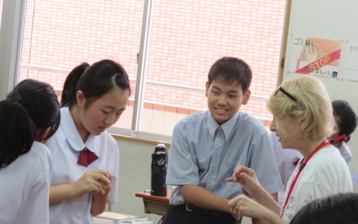 今日は英会話の授業の様子です。火曜日には、全学年英会話の授業が行われています。各クラス、2つに分かれ、少人数での授業が行われています。英会話の授業では、ALTの先生と英語の教員がそれぞれ一人ずつついています。たくさん英語