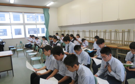 今日は年間スローガン&テーマを決めを行いました。生徒会役員のメンバーがそれぞれのクラスで説明を行い、その後、今回のテーマを考えました。漢字に込めた思いや、今後どのような学校にしたいかを一人一人が考えました。今年のスローガ
