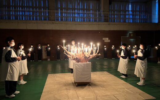 夕食の様子です。たくさん活動したあとでお腹がぺこぺこだった様子です。おかわりをしている生徒が見られました。 キャンドルファイヤーの様子です。営火長より、「友情の火を灯そう」と言葉がありました。幻想的な儀式の中で、友人