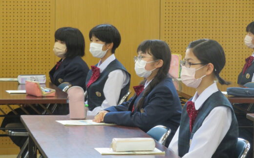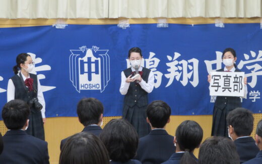 本日、生徒会主催のファミリー対面式と部活動紹介を行いました。ファミリー活動における目的を土肥校長先生よりお話していただきました。 J1生への挨拶は、J3-A篠原李和子さん。 1生からJ2・J3生への挨拶を、J1-B三重