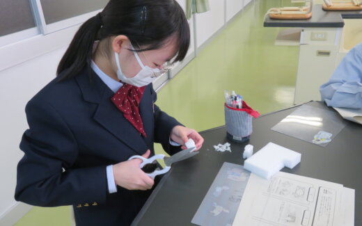 本校では、授業開始1分前に黙想をします。黙想をすることで、心を落ち着かせ、学習する態勢へと切り替えます。休み時間と授業とのメリハリをつけて、授業の質を高められるように、取り組んでいます。 生徒たちは、毎回の授業の中で