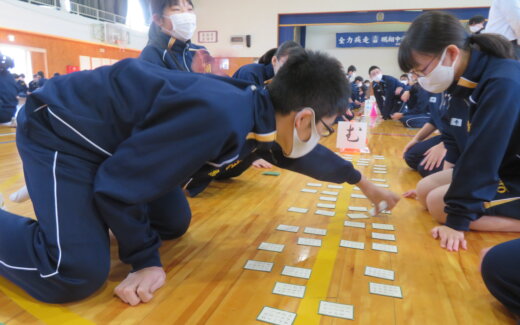 今日は百人一首大会を行いました。午後からはファミリーマッチも行われ、とても盛り上がりました。今日は午前中の百人一首大会の様子をお届けします。百人一首大会は、文化委員会を中心に準備・運営をしています。 試合開始ぎりぎり