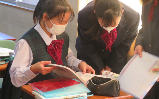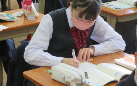 第4回定期考査3日目です。J1・J2生は、理科・音楽・英G。J3生は、物理・化学・音楽・英Gが行われました。午後は、自学自習の時間になります。各々自分でまとめたノートや、教科書、問題集を机いっぱいに広げ、学習しています