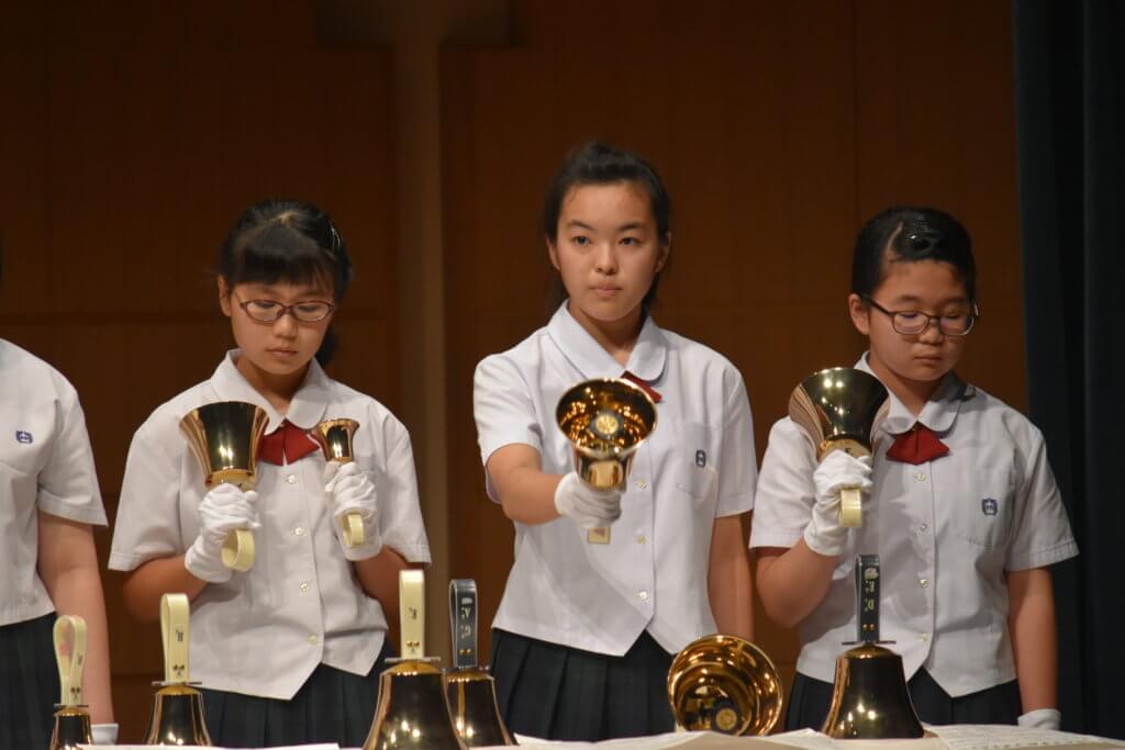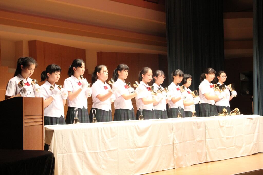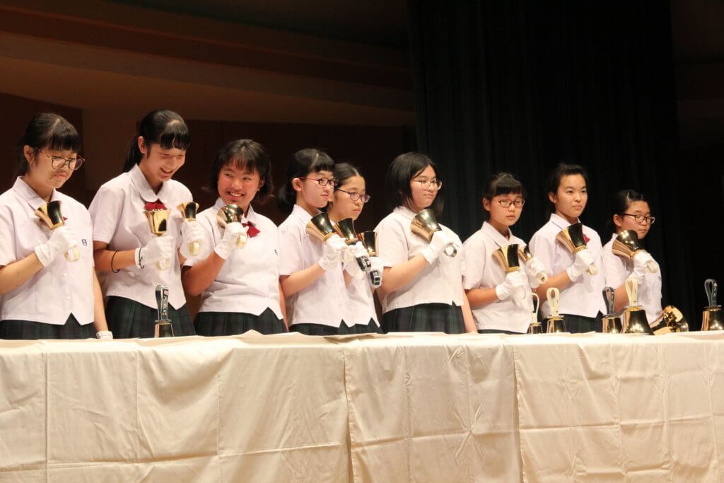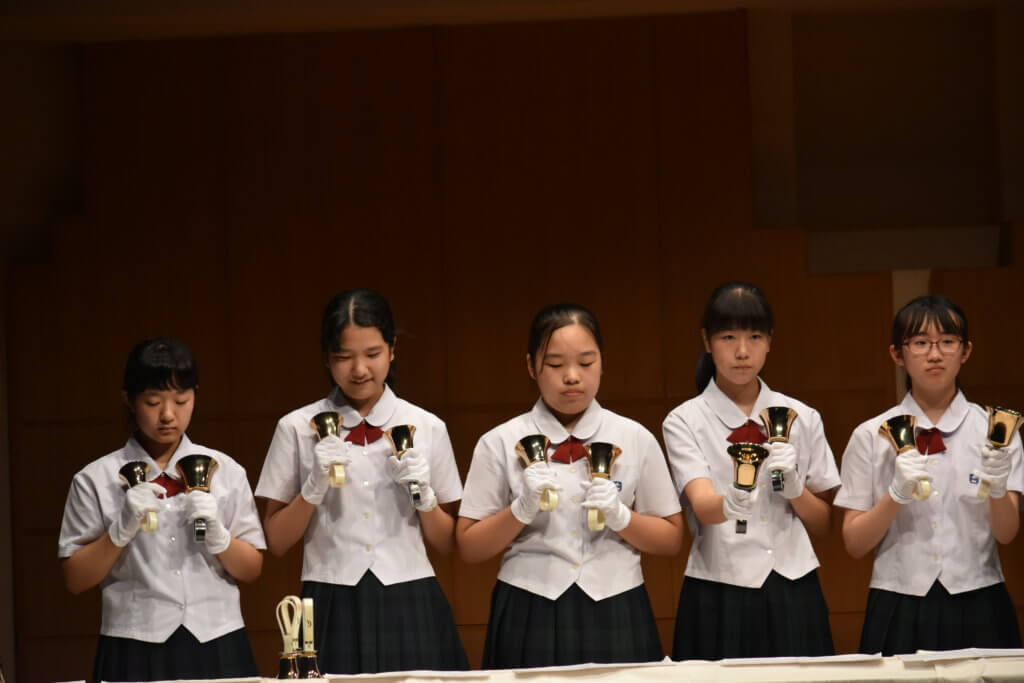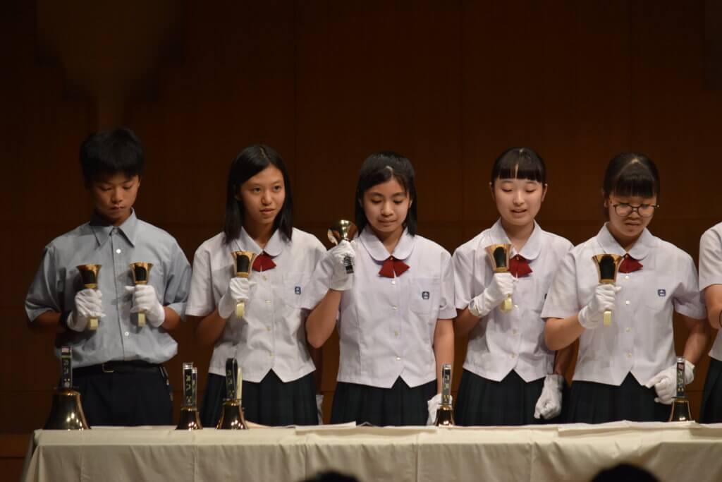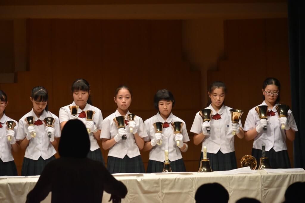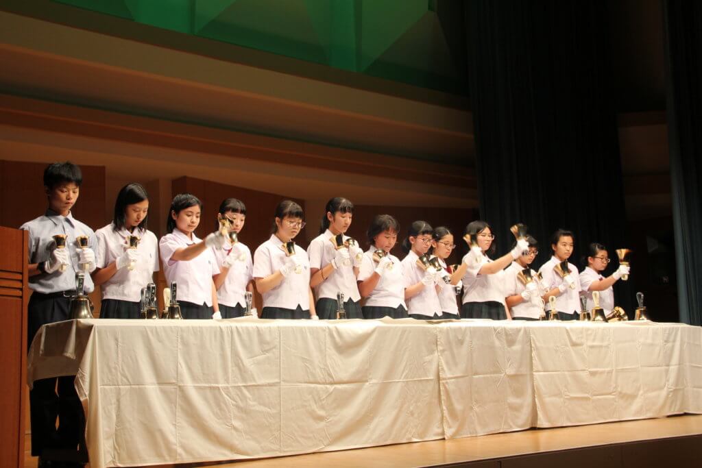 午後は個人発表会。意見文発表や、楽器の演奏が行われます。オープニングはハンドベル部による演奏。