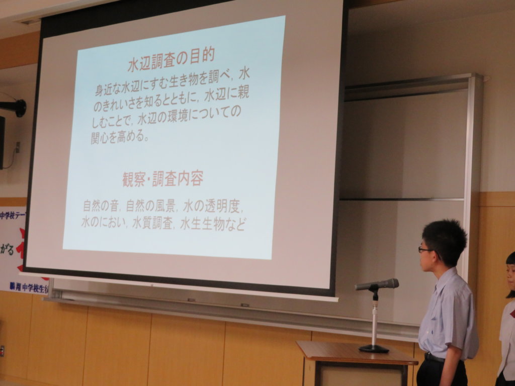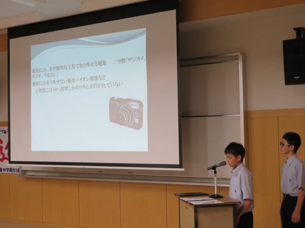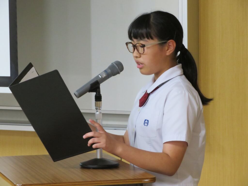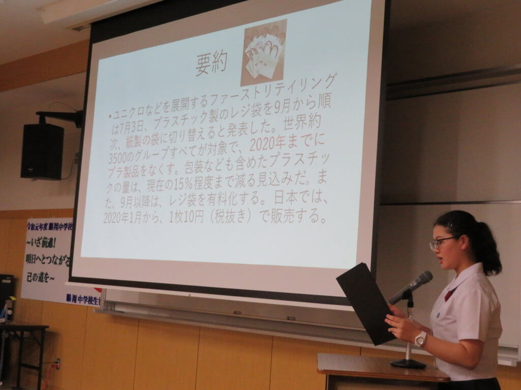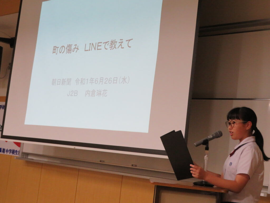 まずは、NIEの発表です。鵬翔中学校では、「教育に新聞を」ということで活動を行っています。本日は、代表して6組の生徒が発表してくれました。