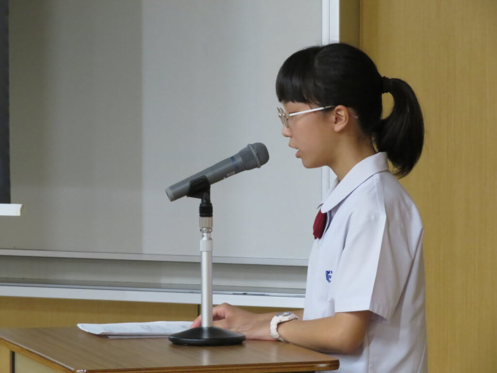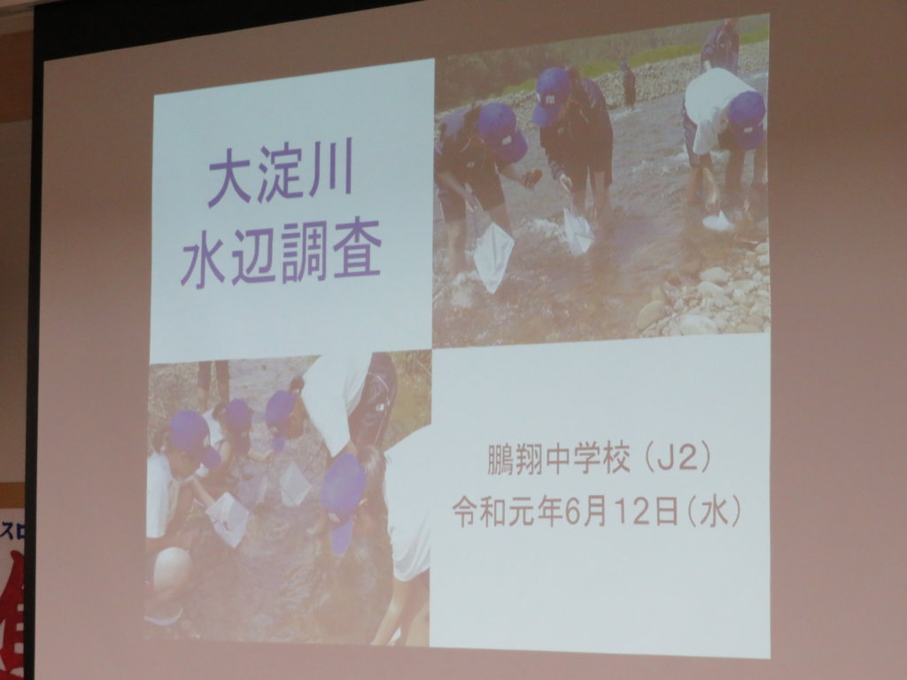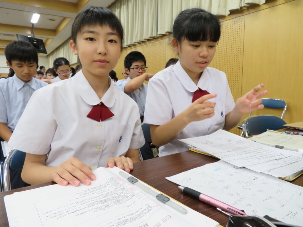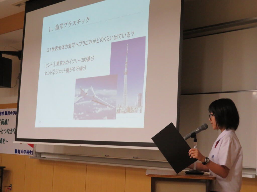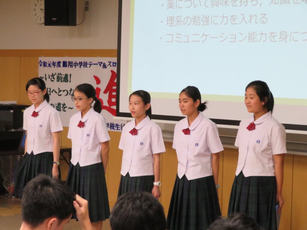 まずは、NIEの発表です。鵬翔中学校では、「教育に新聞を」ということで活動を行っています。本日は、代表して6組の生徒が発表してくれました。