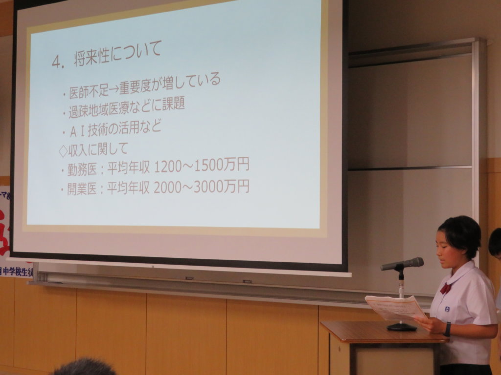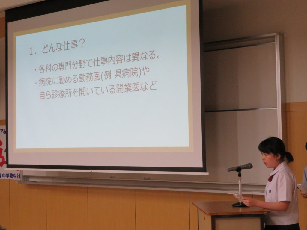 J1の発表は職業調べについてです。薬剤師・弁護士・医師について発表してくれました。