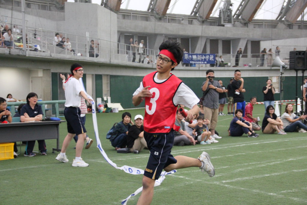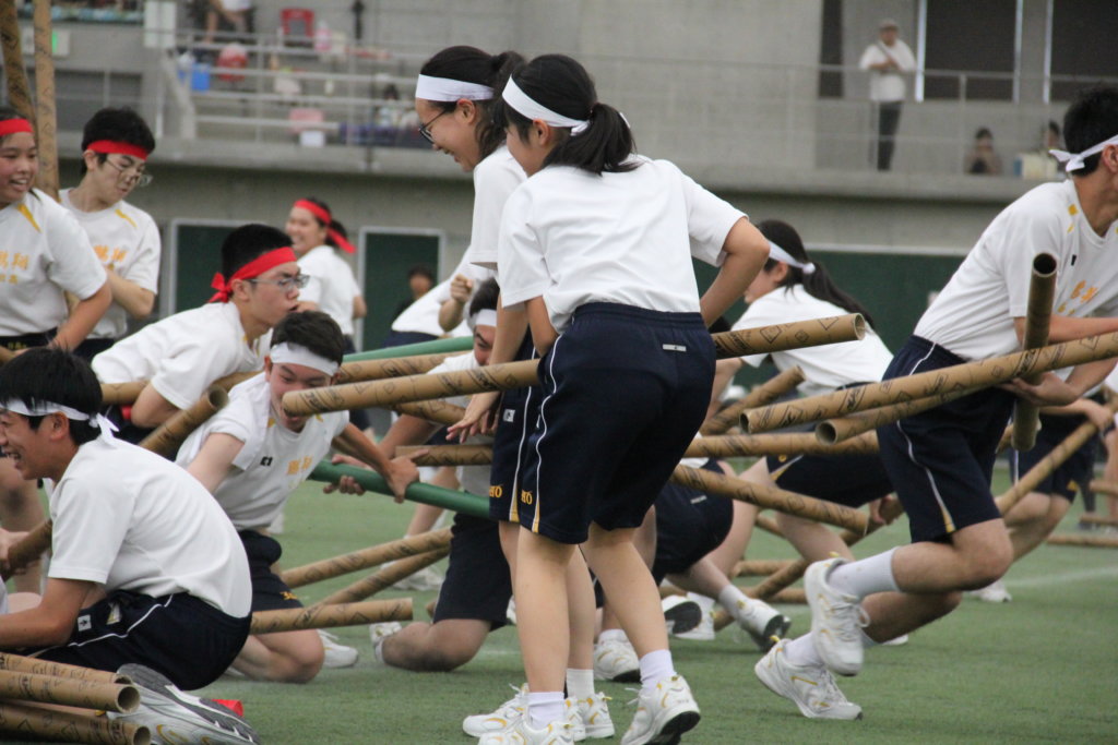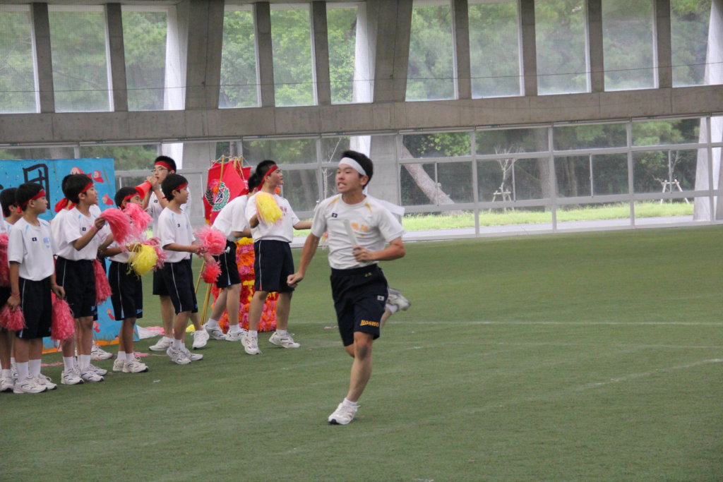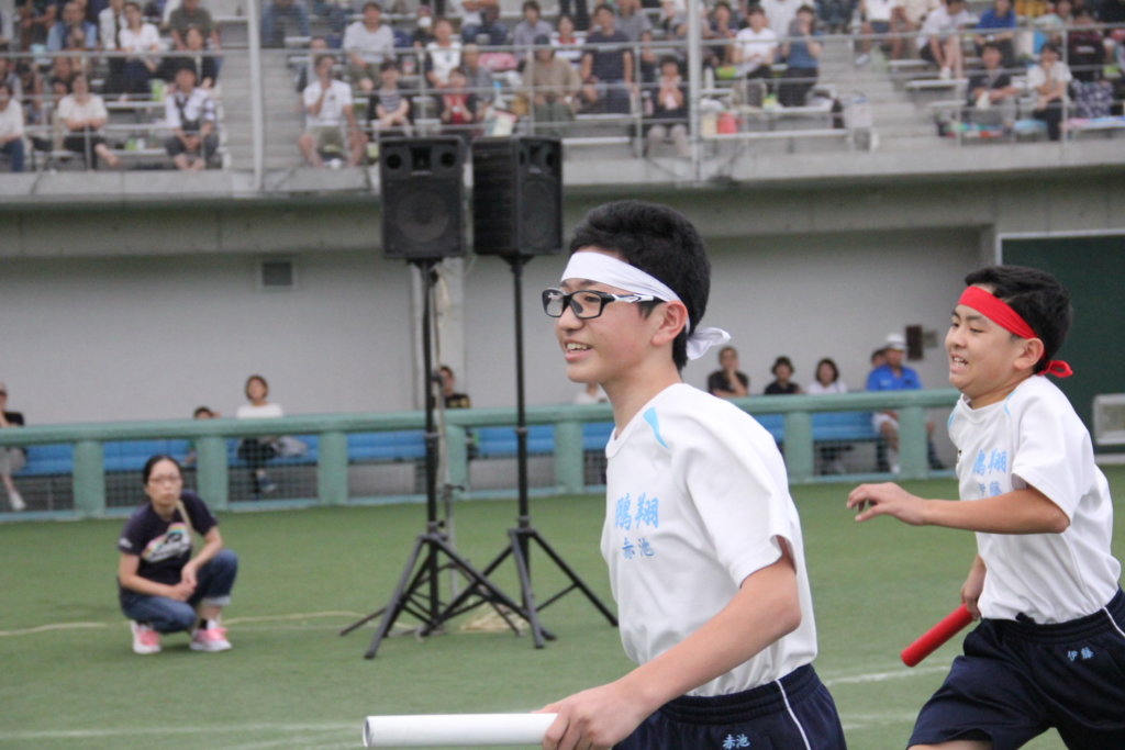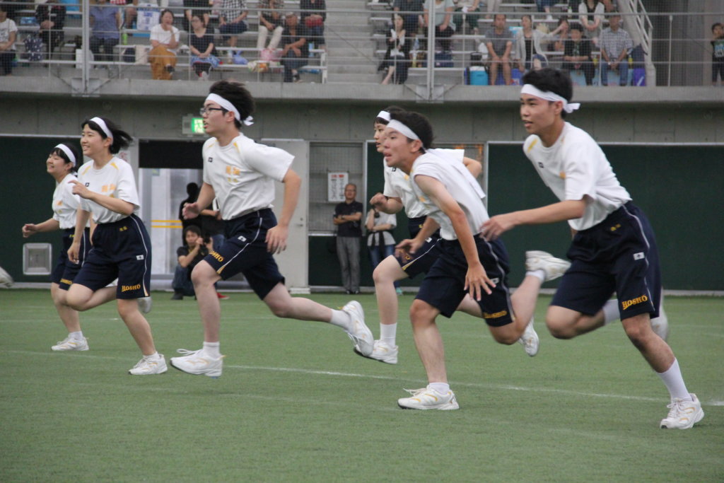 体育大会の午後の部は、1年生のリレーや2年生の団技、3年生の徒走などが行われました。