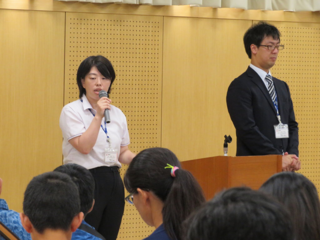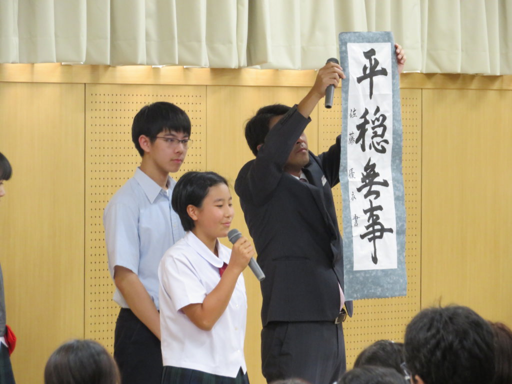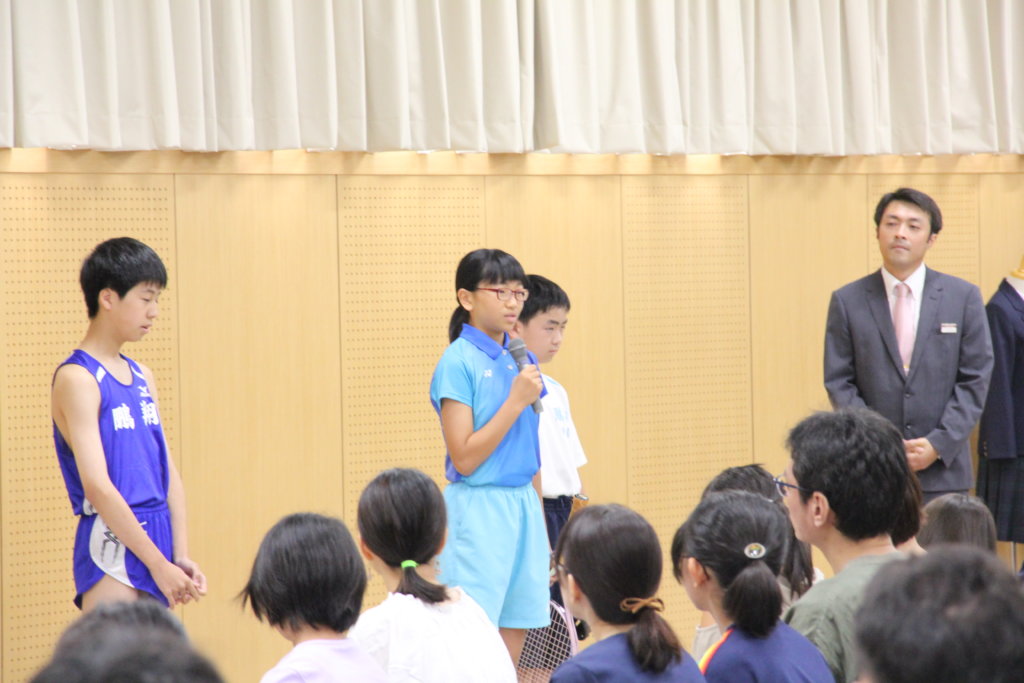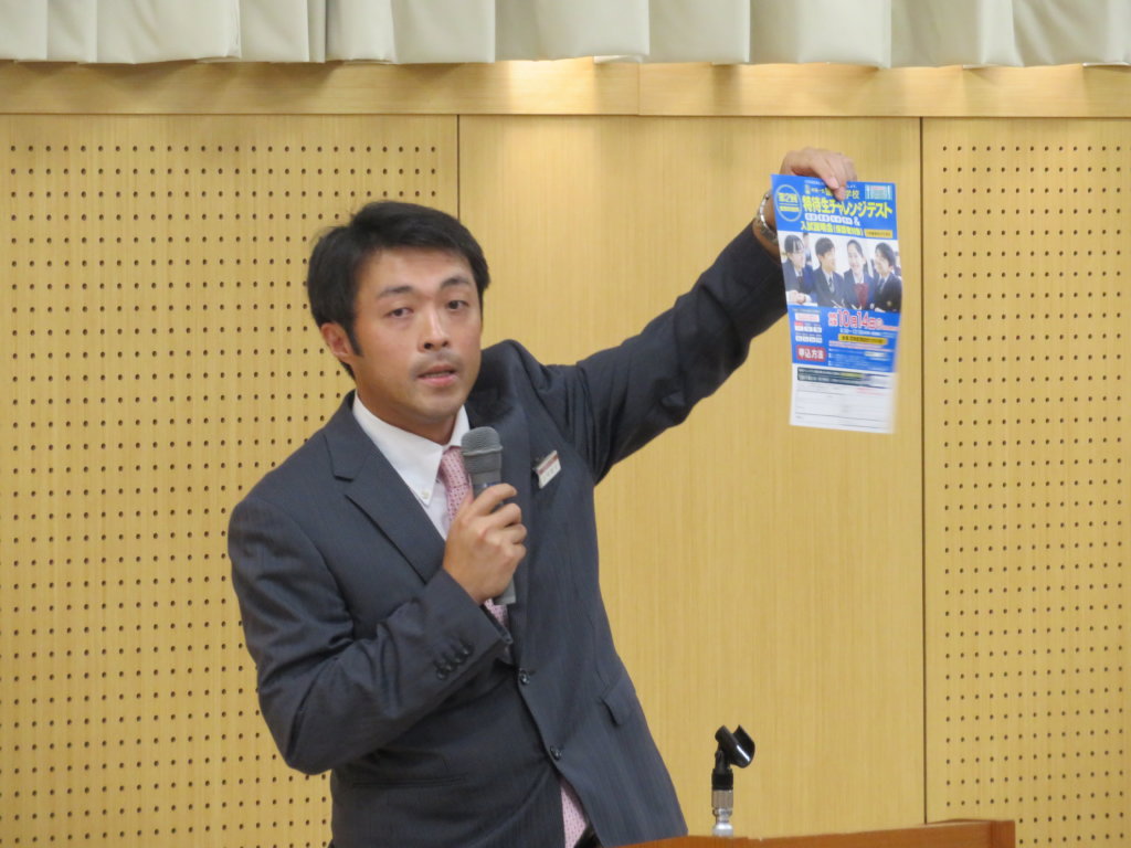 本日は学校説明会と公開授業の2部構成。1部目は、川﨑基宏校長先生が挨拶を行った後、部活動紹介、ALT紹介を行い、10月14日(月・祝)に行う「特待生チャレンジテスト」の出題方針説明と本年度入試概要説明を実施しました。