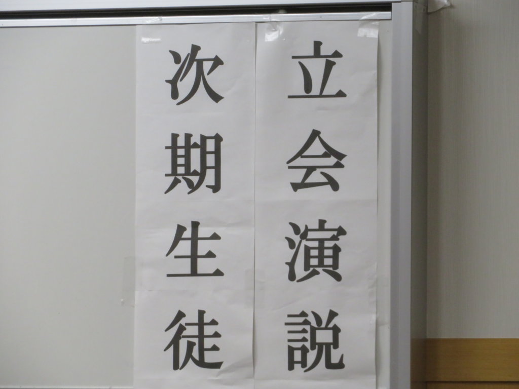 今選挙は、次期生徒会役員を決める選挙であり、1・2年生の各クラスより選出された立候補者が限られた時間内で、どんな学校にしたいかを全校生徒に伝える場です。