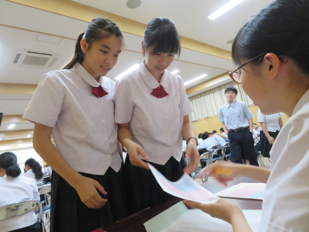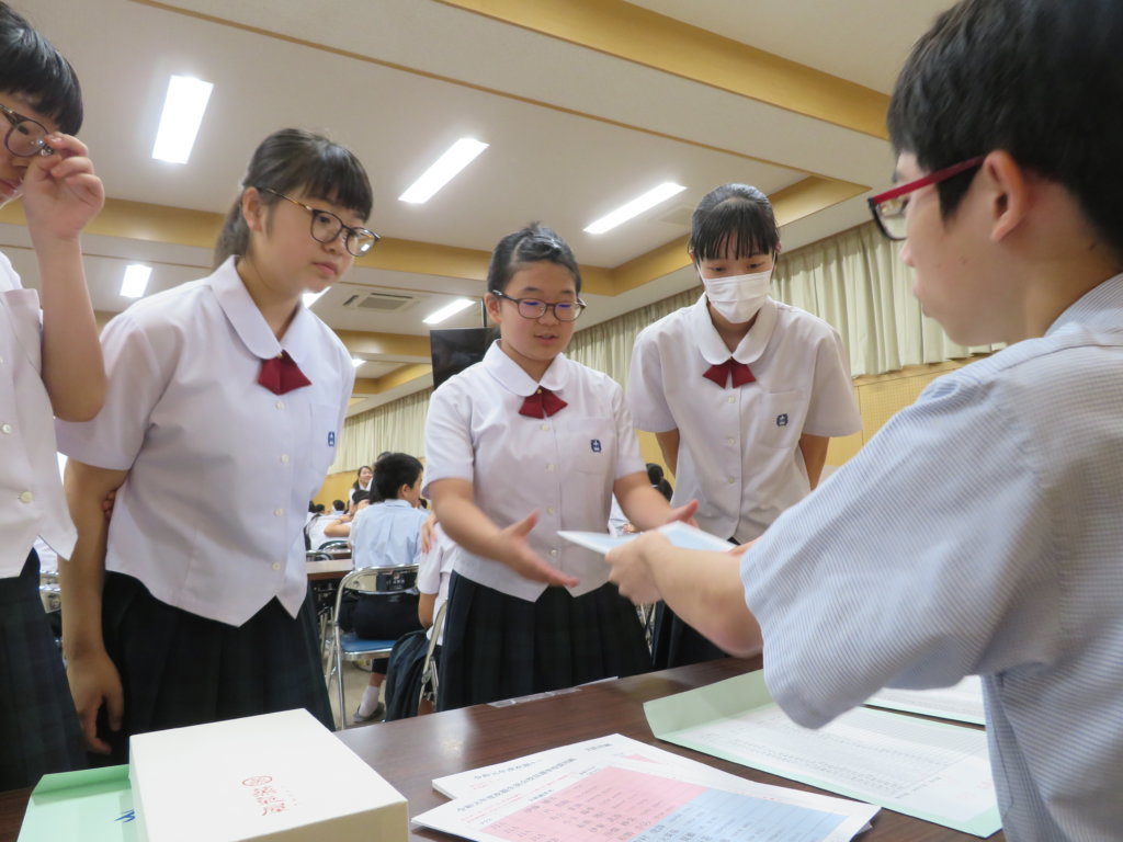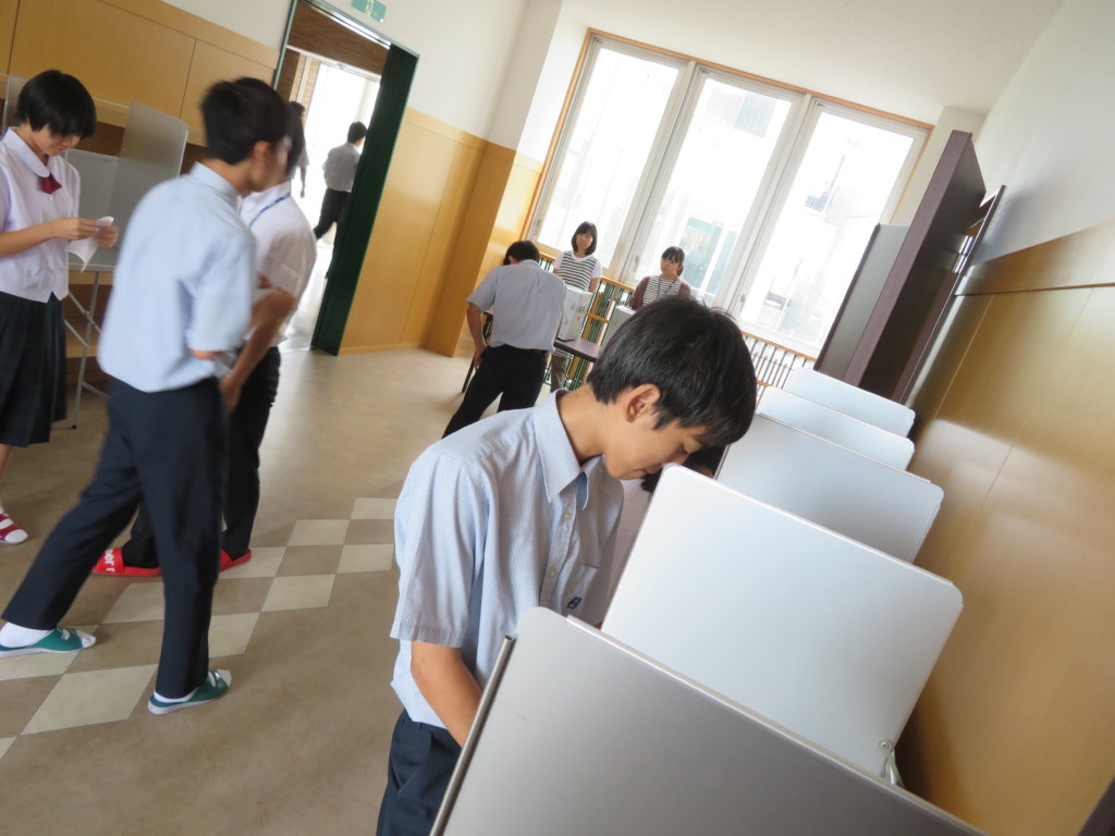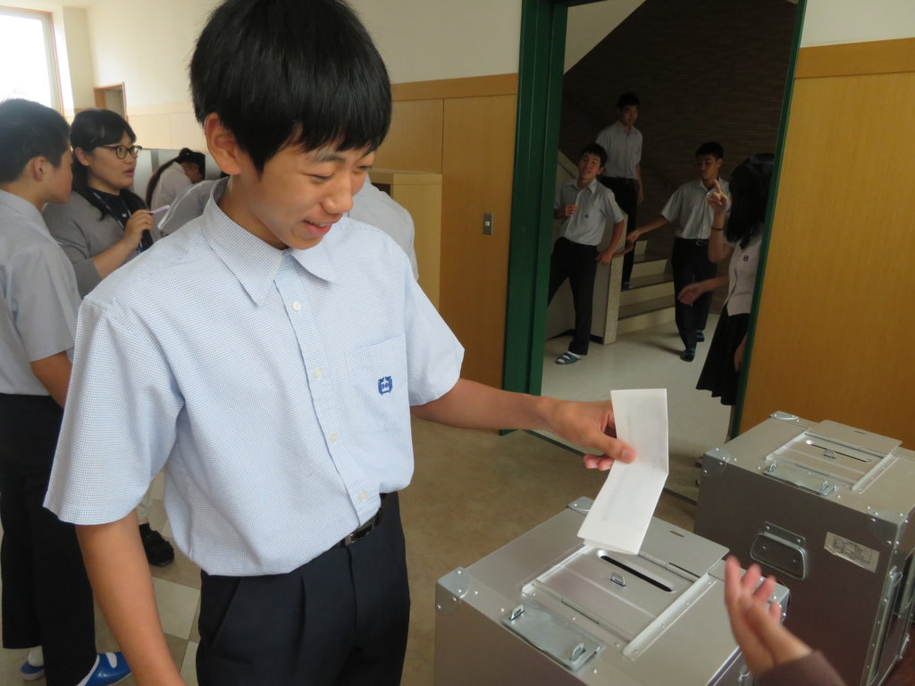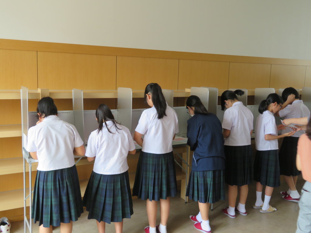 演説後は、投票に移ります。手順は、生徒会役員から投票用紙を一人一枚ずつ、手渡しで受け取り、記載台にて記入、投票箱へ投函となります。