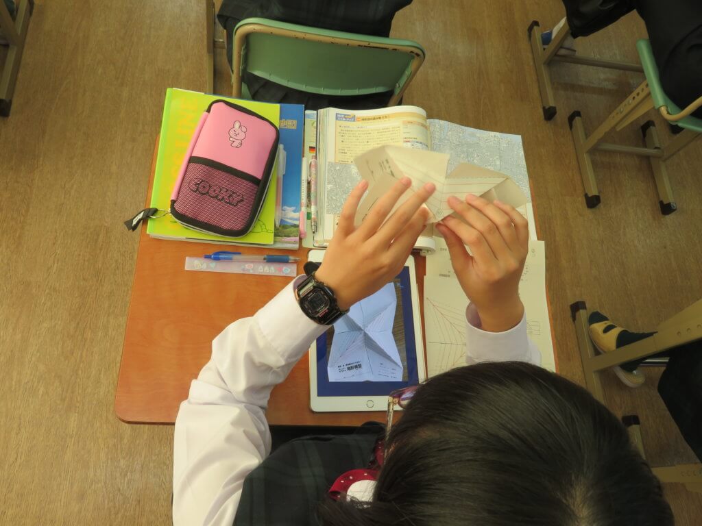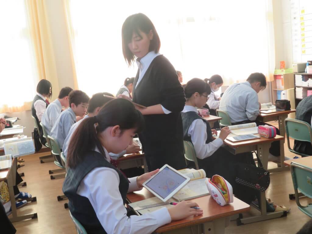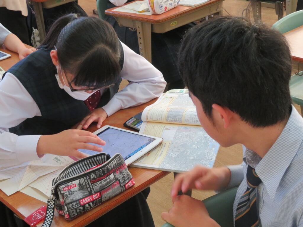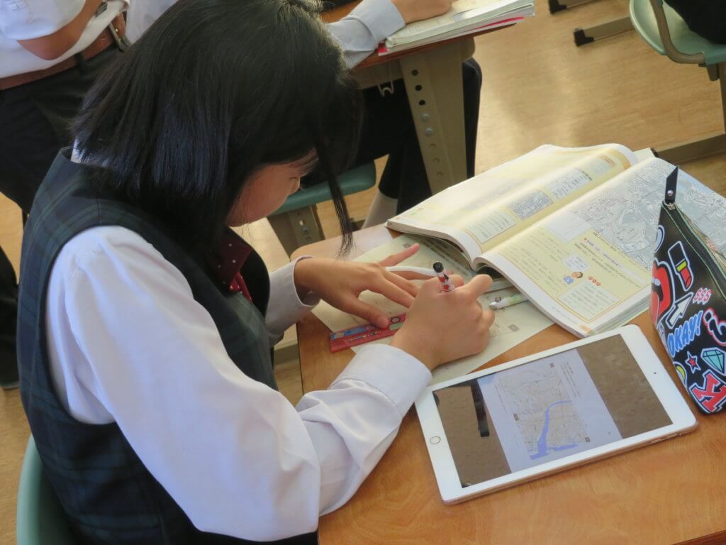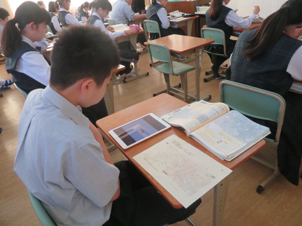 写真は、先日行われた、J2Bの地理の授業の様子です。今回の授業ではタブレットを用いた授業が展開されていました。解いた問題をタブレットで先生に提出したり、地形などの写真をより分かりやすく見ることが出来たりと、新しい形の授業になりました。また、先生がタブレット上で色を付けたりしながら解説をしたりしていました。