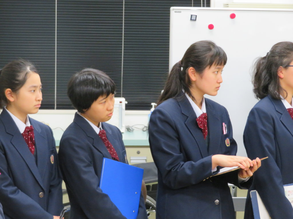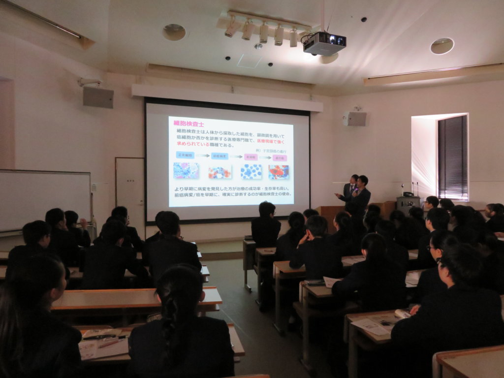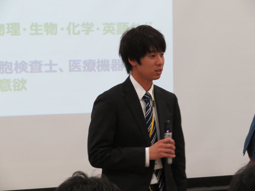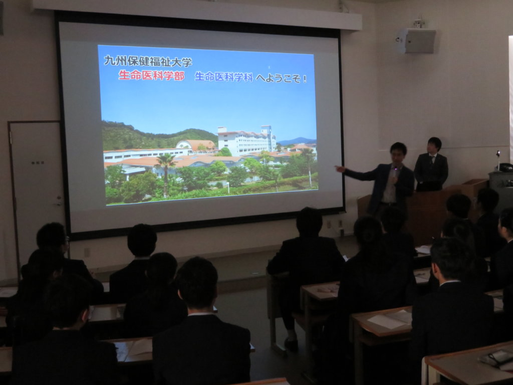 午後は、生命医科学部の見学です。施設見学の前に、生命医科学科長の三苫先生に「生命医科学部」の説明をしていただきました。学ぶ内容や、研究で用いる機材や設備の話はとても興味深いものでしたね。
