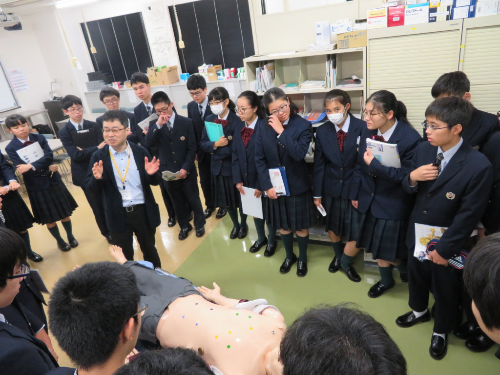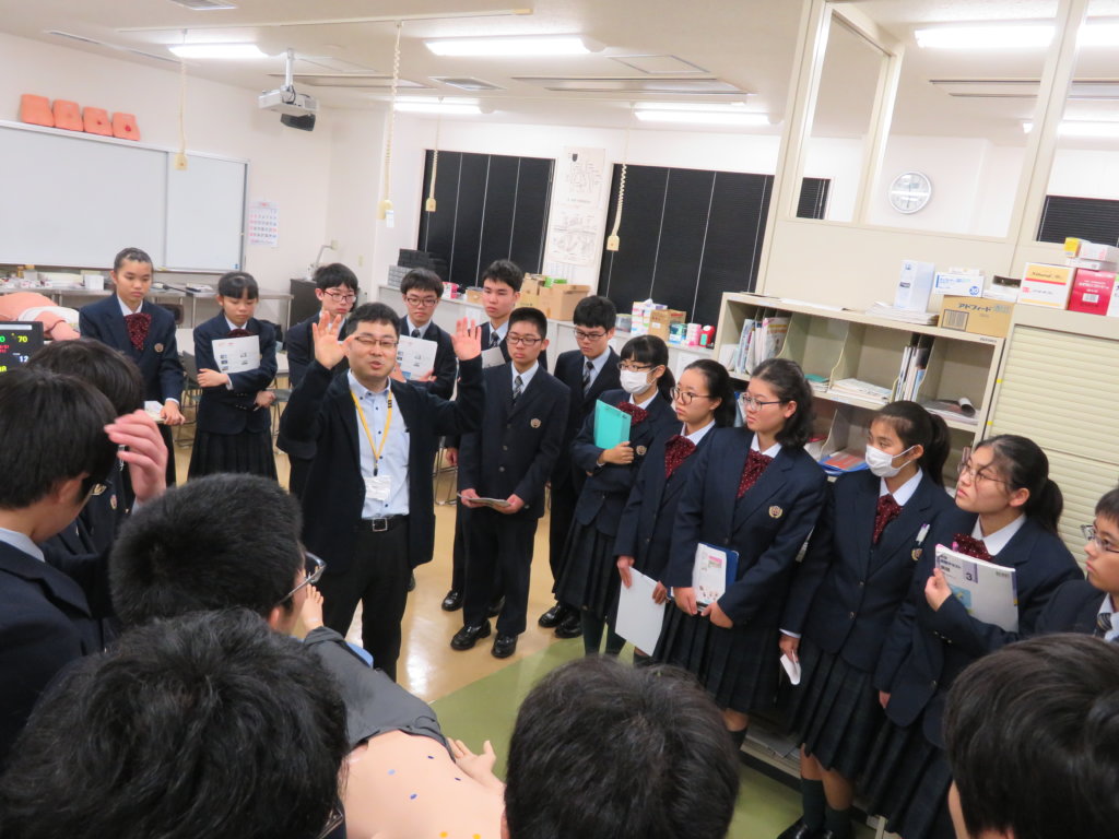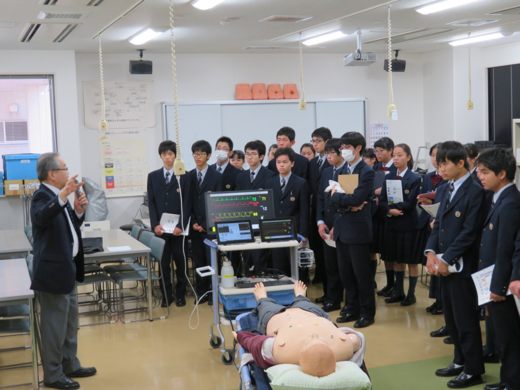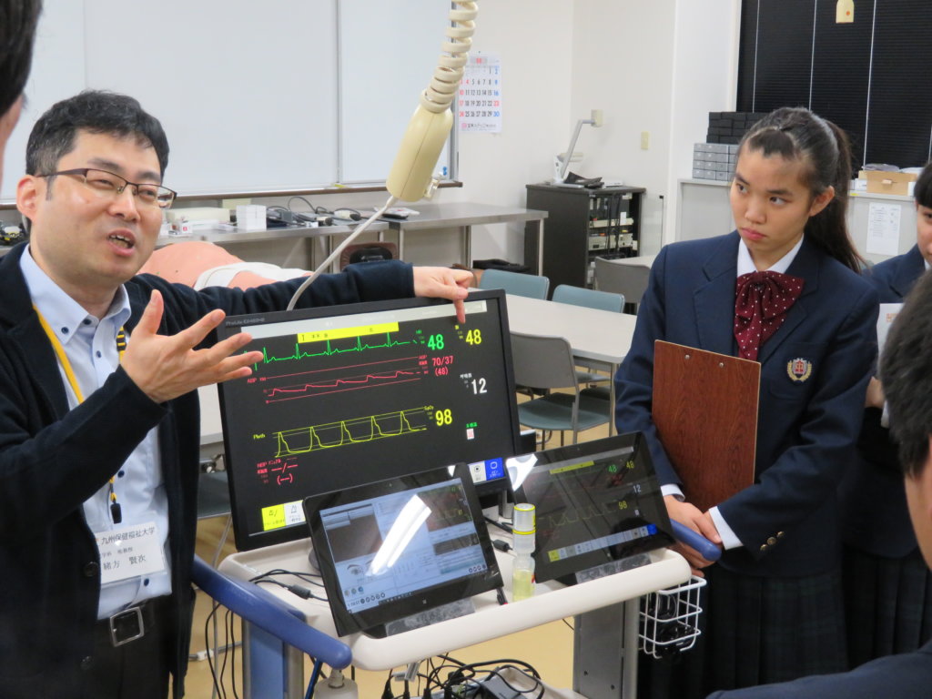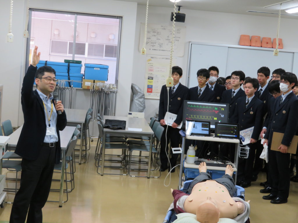 午後は、生命医科学部の見学です。施設見学の前に、生命医科学科長の三苫先生に「生命医科学部」の説明をしていただきました。学ぶ内容や、研究で用いる機材や設備の話はとても興味深いものでしたね。