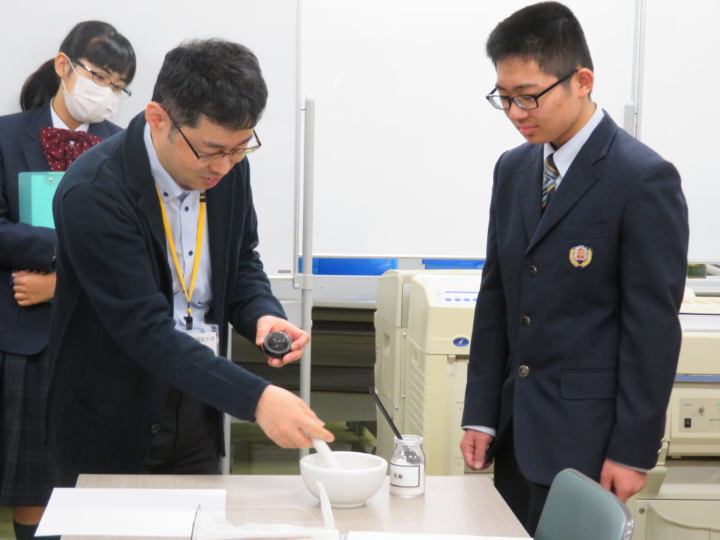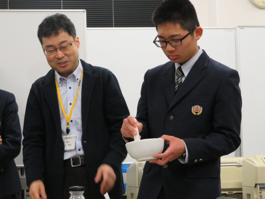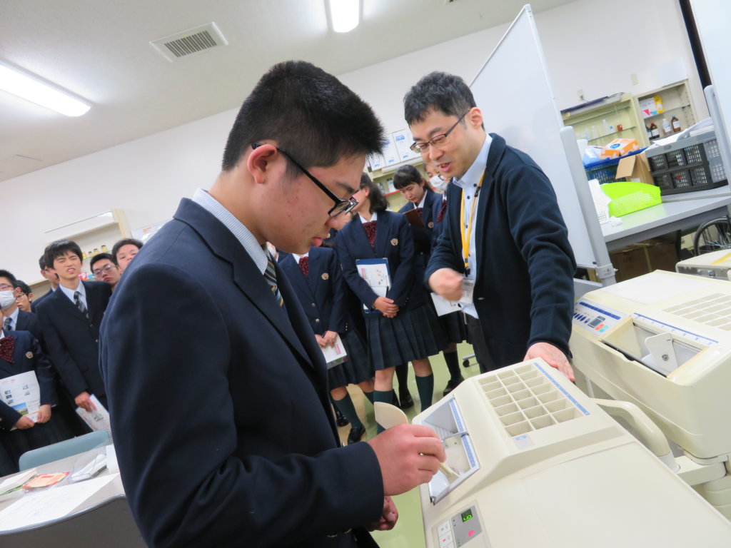 説明の中で、J3Bの小河瑞樹くん(本郷小出身)が生徒を代表して、実際に薬をつくる過程を体験しました。
