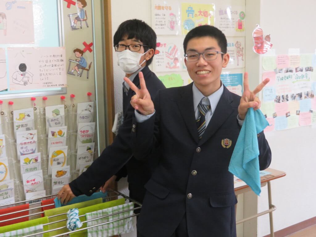 昼食・休憩時間になると、各クラスの保健委員会が台拭きを取りに来て、自教室の机を拭きます。