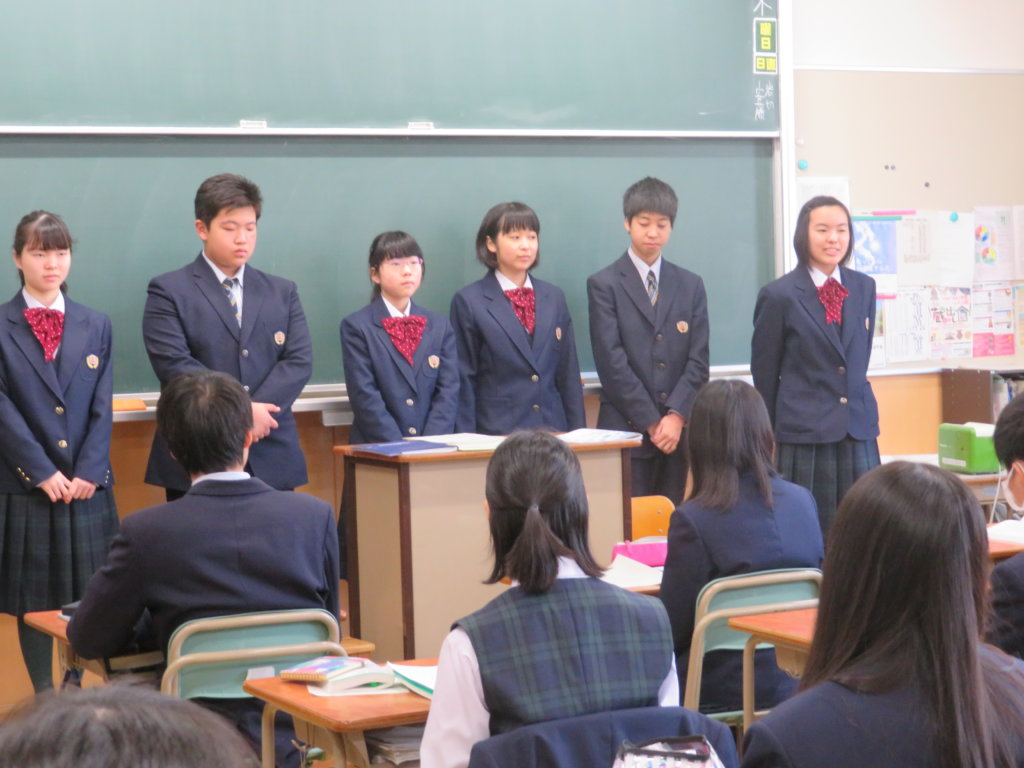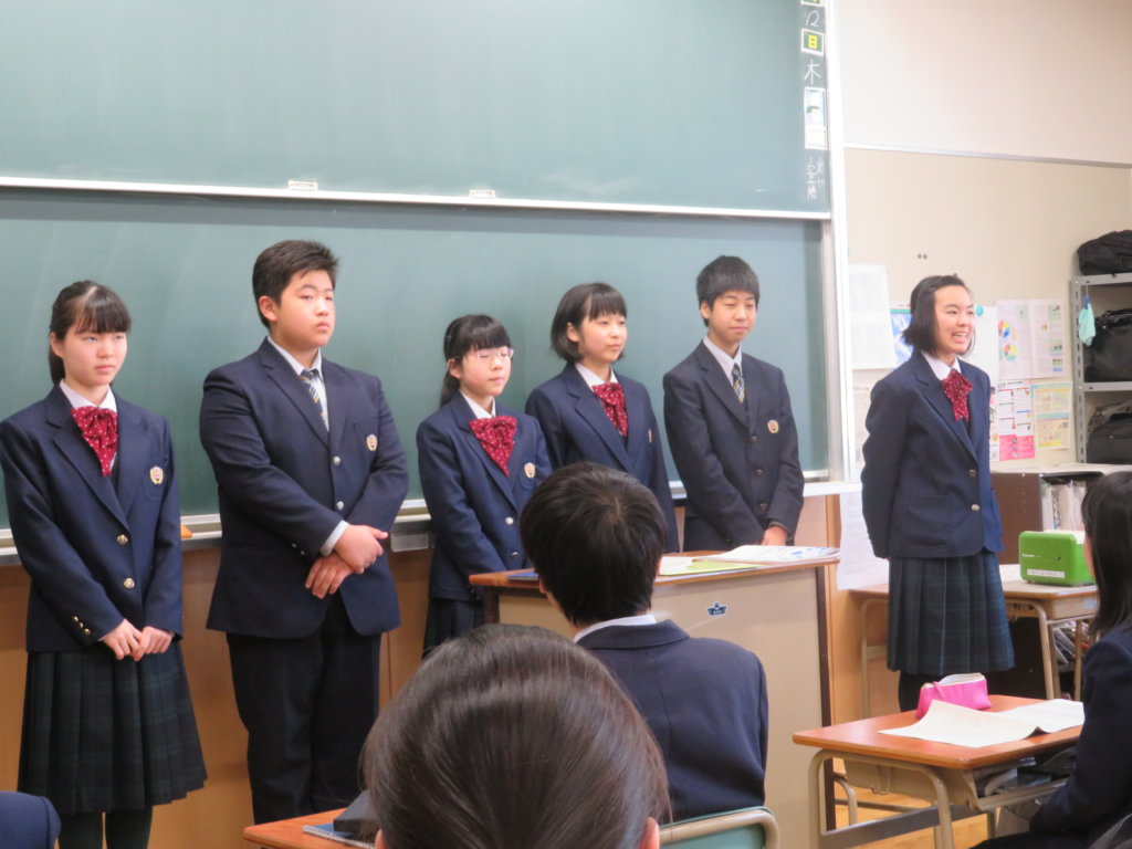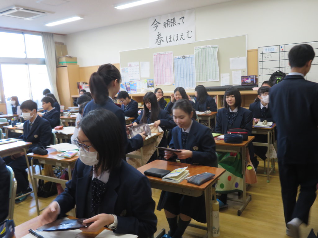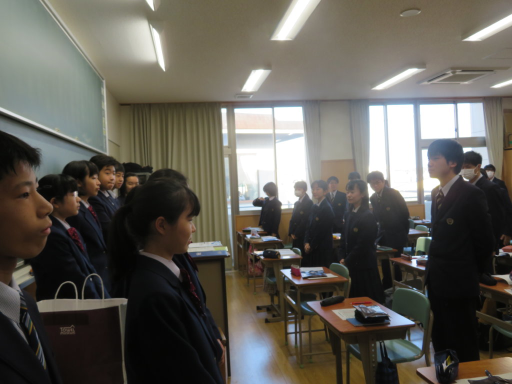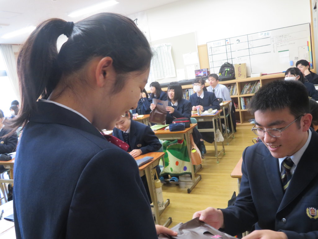 今日は特進英数科の中高一貫コースの先輩方のところへ、大学受験の応援をするために、中学生を代表して生徒会のメンバーが行って来ました。毎年、激励の意味を込めて合格タオルをプレゼントしています。3年1組、2組にお邪魔をさせていただき、先輩方へタオルを手渡ししてきました。