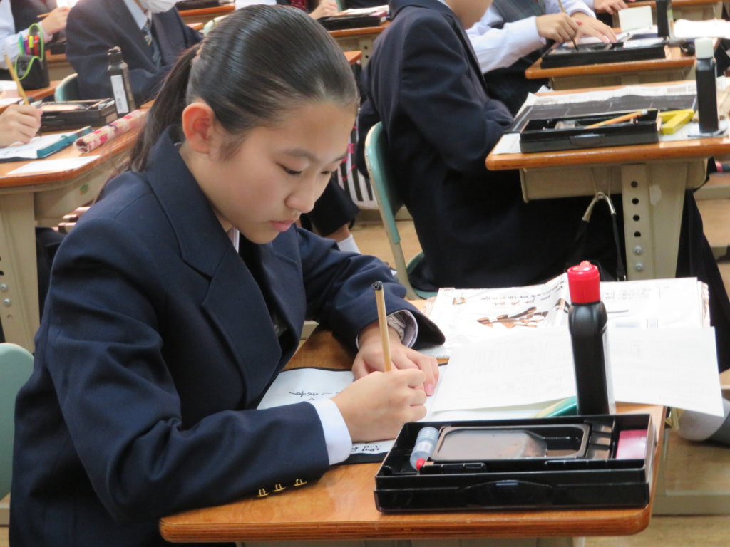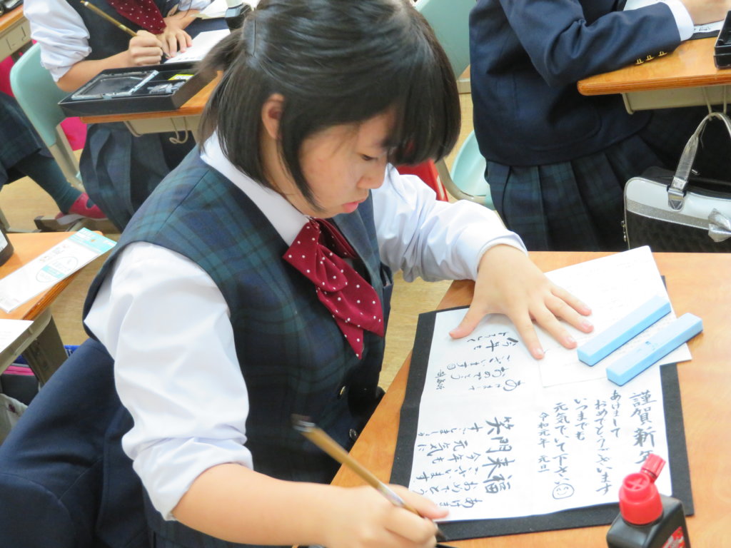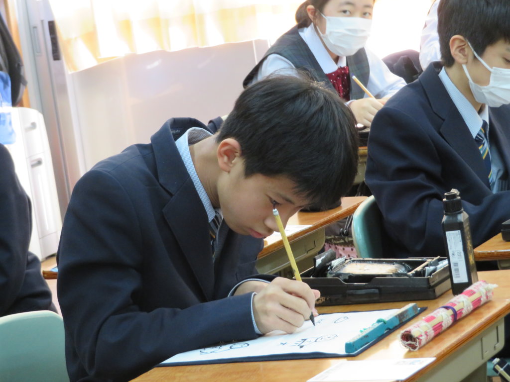 本日は、J1Bの書道の様子を紹介します。1年生は現在、小筆を用いて年賀状を作成する授業を行っています。筆を利用して書くことに慣れていないため、苦戦していましたが、これまでの授業で学んだことを駆使して作成していました。