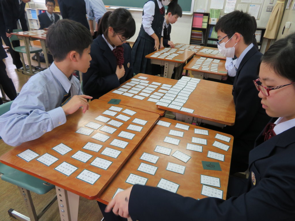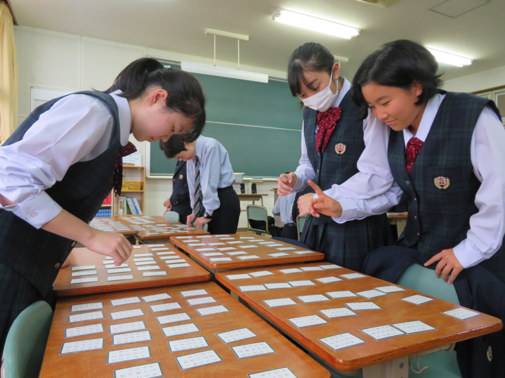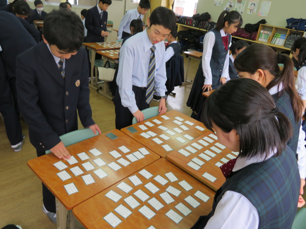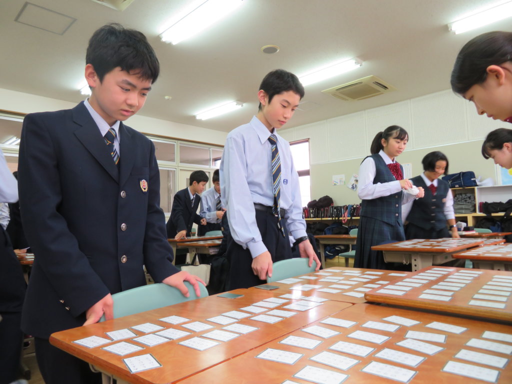 国語の授業では、11月末から「古典に親しむ」ことを目的に、百人一首について学ぶ場を展開しつつ、競技の練習も行っています。