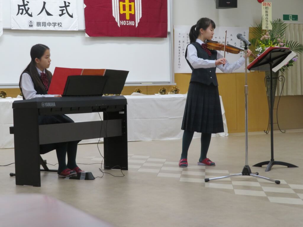 在校生もハンドベルやピアノ・バイオリンの演奏でお祝いをしました。