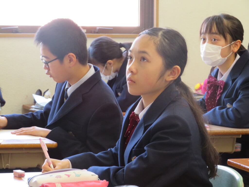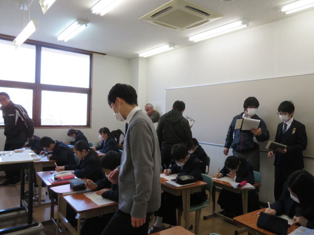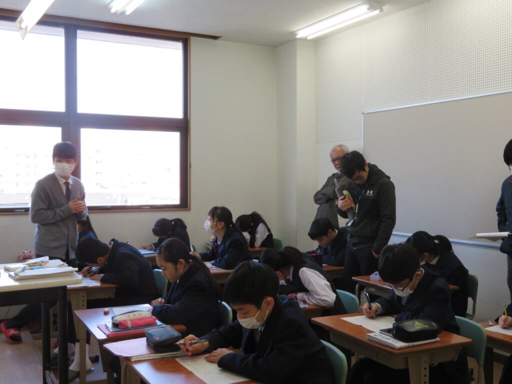 J1の数学は、一次関数の単元を学習しています。今回の研究授業では、一次関数の応用問題を取り扱いました。教科書で学習した内容をもとにして、応用問題にチャレンジしていました。内容自体は難しいものでしたが、解説を聞きながら一生懸命に取り組む様子が見られました。また、高校の数学の先生方も来られて、授業を見ながら意見交換をされていました。