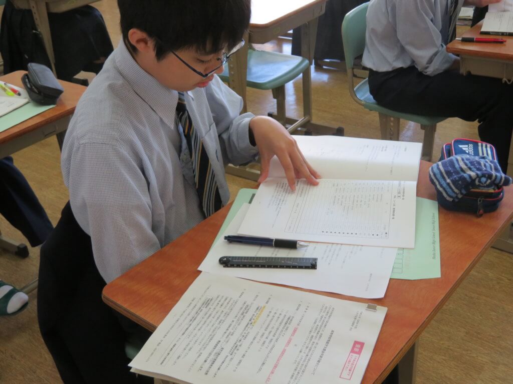 3年生は高校の入学説明会が中止となったので、本日、各クラスで説明を行いました。高校へ進学する実感も少しは出てきたのではないでしょうか。