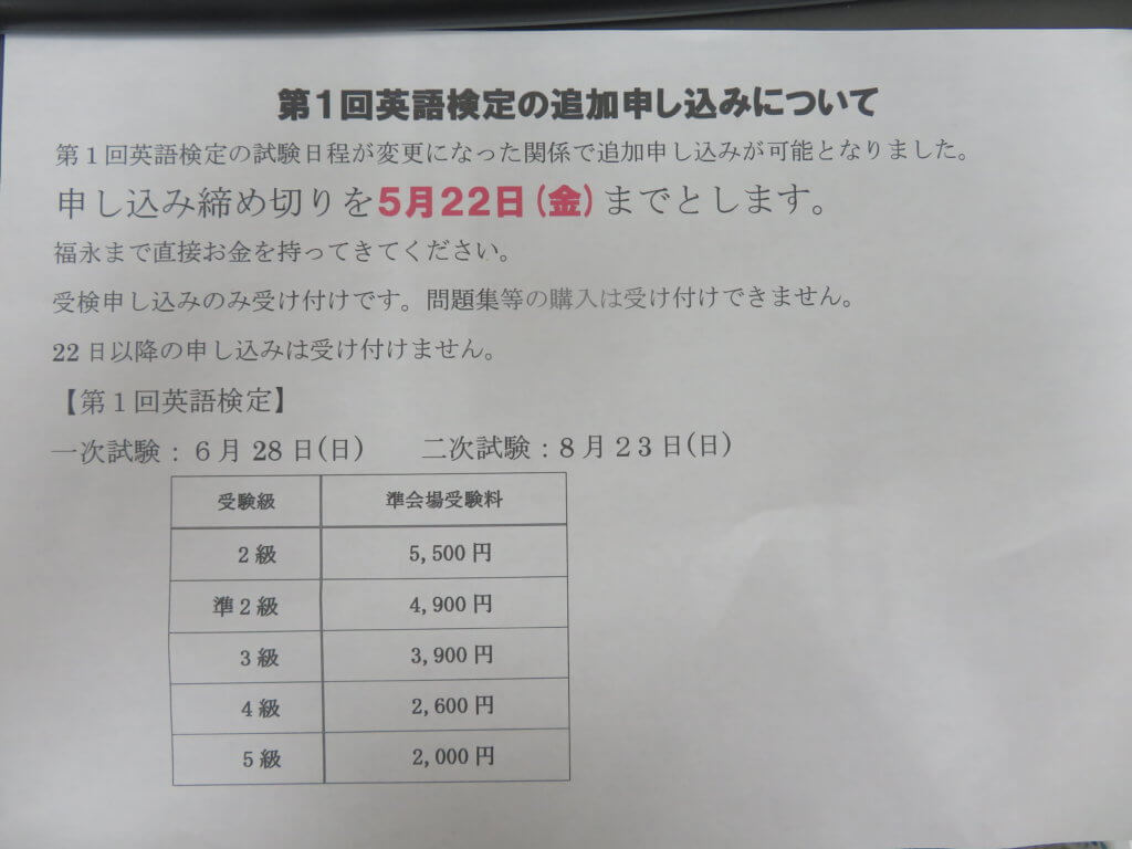 日程変更に伴い追加での受検申し込みが可能となりました。5月22日(金)が締め切りとなります。