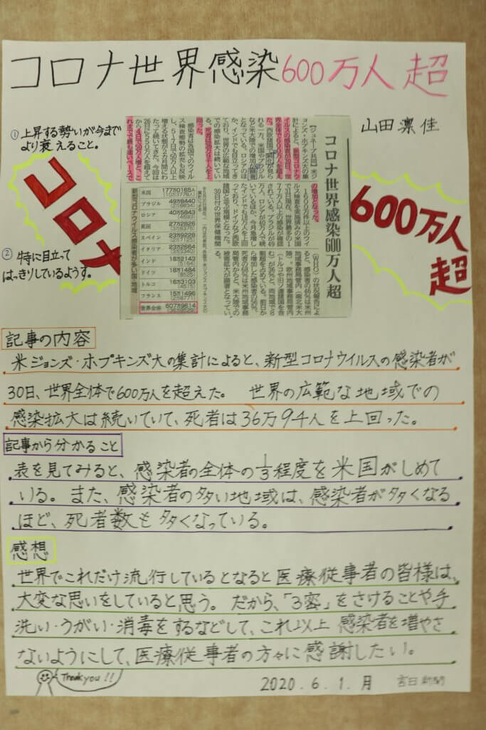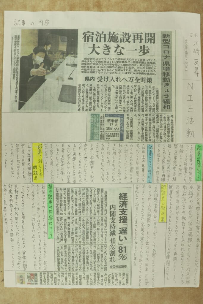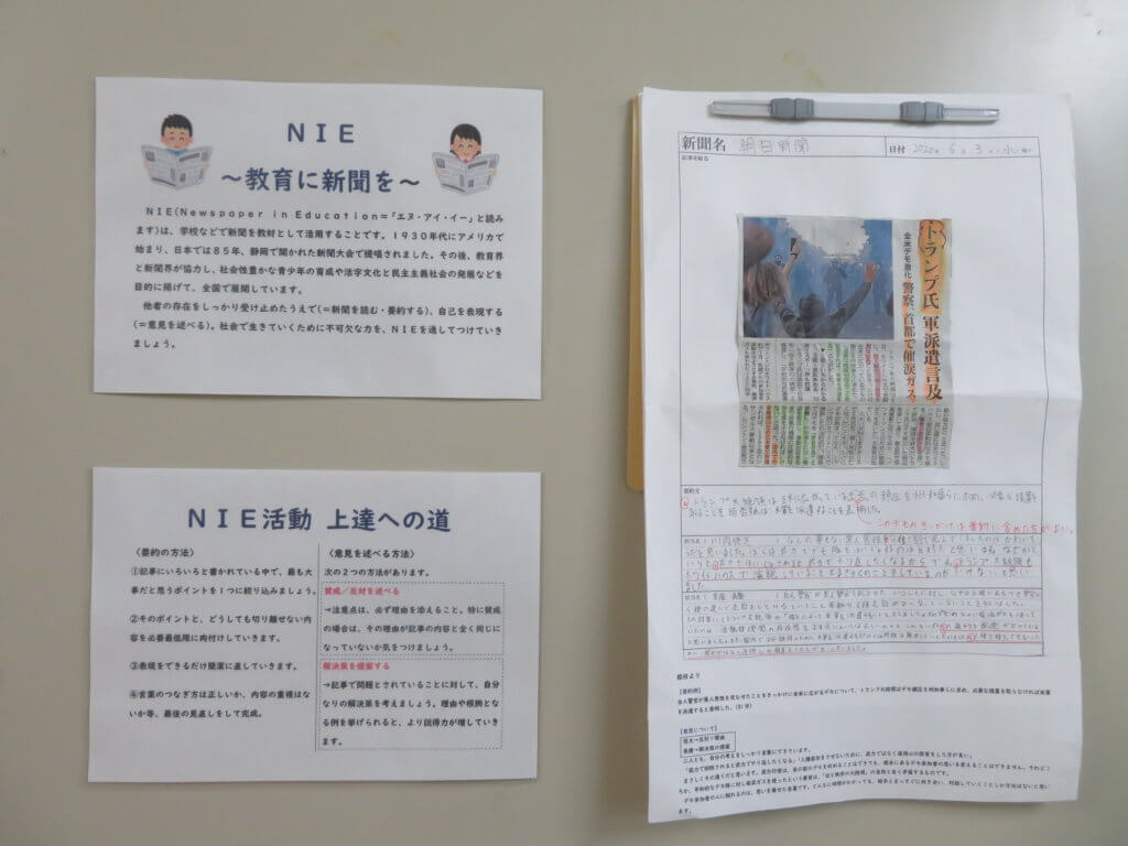 NIE活動は6,7月の2か月間行います。新聞を読む・要約することで他者の存在をしっかり受け止めたうえで、意見を述べる力を付けていきましょう。