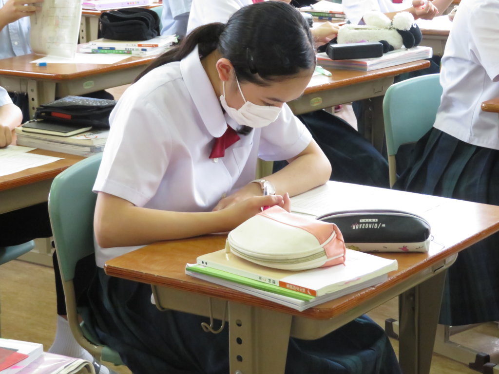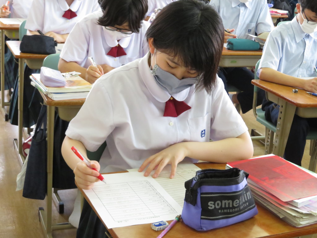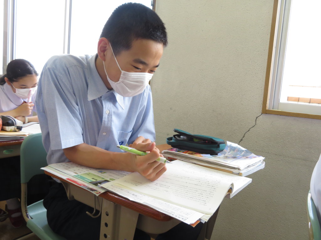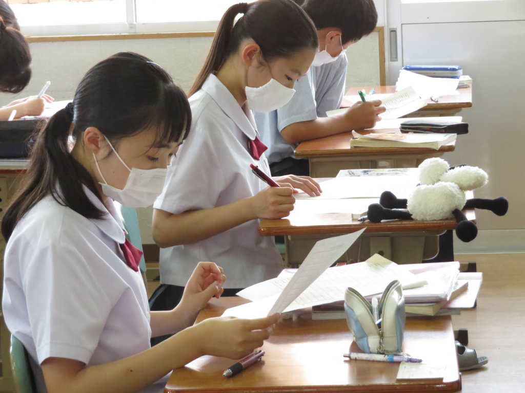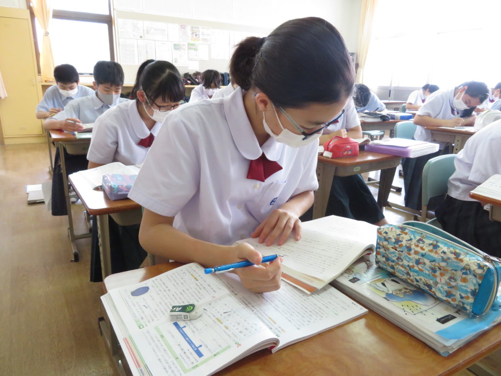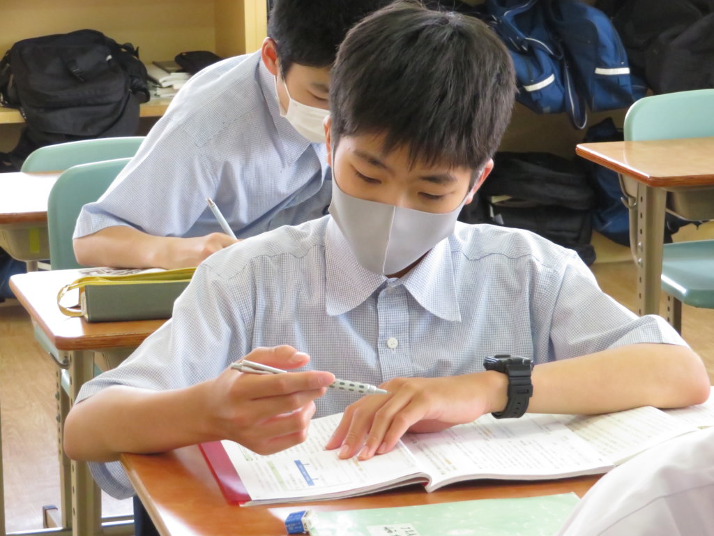 J2の授業の様子です。理科の授業では、小テストが行われました。国語の授業では、口語文法の復習をしていました。