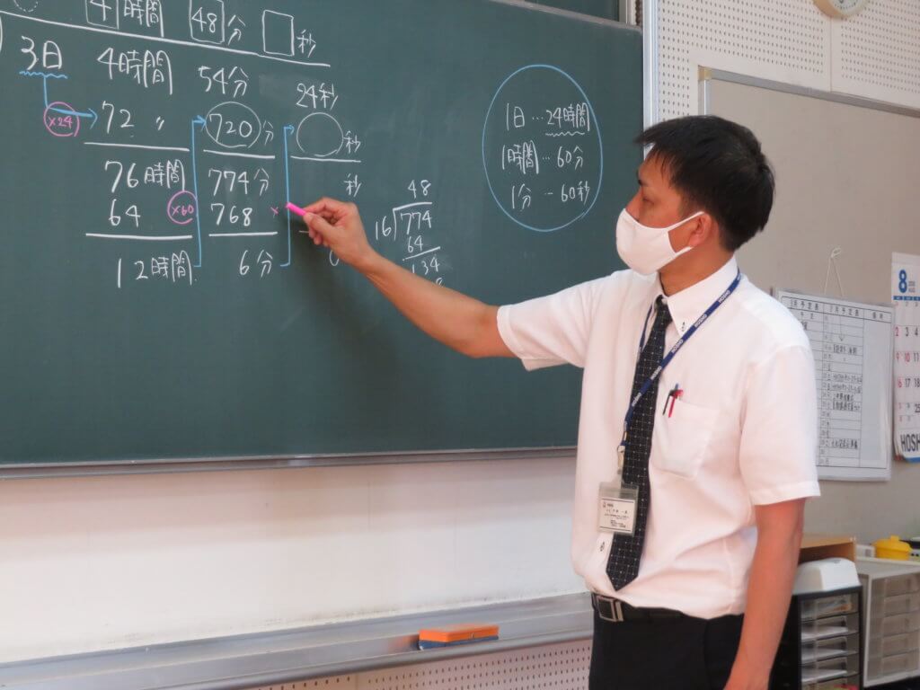算数では時間の計算を学習しました。小学校の授業では扱わない問題で、難しそうでしたが、一生懸命考えていました。