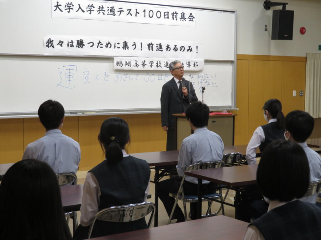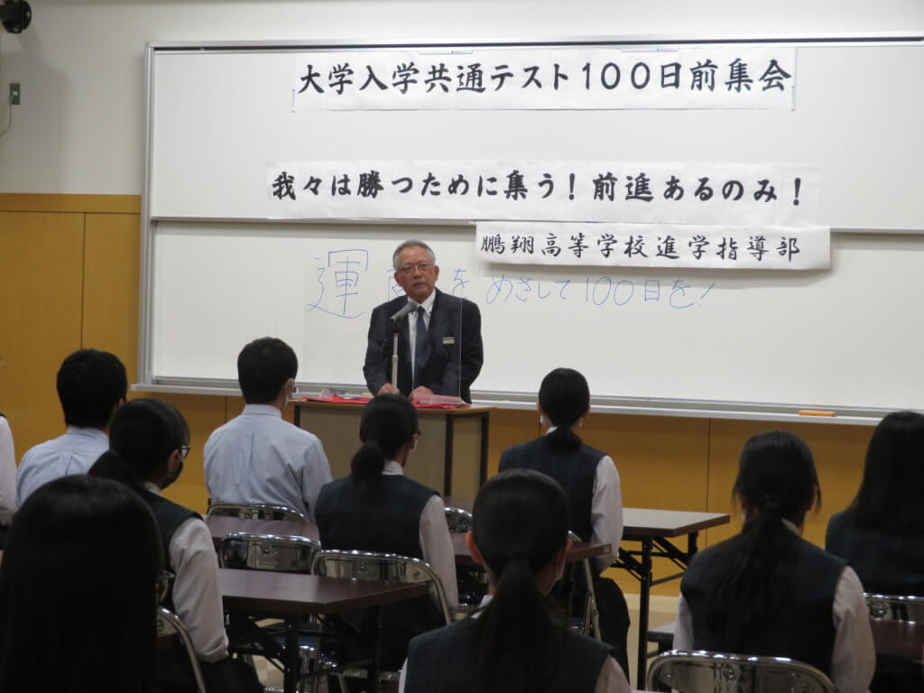 また、特進英数科3年生を対象に大学入学共通テスト100日前集会が行われました。校長先生をはじめ、多くの先生方から、励ましのお言葉、試験当日までの学習面生活面に関するお話がありました。
