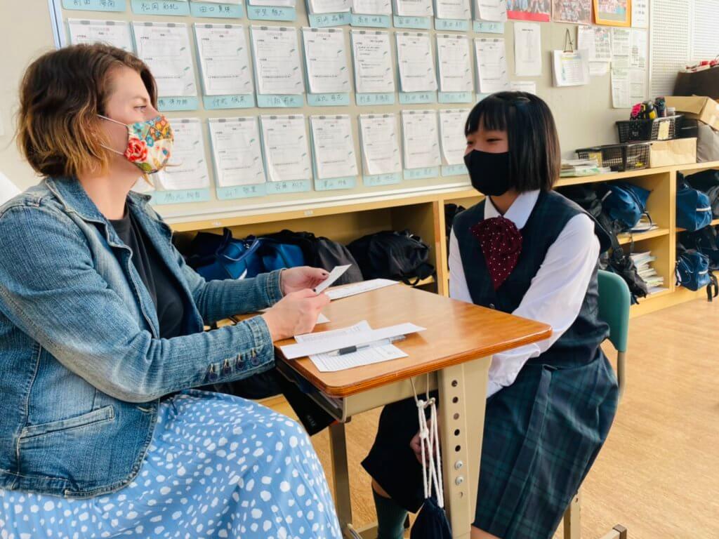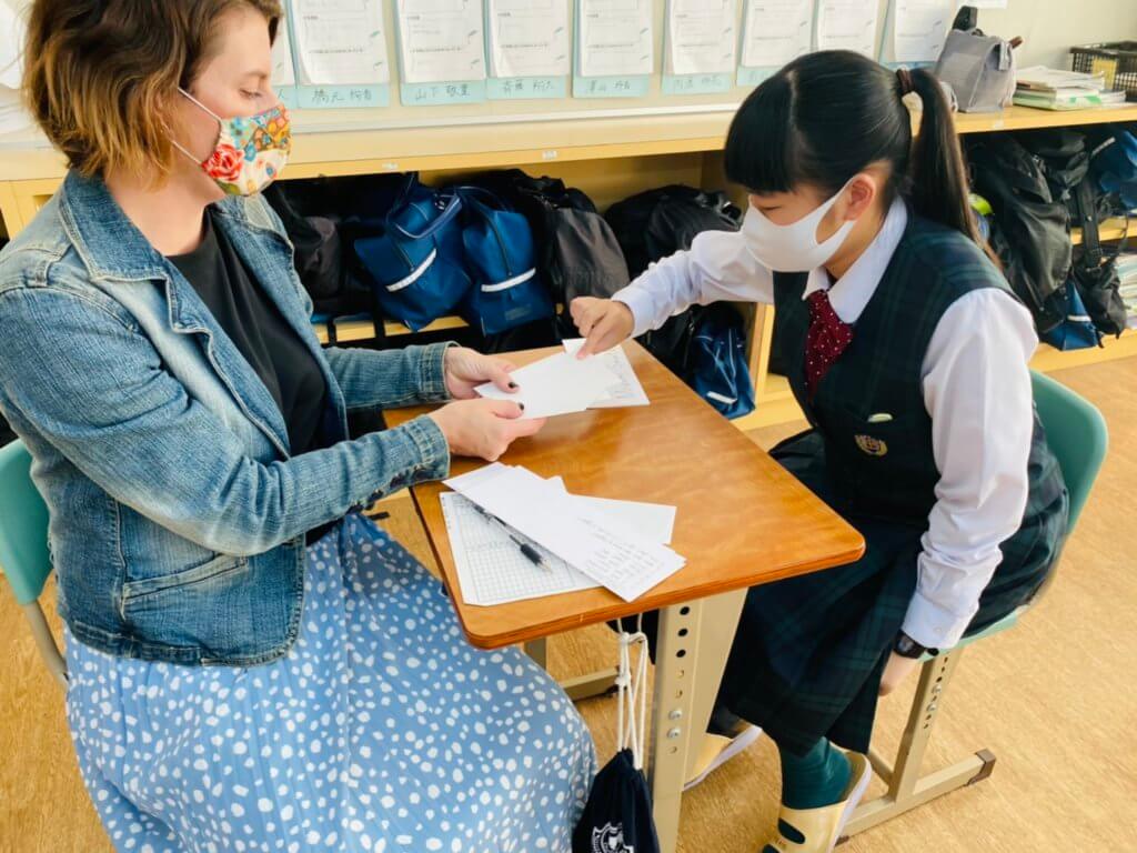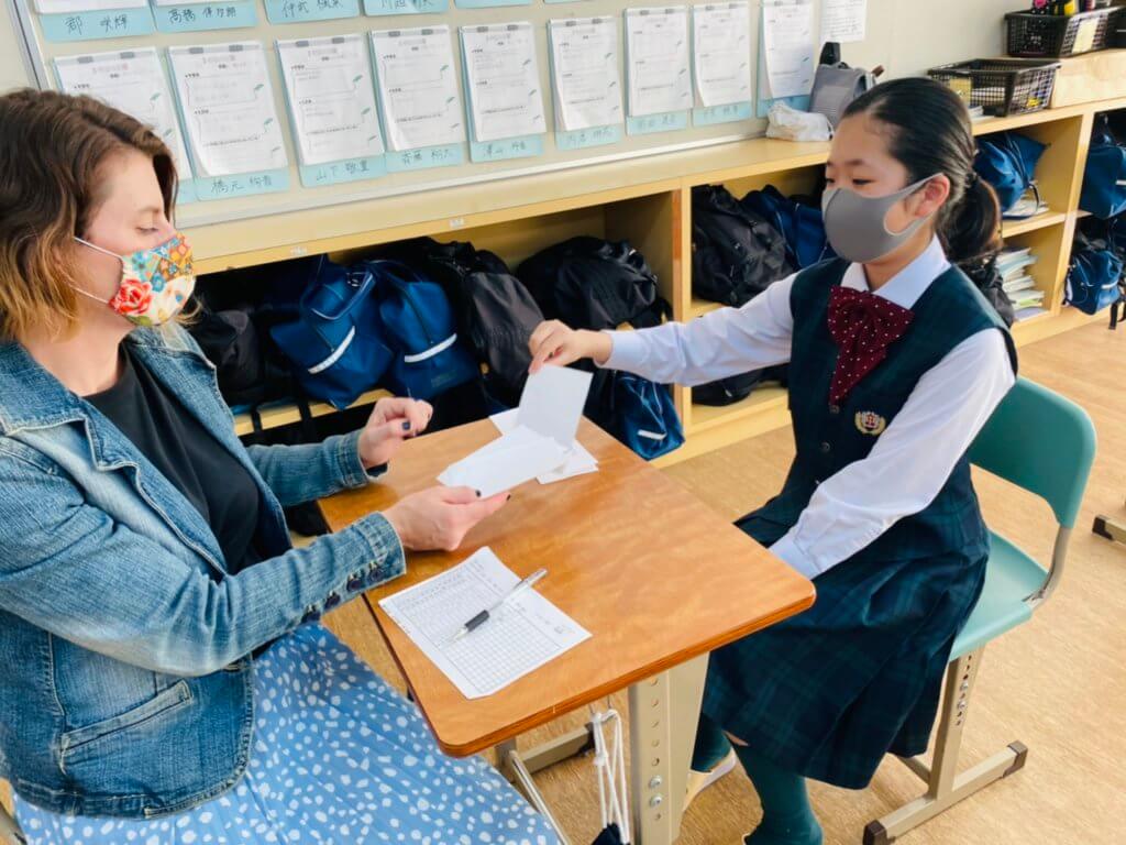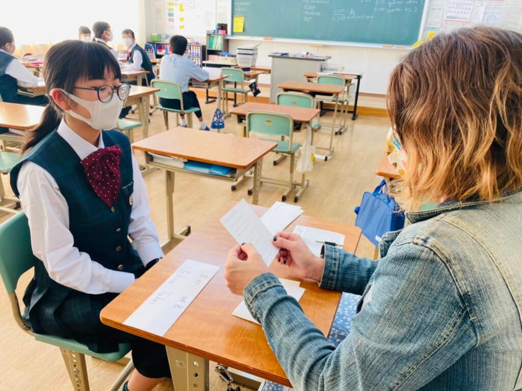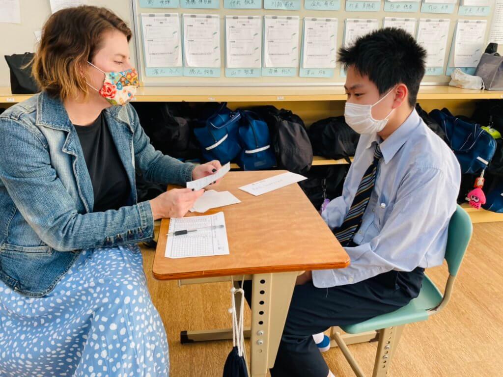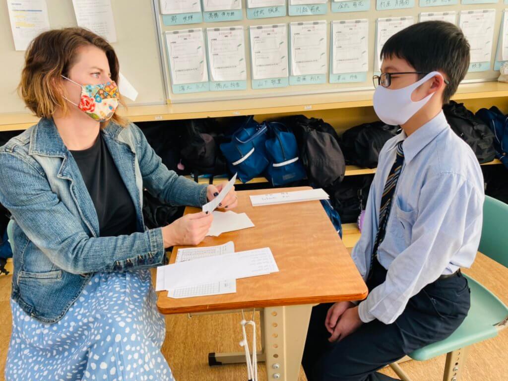 1対1形式のインタビューテストで、今まで学習してきた内容を使ってジェニファー先生と会話を行っていました。さすが3年生!すらすらと質問に答えることができていました。