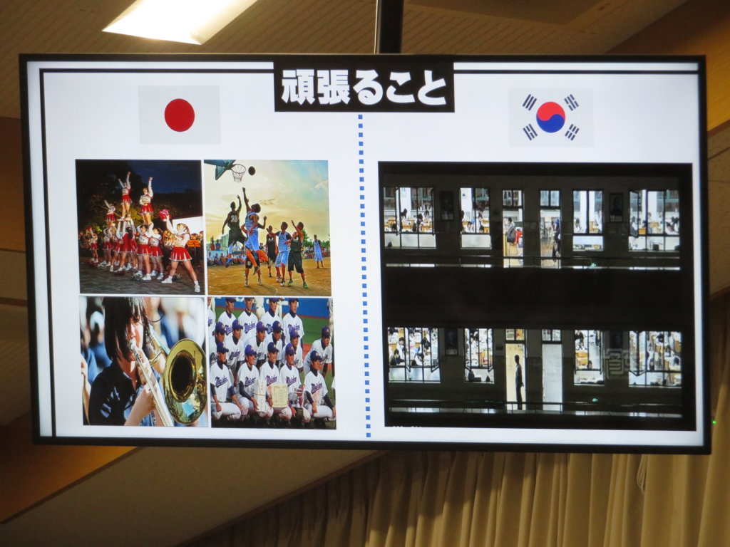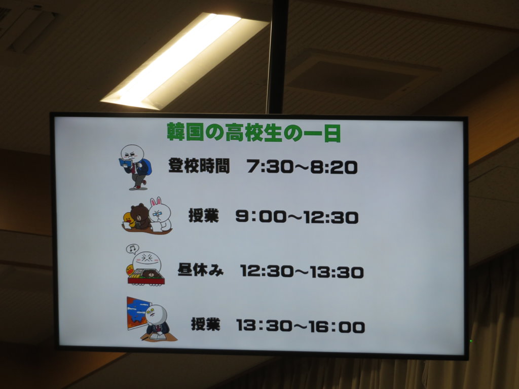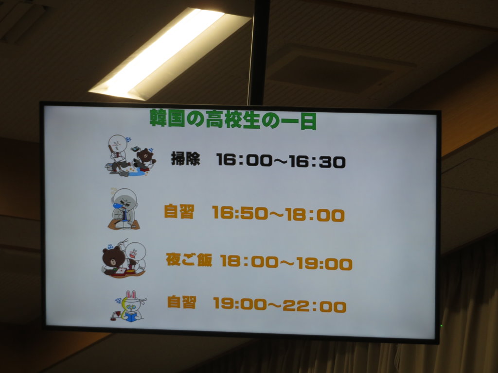 韓国の国旗の成り立ちや韓国の高校3年生の1日のスケジュールなど興味深いお話をしていただきました。生徒たちもメモを取りながら熱心に聞いていました。