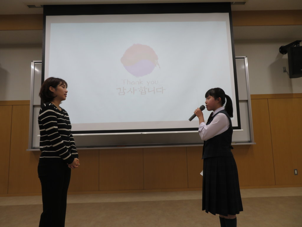 最後に、生徒を代表してJ3B金丸萌花さん(宮崎小出身)がお礼の言葉を述べました。もっと韓国のことについて知りたいと興味を持ったようです。
