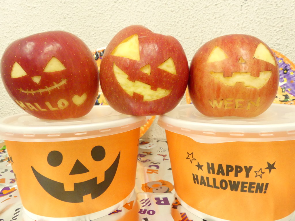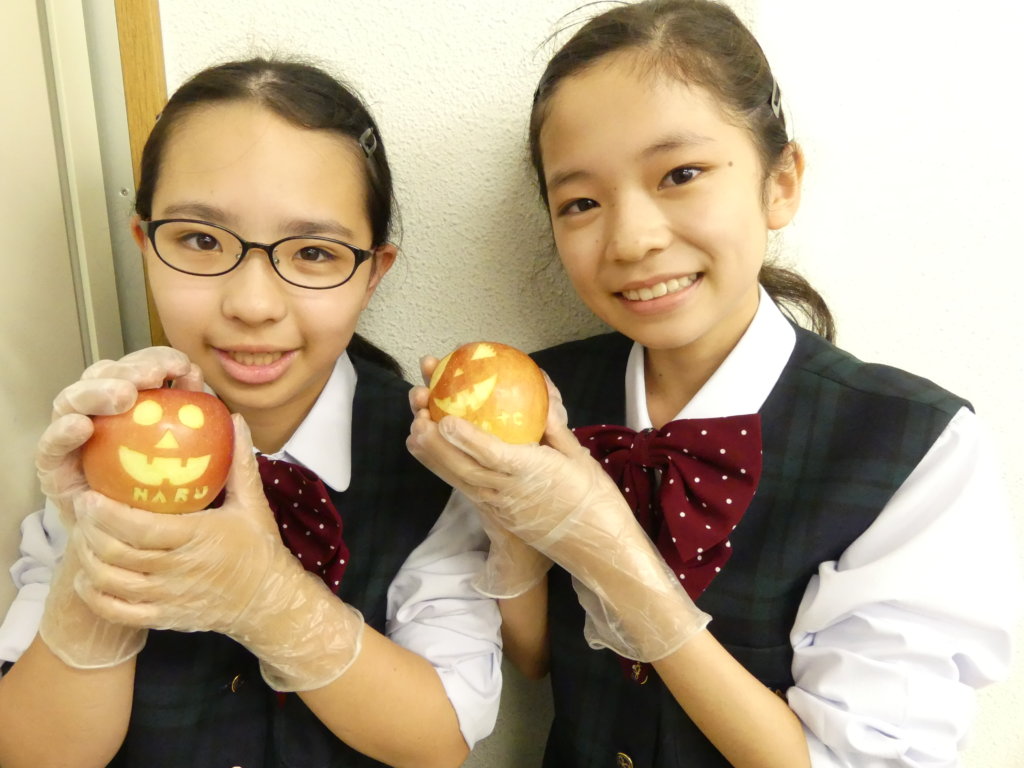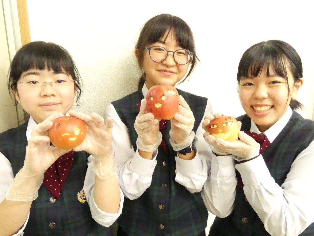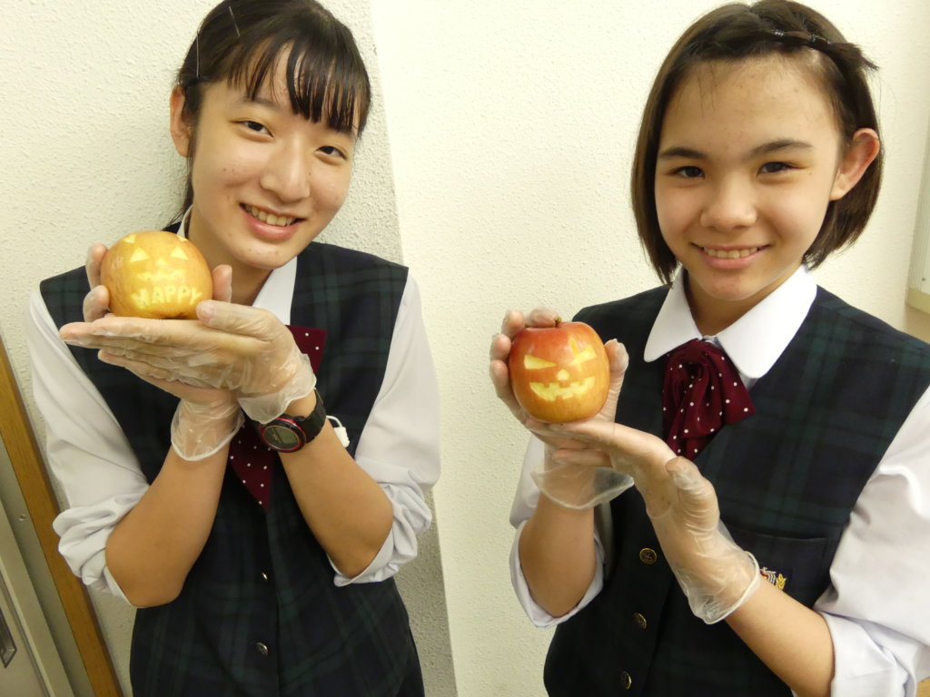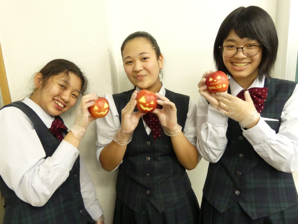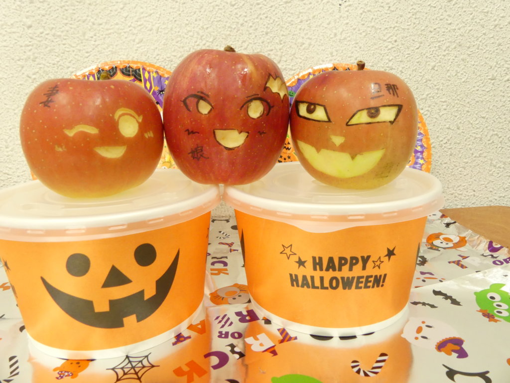 昨日、ESS部でジャック・オー・ランタンを作りました。かぼちゃの代わりにリンゴで作成です!1人1人デザインを考えたオリジナル作品です。
