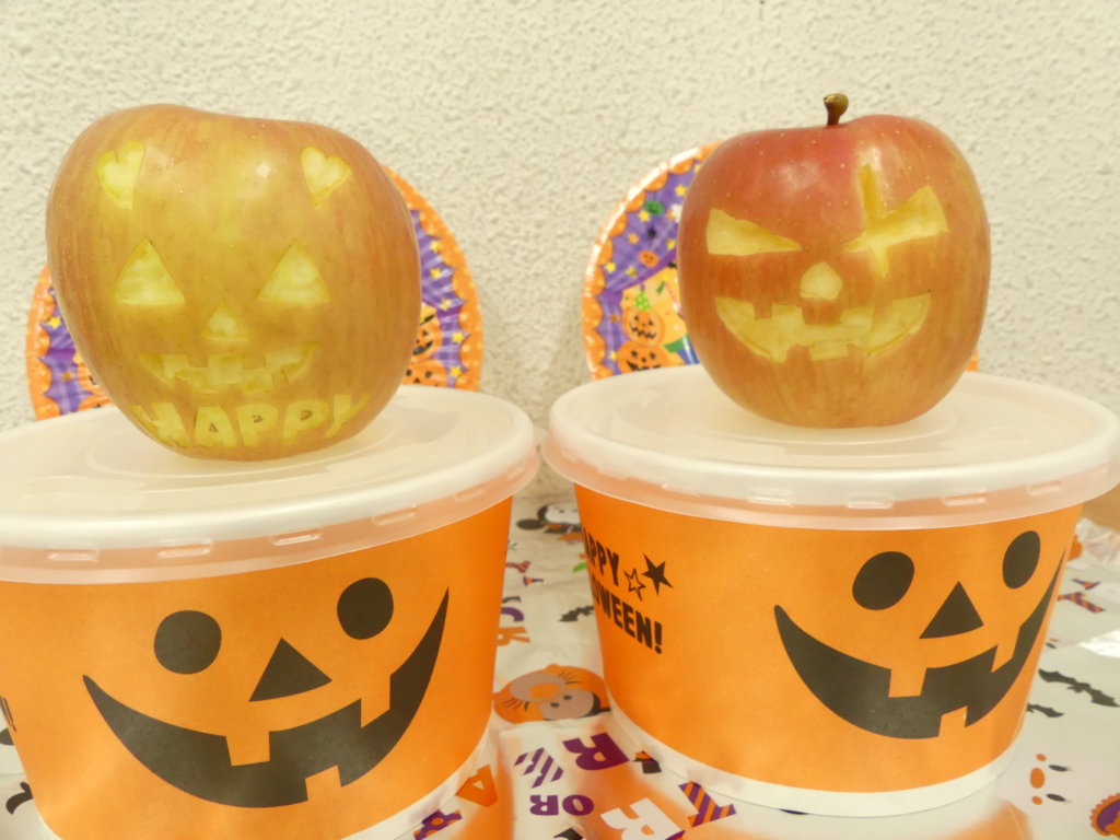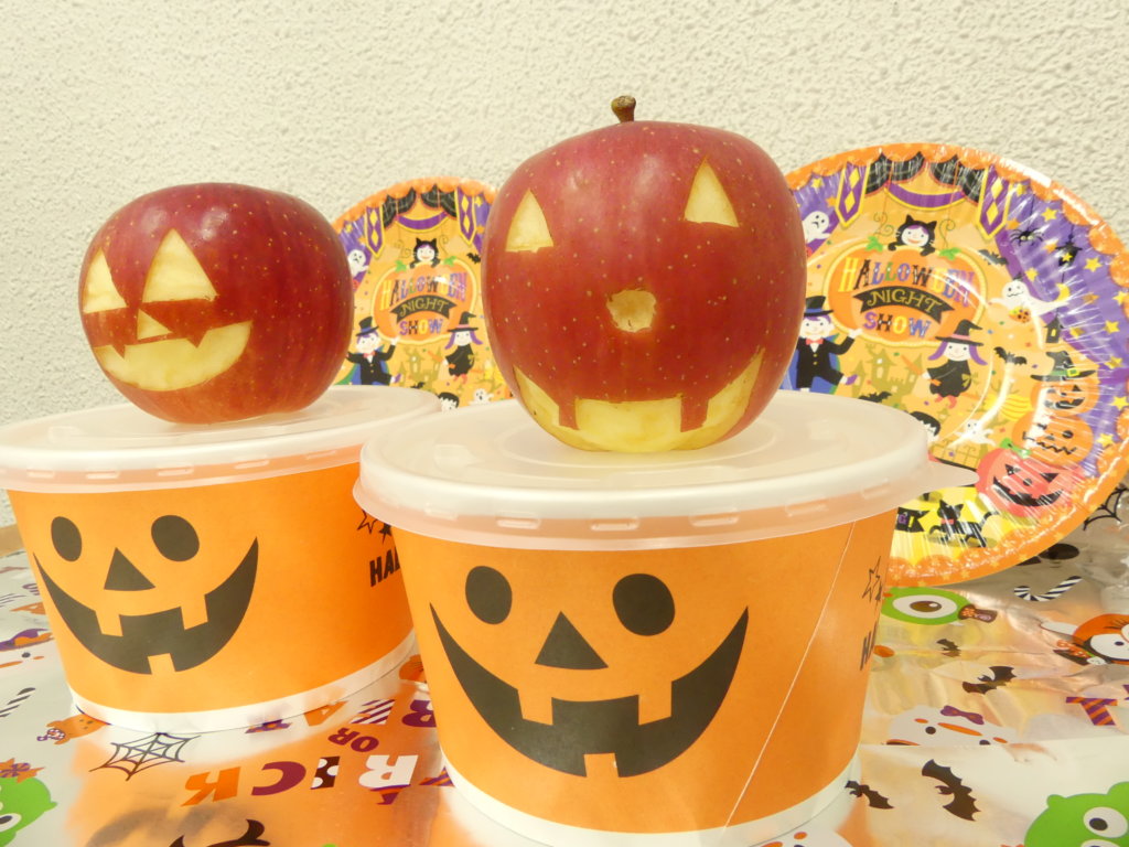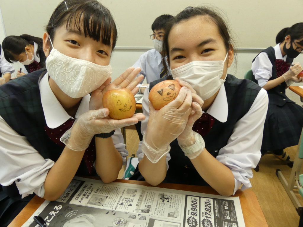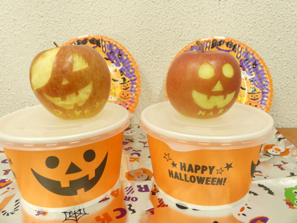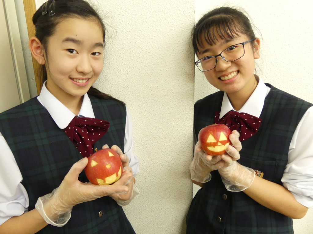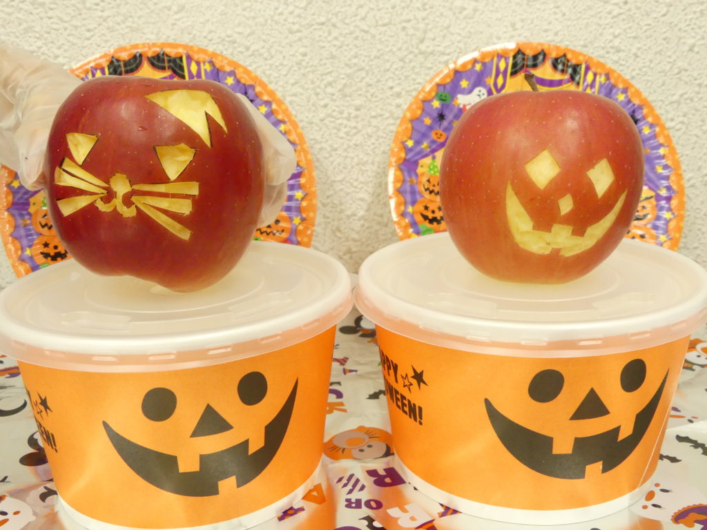 昨日、ESS部でジャック・オー・ランタンを作りました。かぼちゃの代わりにリンゴで作成です!1人1人デザインを考えたオリジナル作品です。