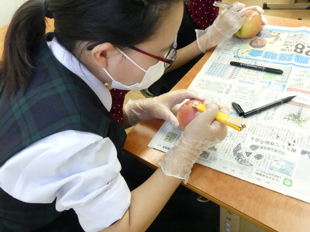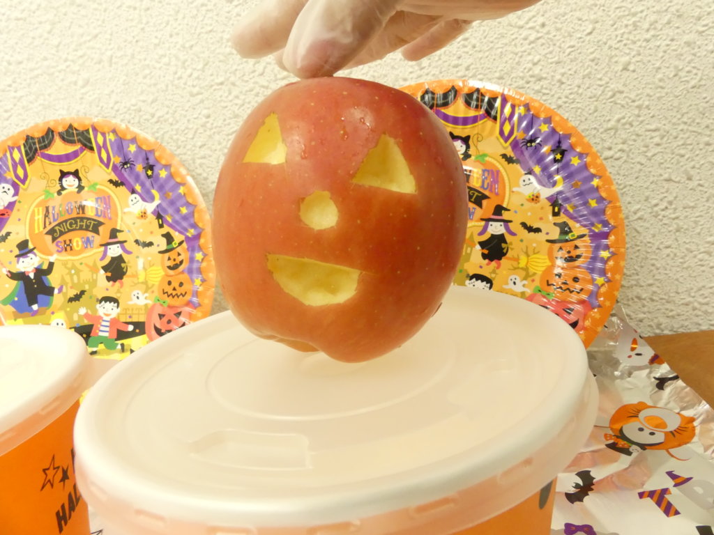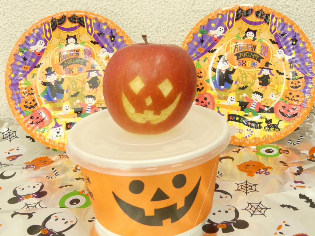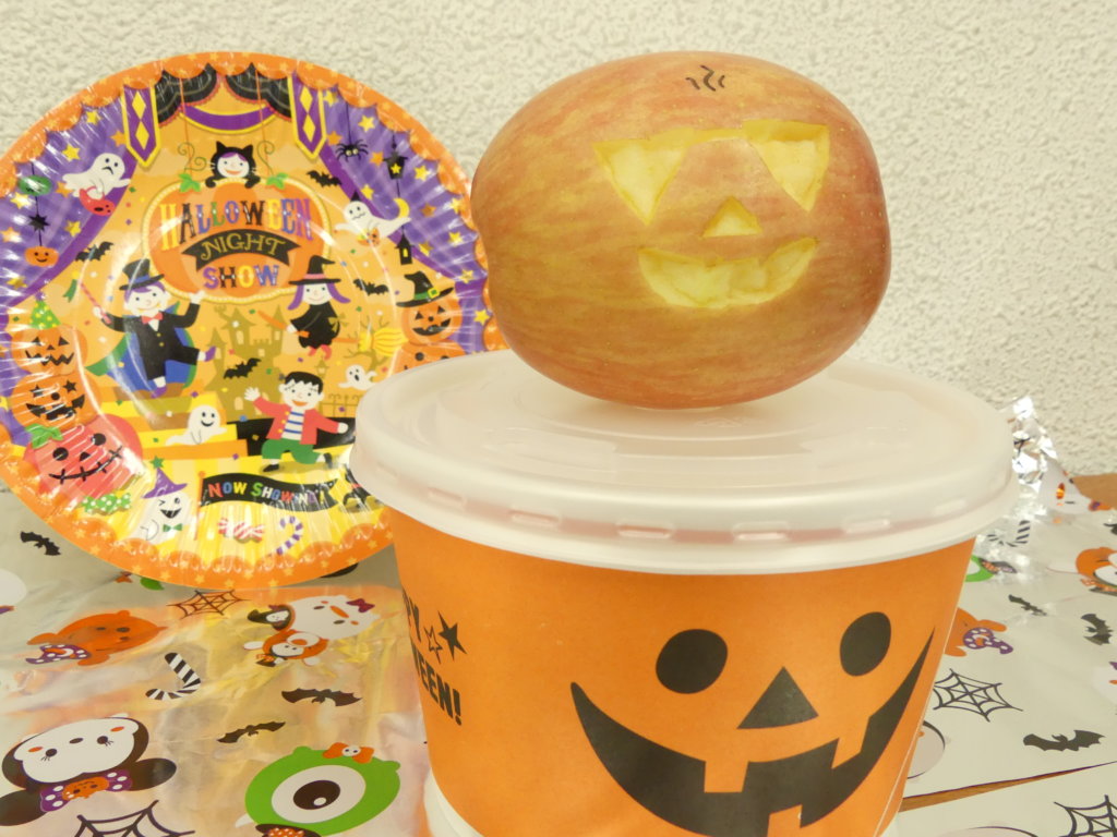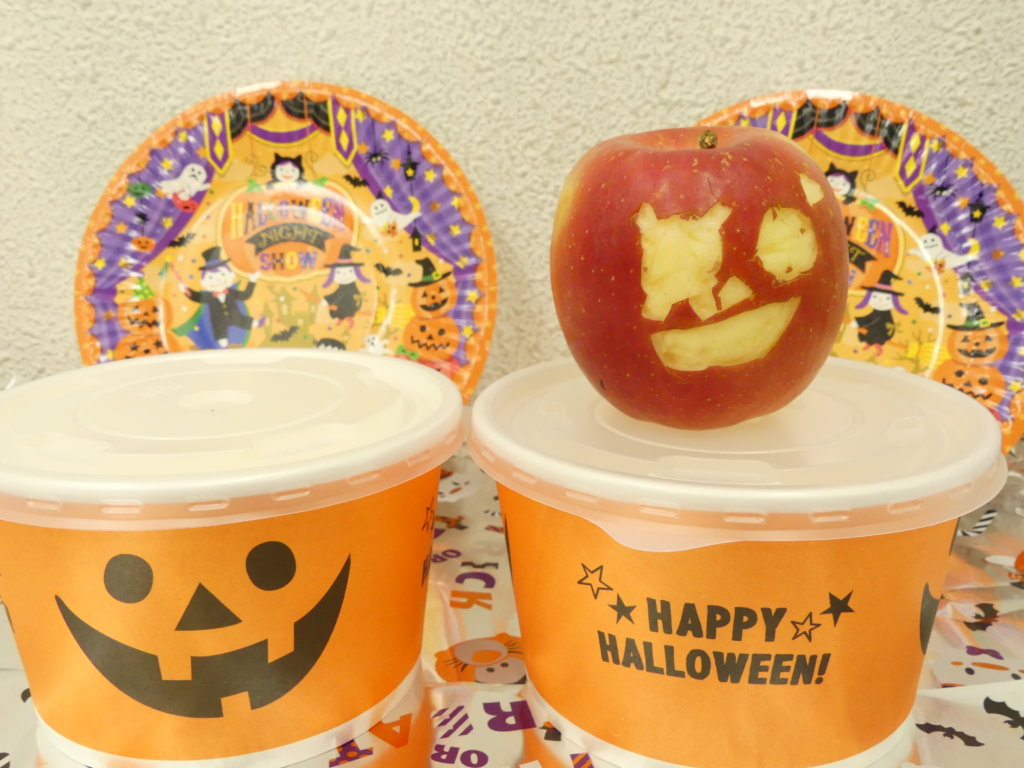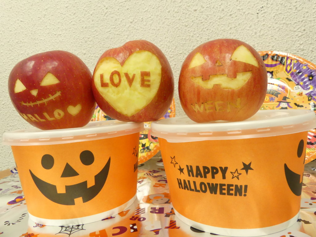 昨日、ESS部でジャック・オー・ランタンを作りました。かぼちゃの代わりにリンゴで作成です!1人1人デザインを考えたオリジナル作品です。