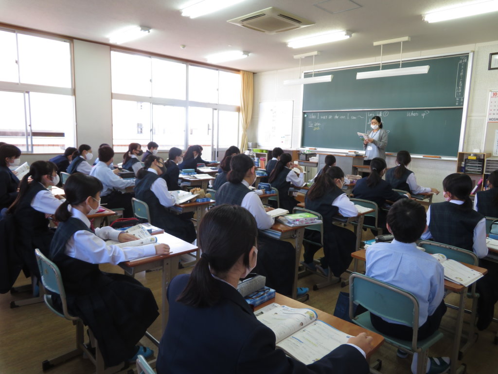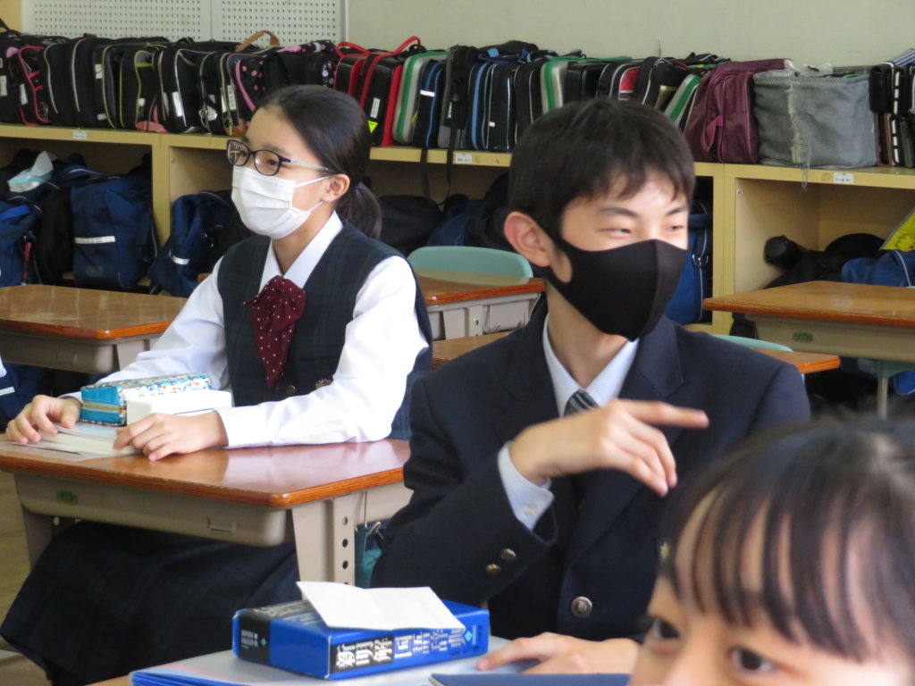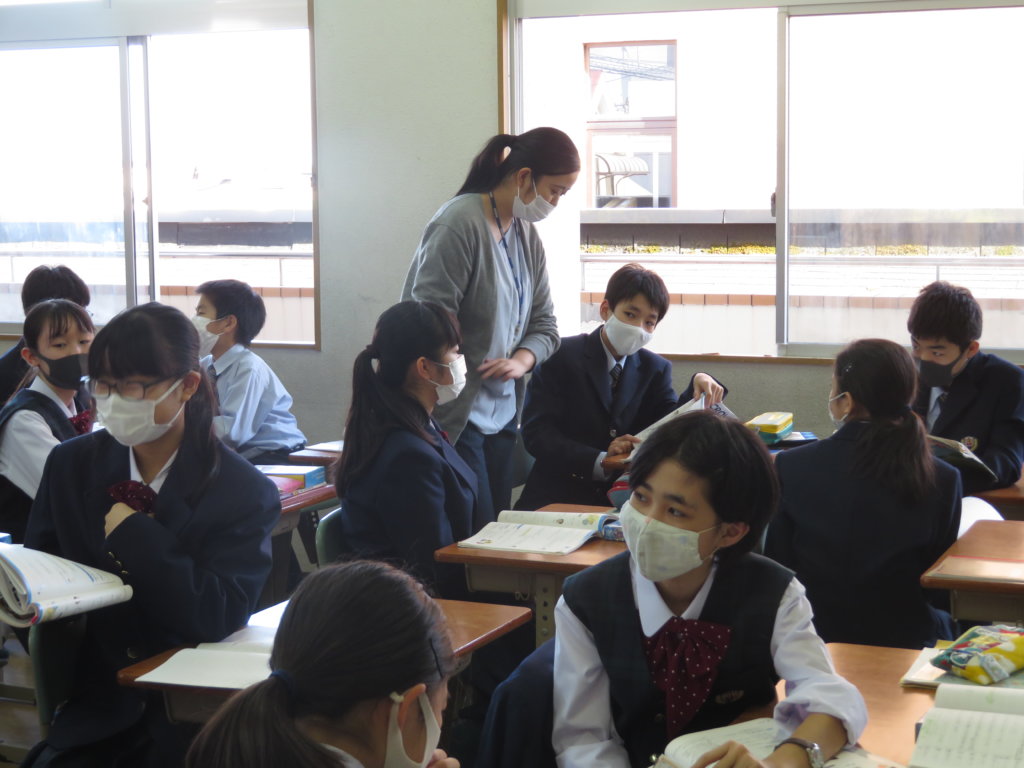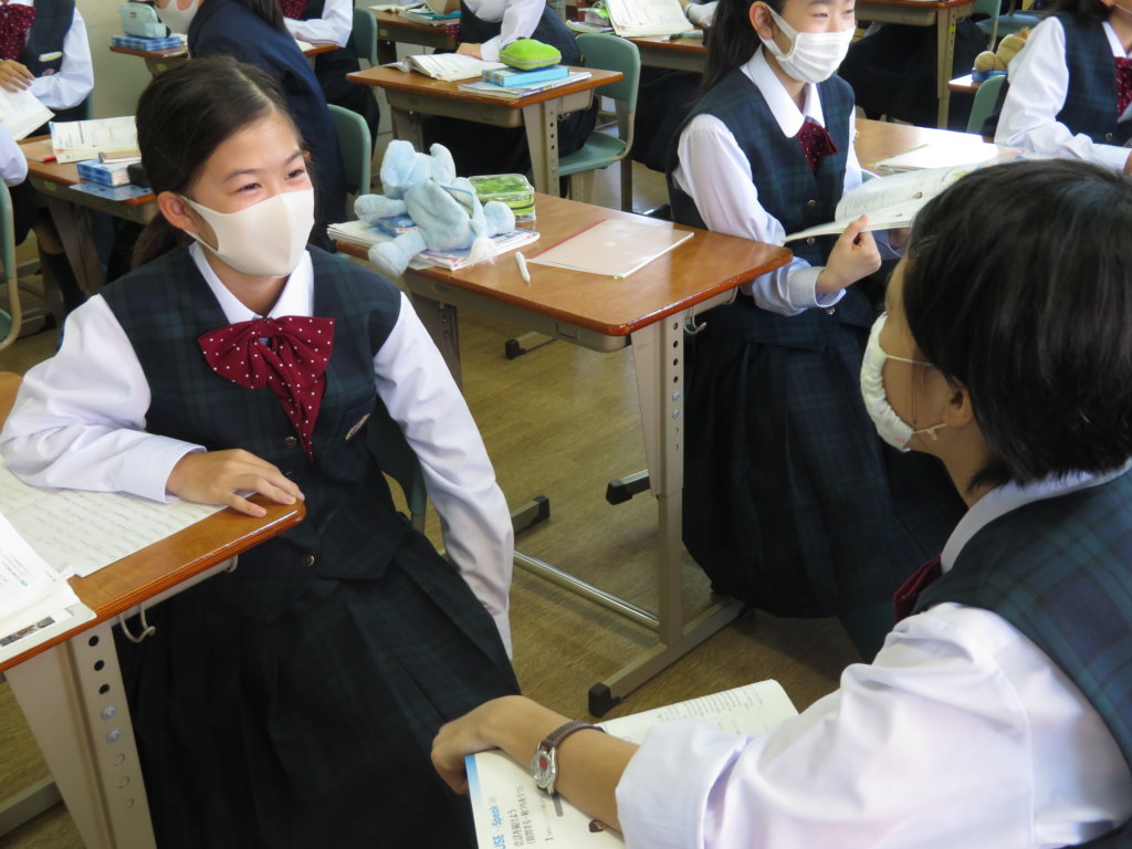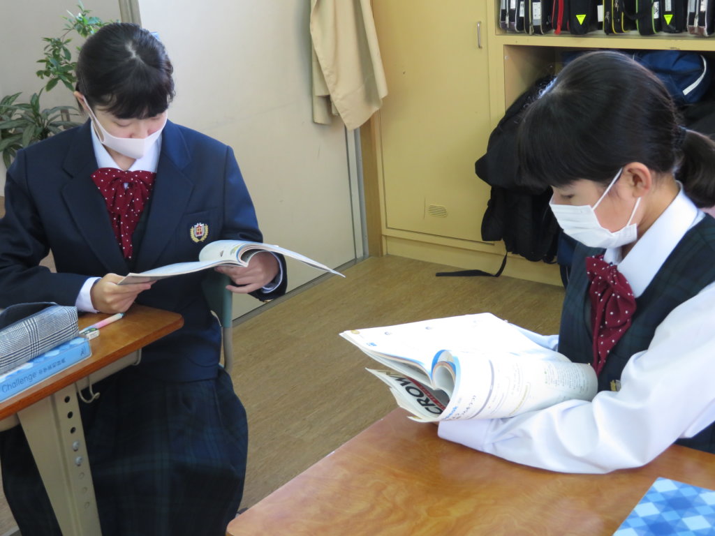 1年生の英語の授業ではペアになって会話の練習をながら学習内容の定着を図っています。