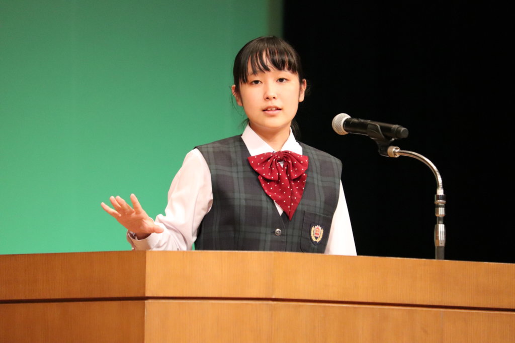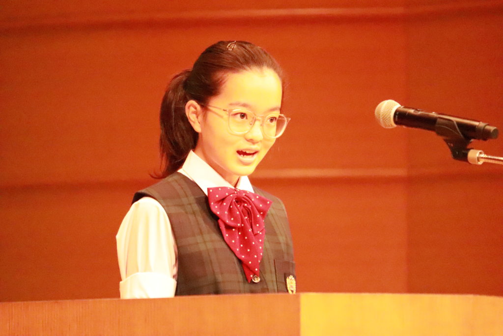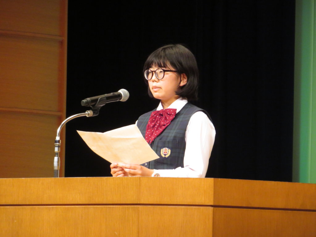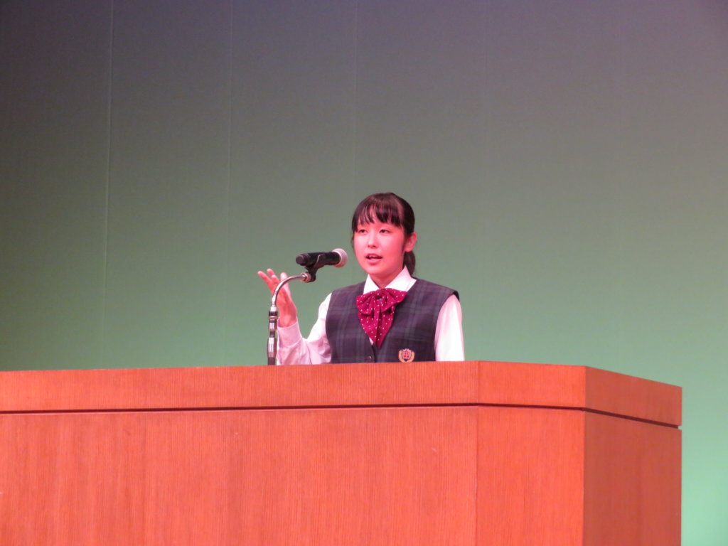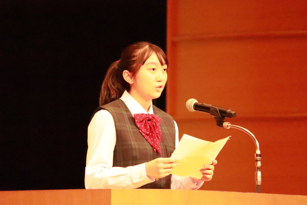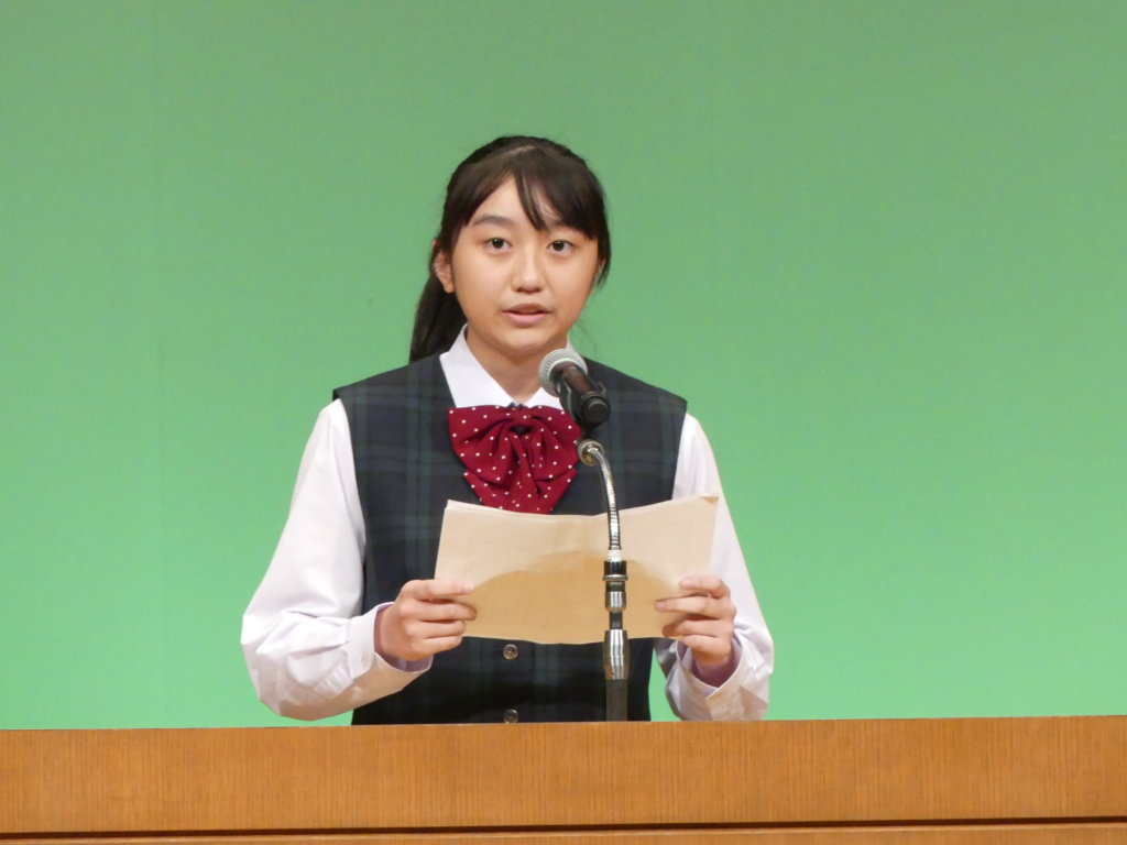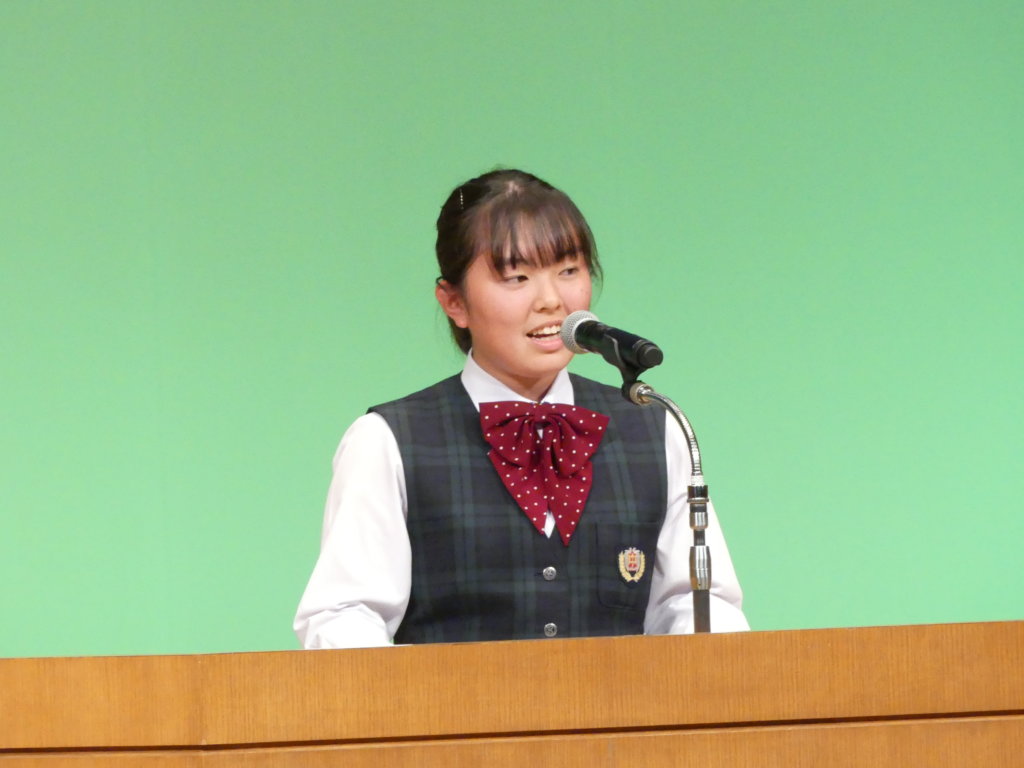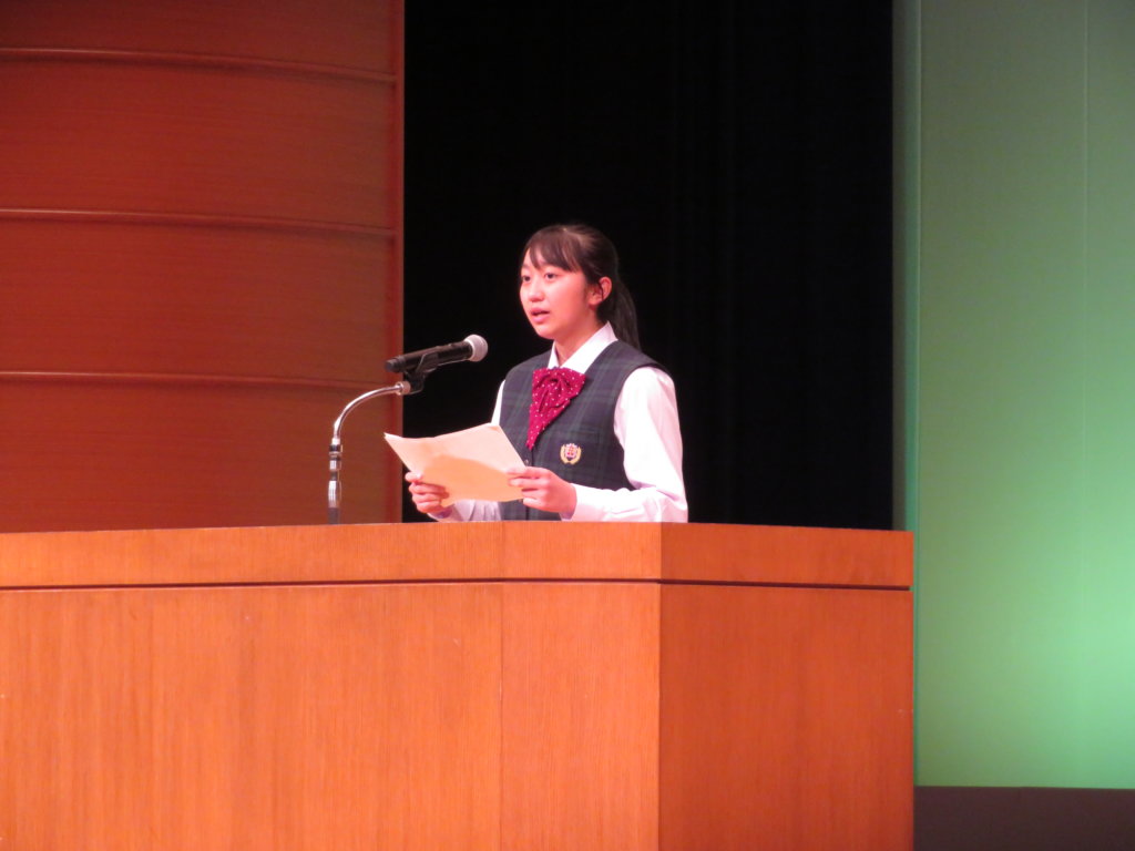 生徒を代表してお礼の言葉をJ2A 青山茉加さん(江南小出身)が行い、