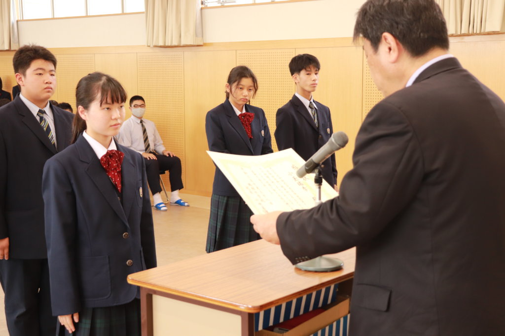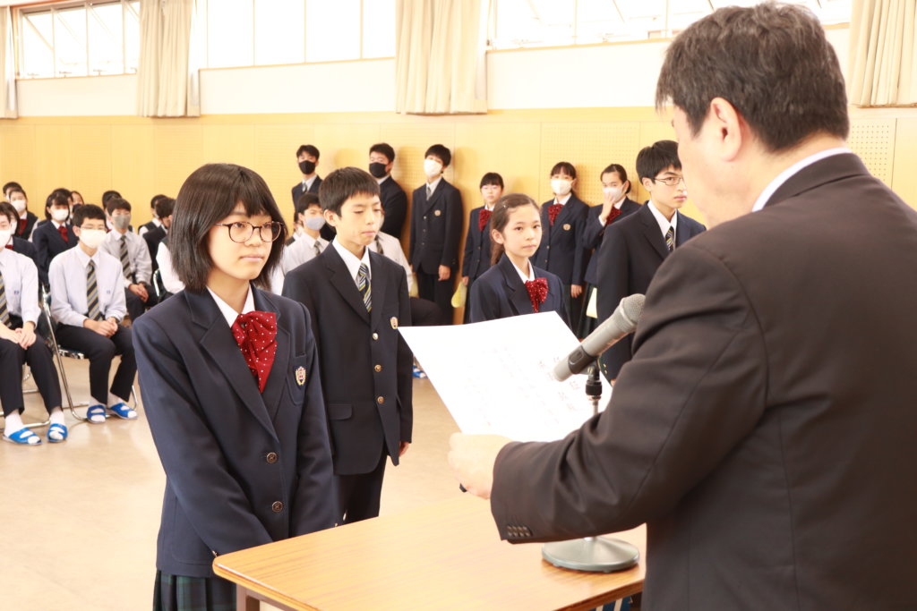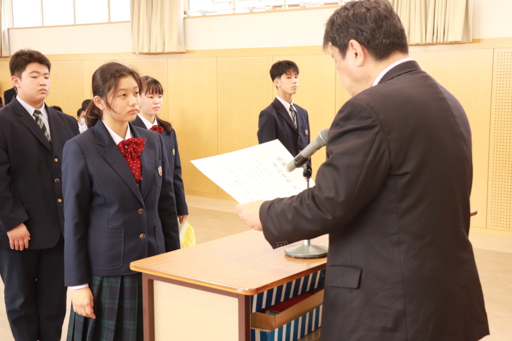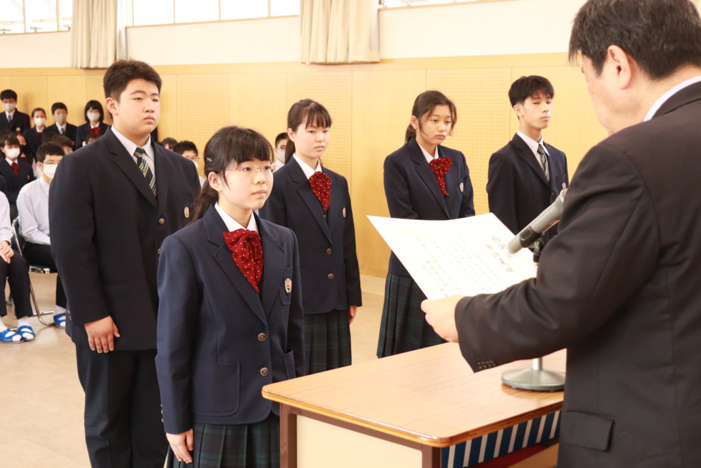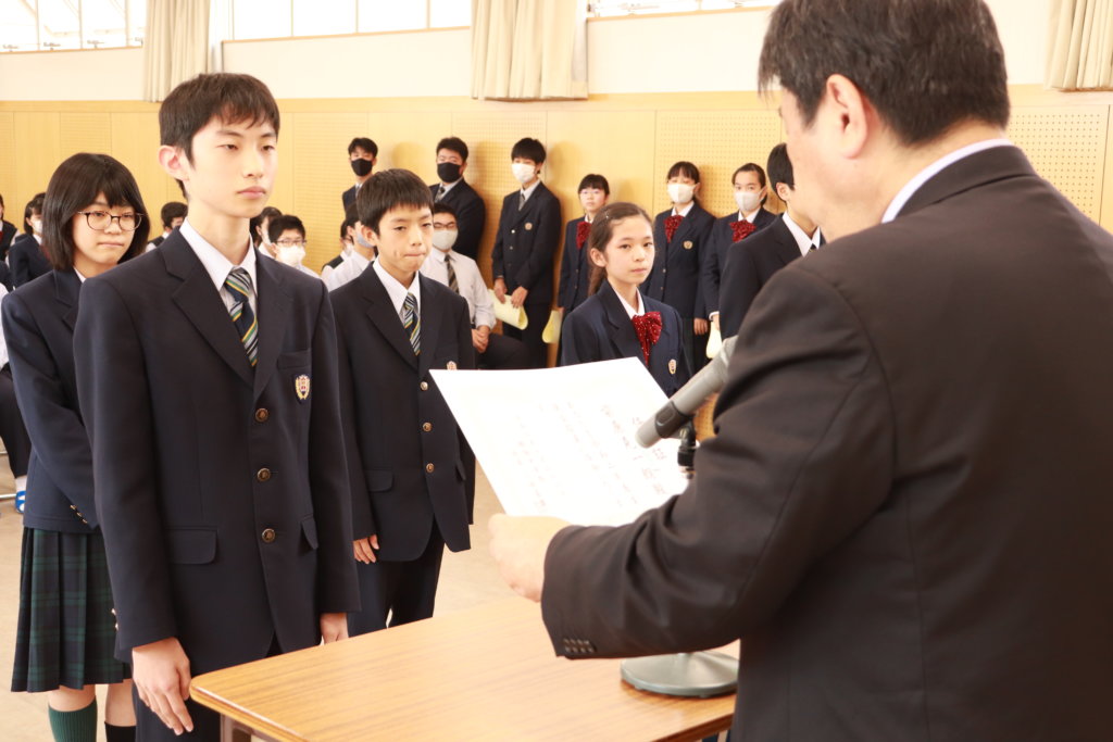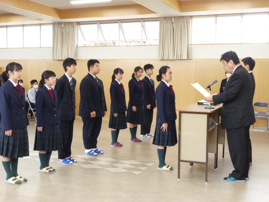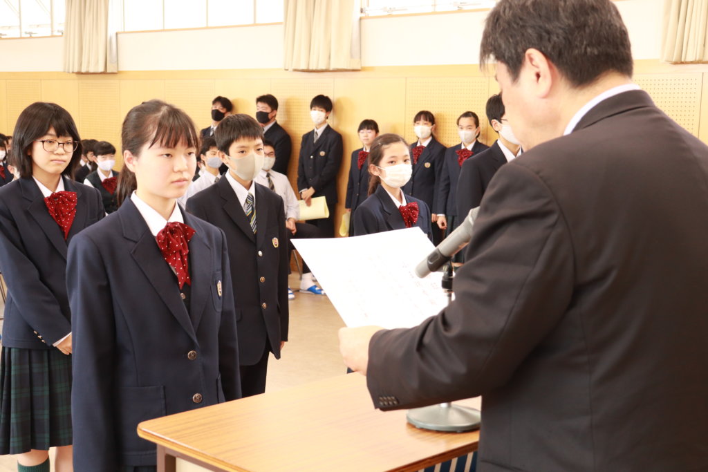 本日、生徒会辞令交付式が行われました。先日行われた生徒会役員演説会の結果を受け、新しい生徒会役員が決定しました。1年間学校のために頑張ってくれた旧役員への感謝状授与と、新役員への任命状授与が行われ、新しい鵬翔中学校がスタートしました!
