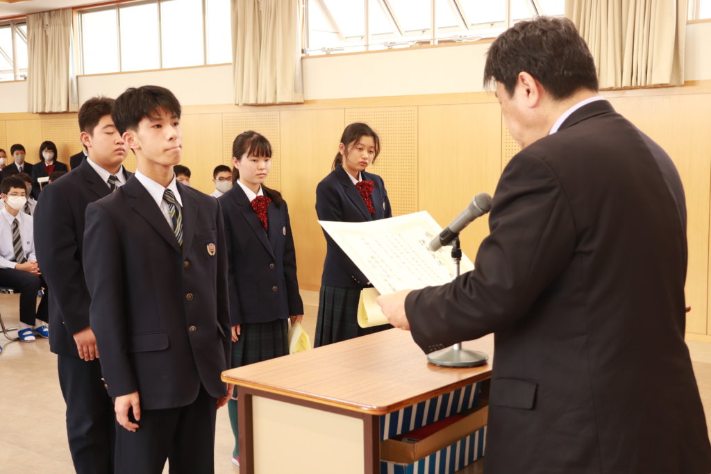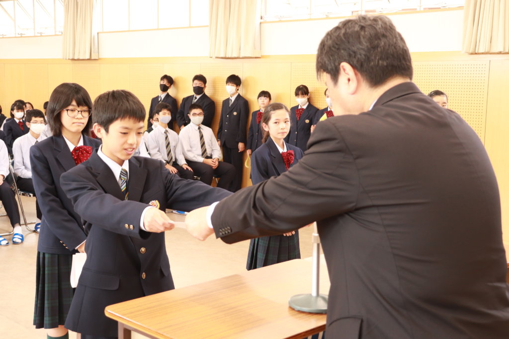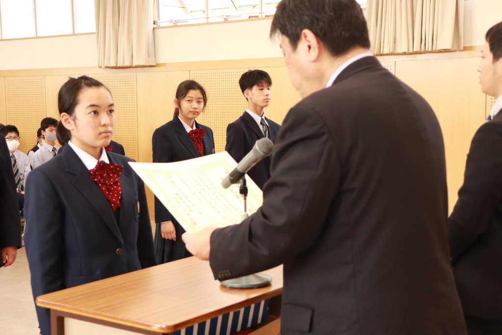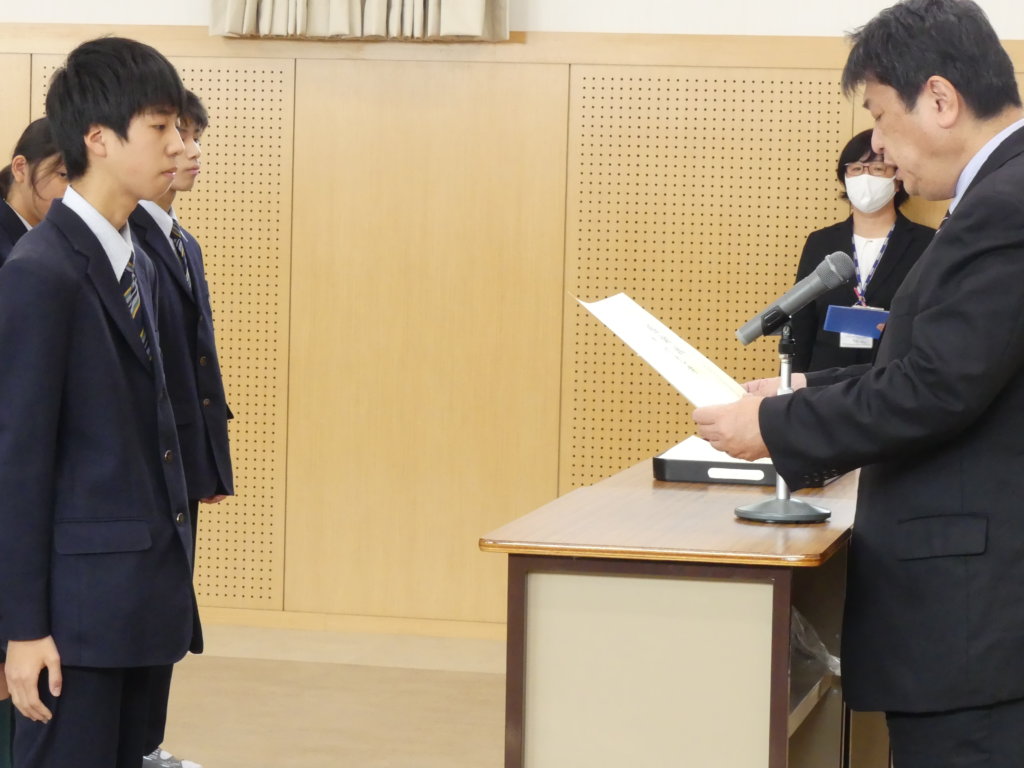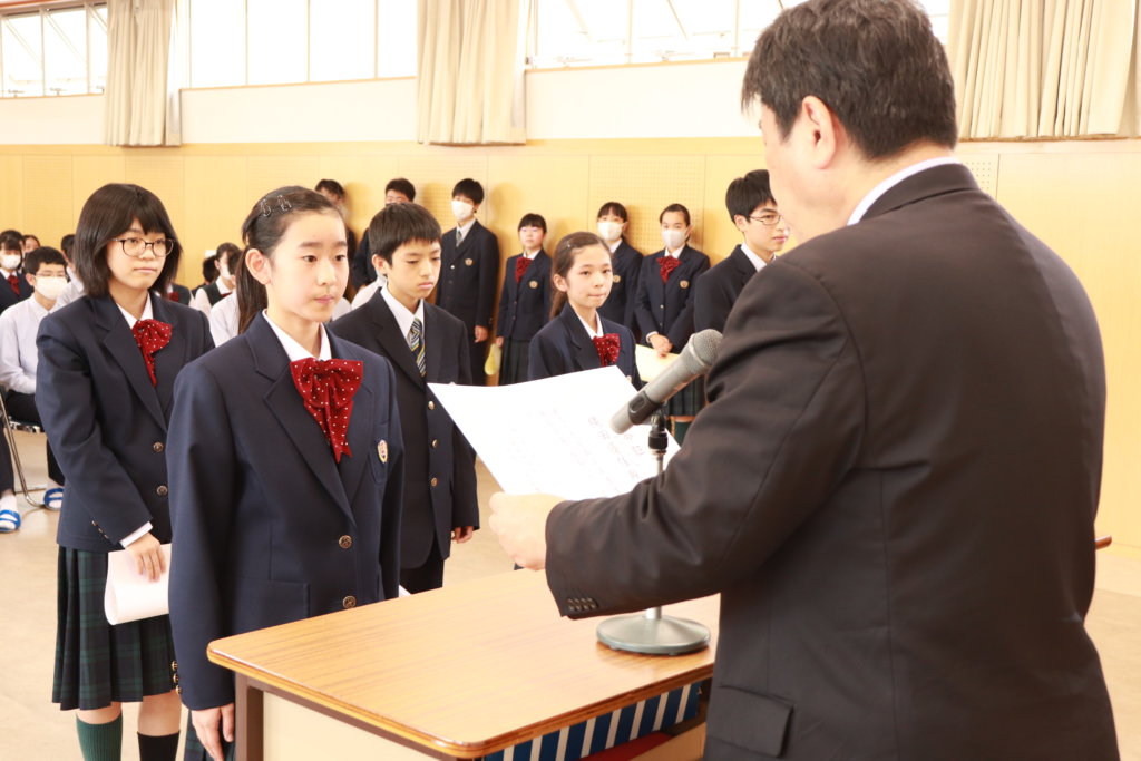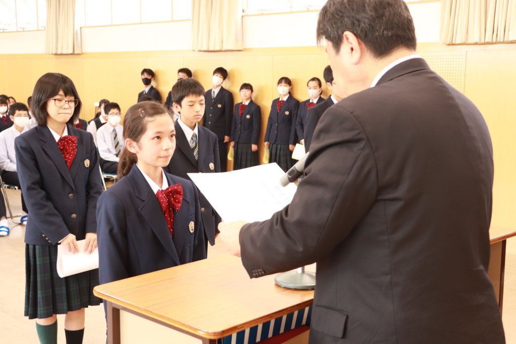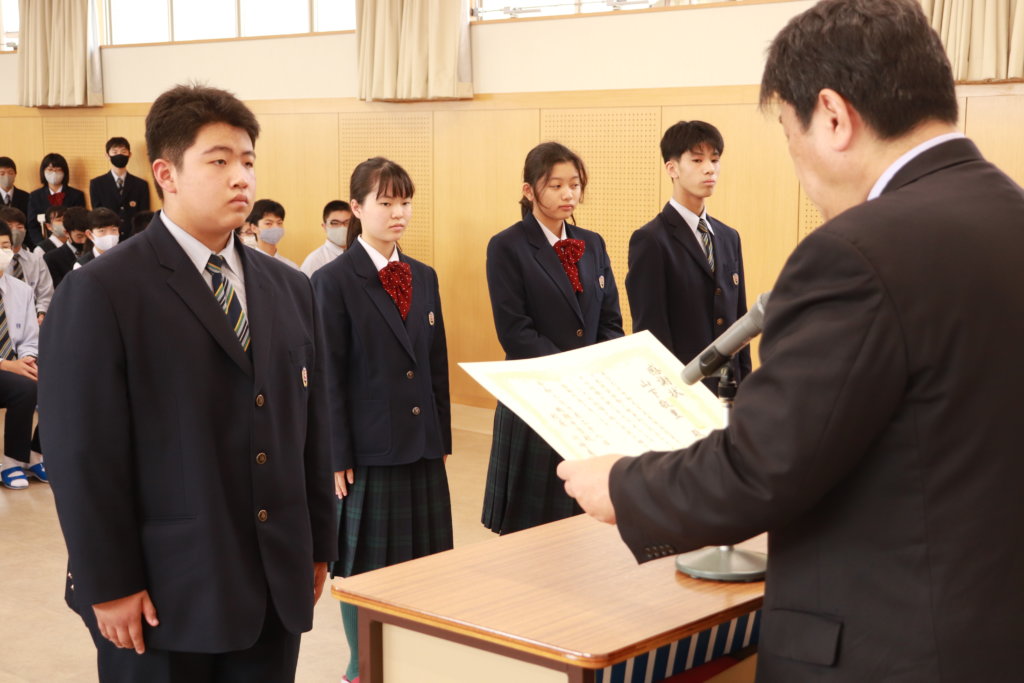 本日、生徒会辞令交付式が行われました。先日行われた生徒会役員演説会の結果を受け、新しい生徒会役員が決定しました。1年間学校のために頑張ってくれた旧役員への感謝状授与と、新役員への任命状授与が行われ、新しい鵬翔中学校がスタートしました!