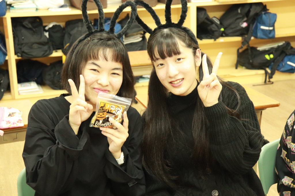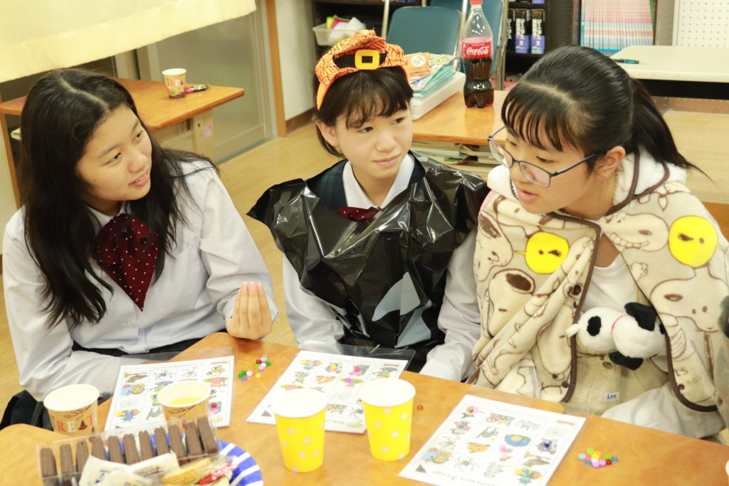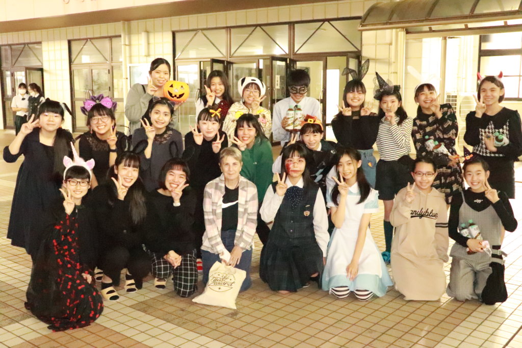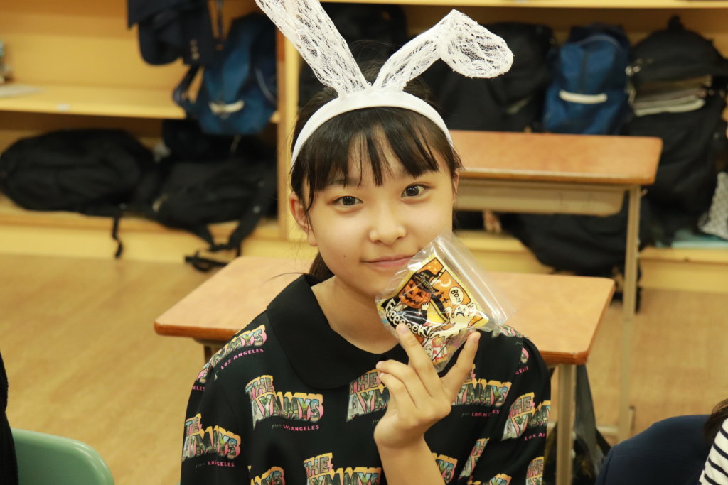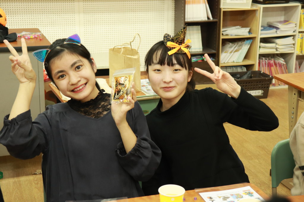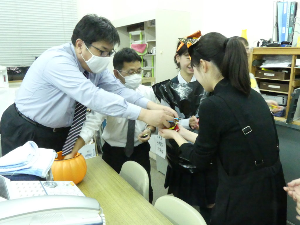 2階職員室を訪れたESS部の部員たちは吉田成哉教頭先生、安田英人先生にTrick or Treat!!と言ってキャンディなどをもらいました。とっても嬉しそうでした!