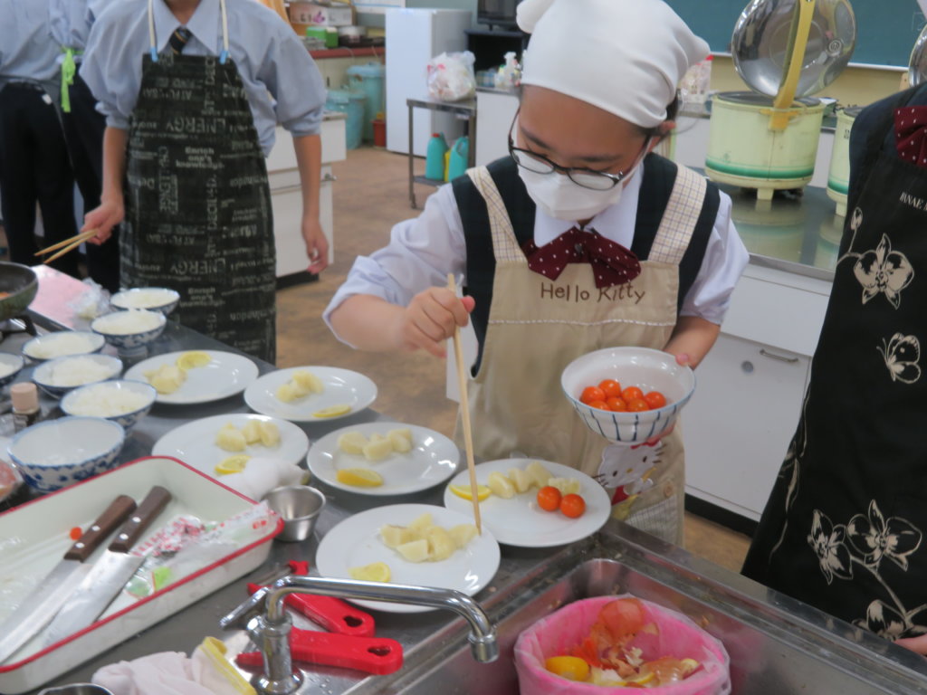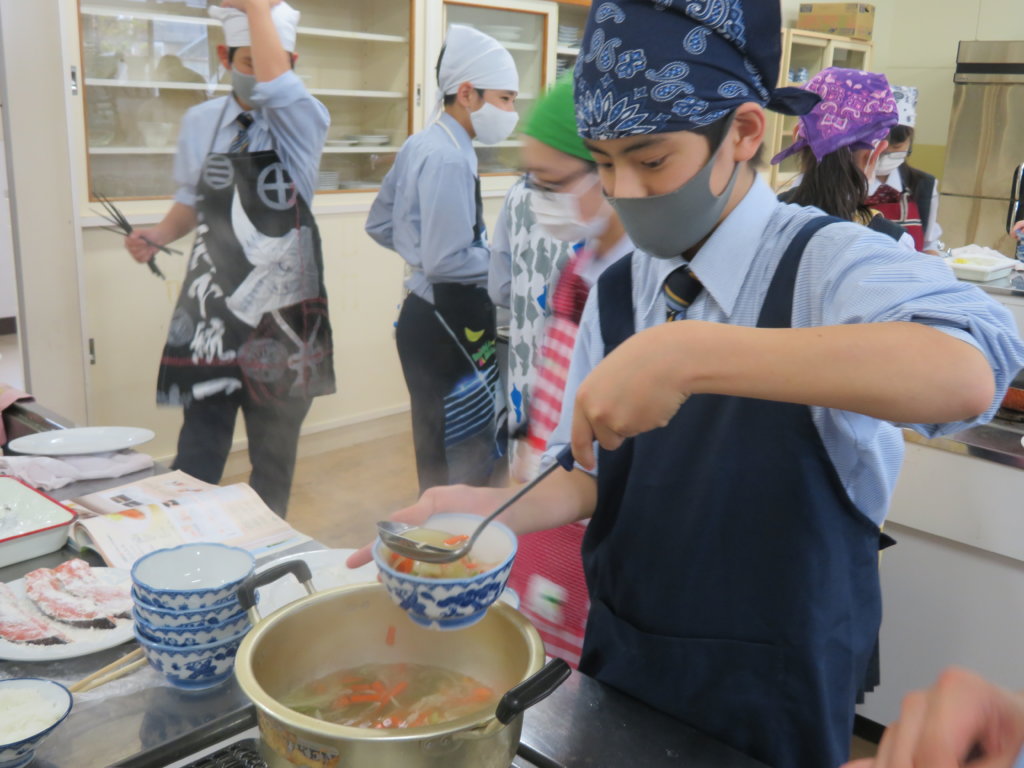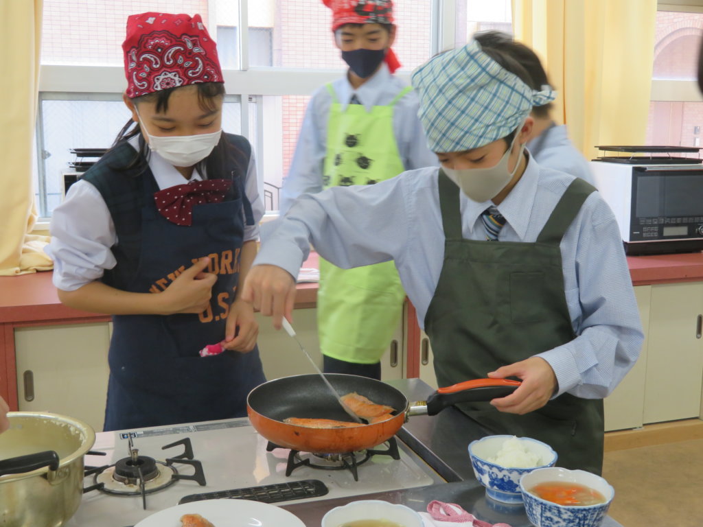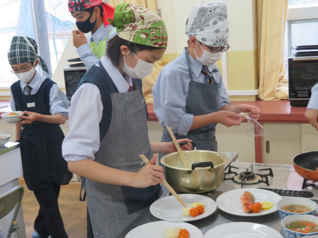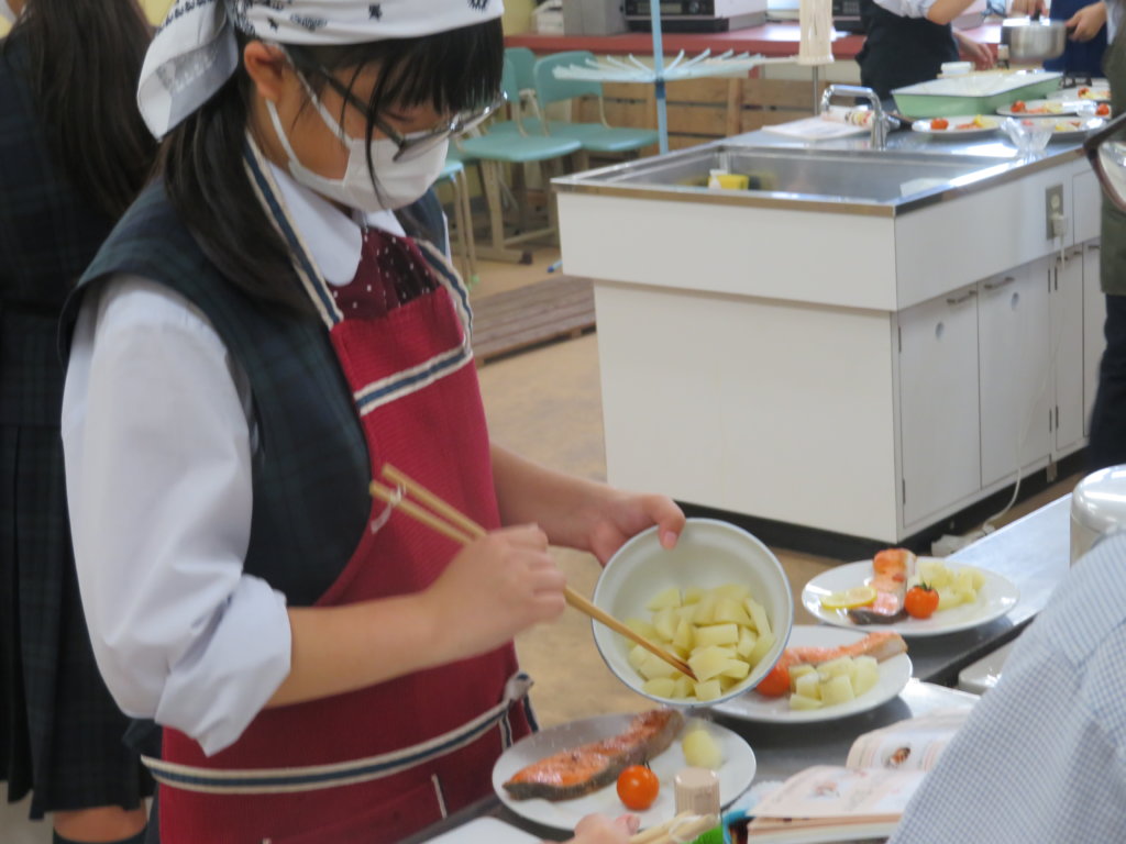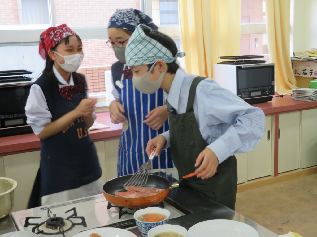 本日、J1Aの調理実習が行われました。メニューは「鮭のムニエル・こふき芋・スープ」でした。