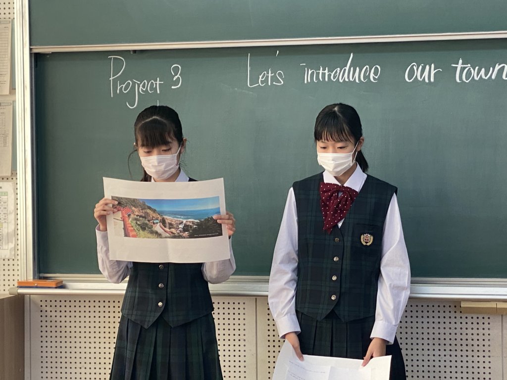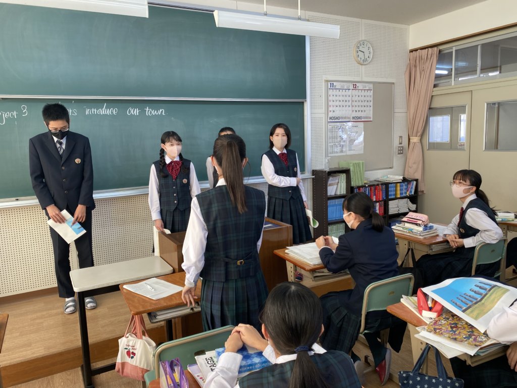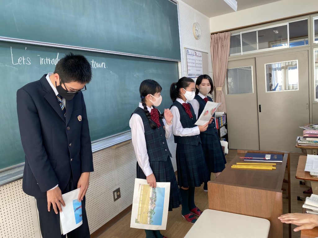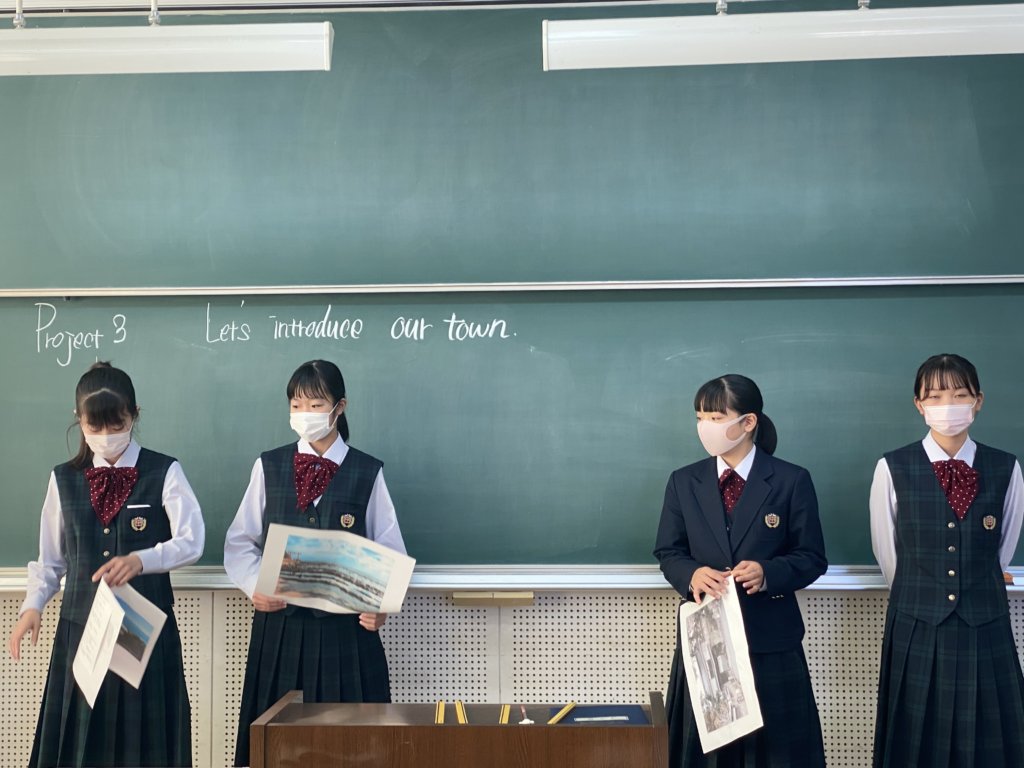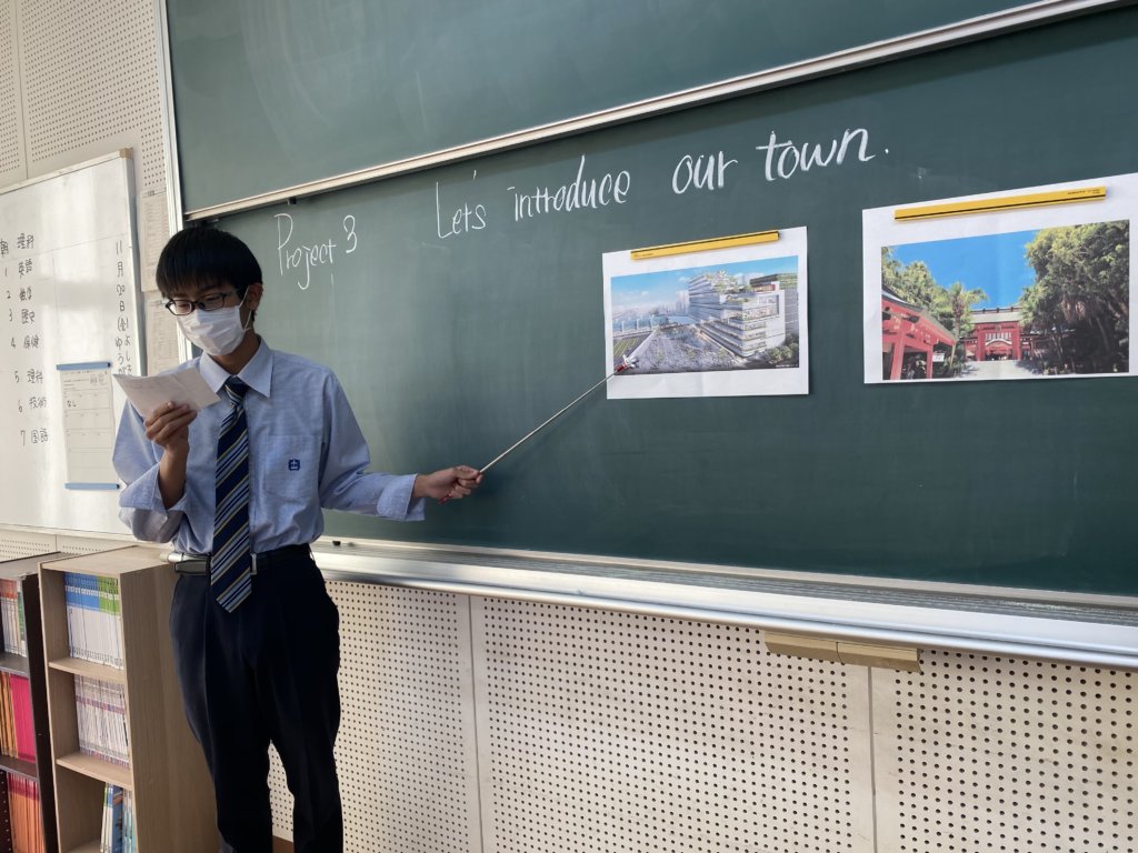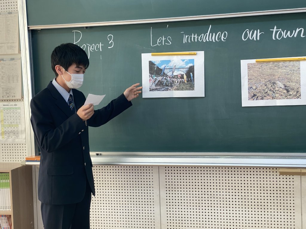 J2英語で「自分の町を紹介しよう」というテーマでプレゼンテーションを行いました。