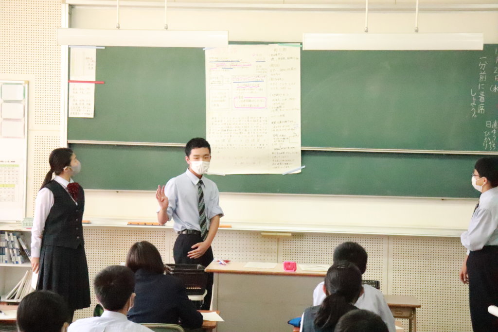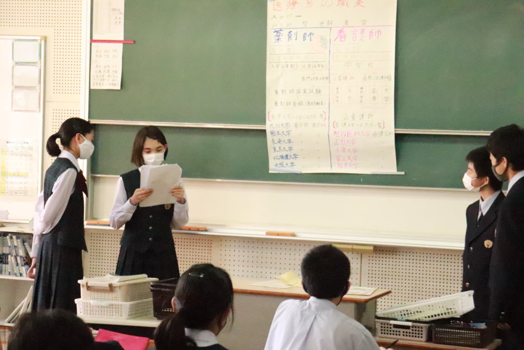 今日の4限目、J1ーB教室をのぞいてみると、大学の学部・学科、職業調べの発表が行われていました。
