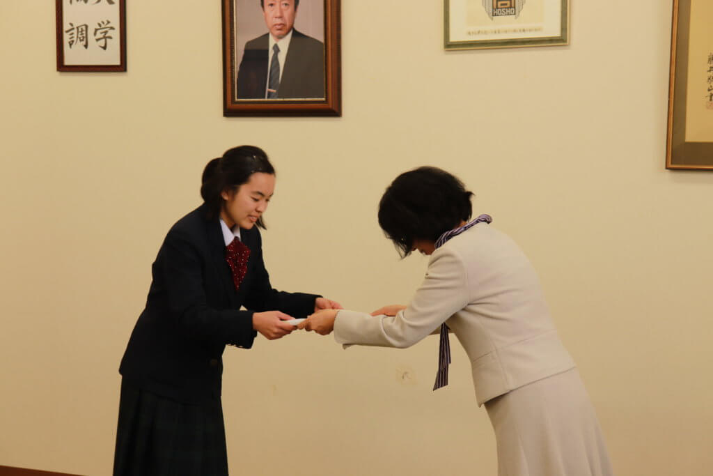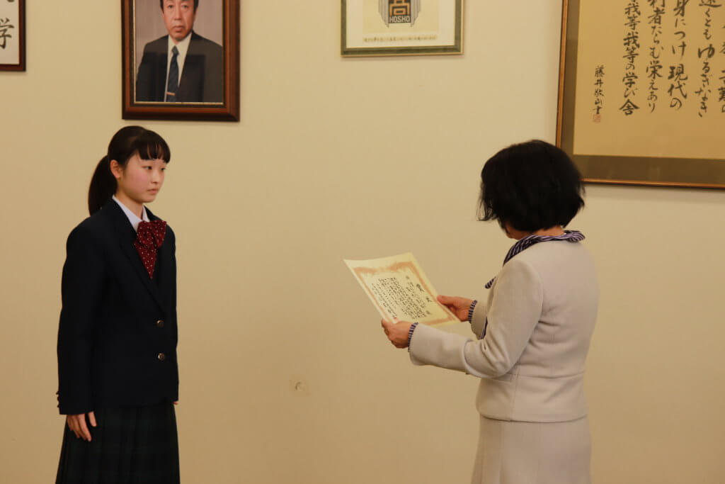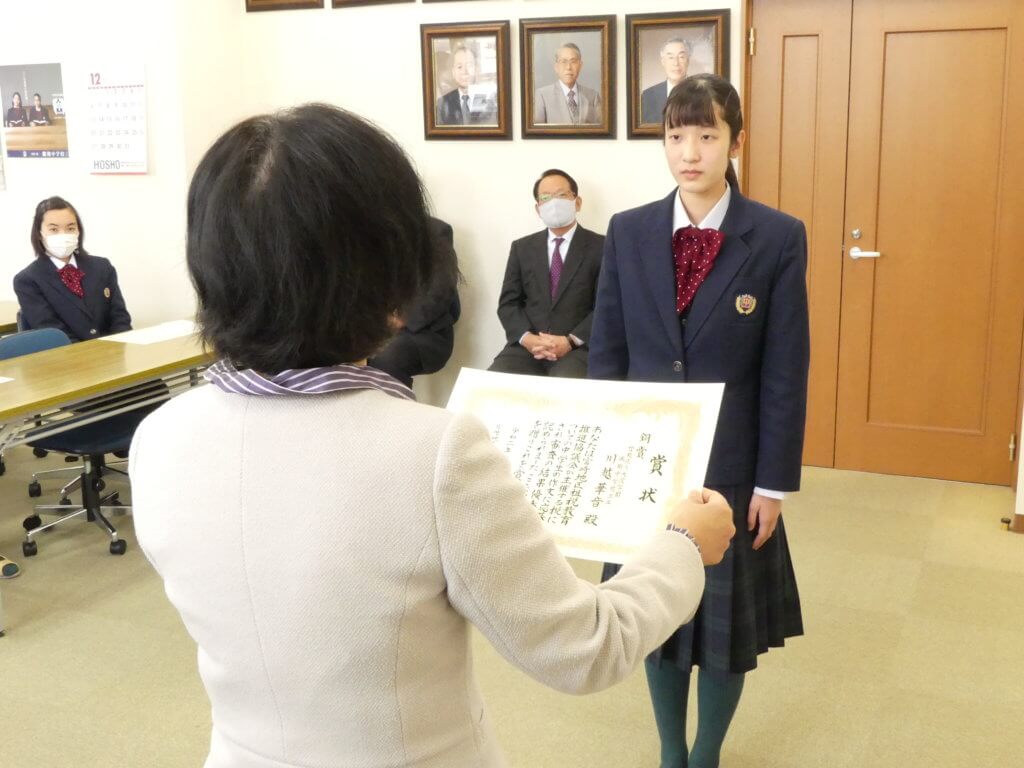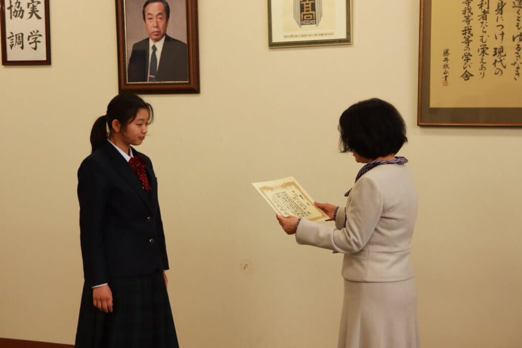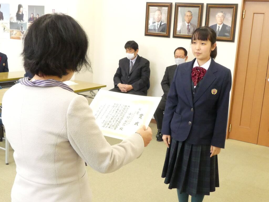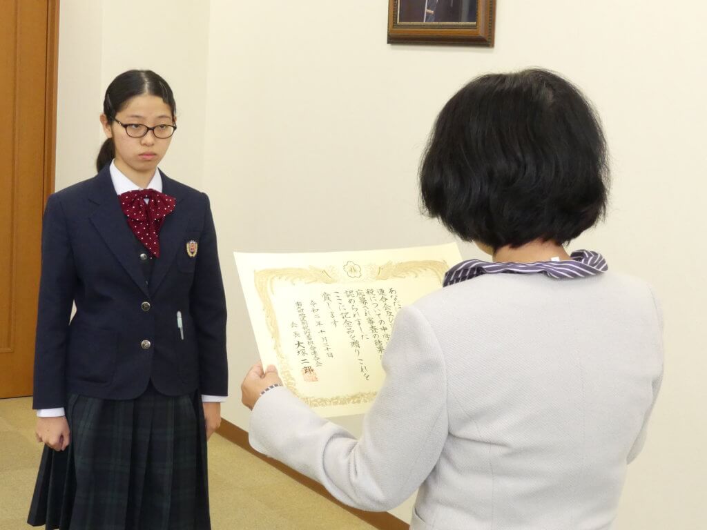 昨日、「税についての作文」の表彰式が行われました。本校では、毎年租税教室を実施しています。また、夏休みの課題として税についての作文や標語を全校生徒で書き、応募しています。今回は、税についての作文の入賞者に表彰が行われました。