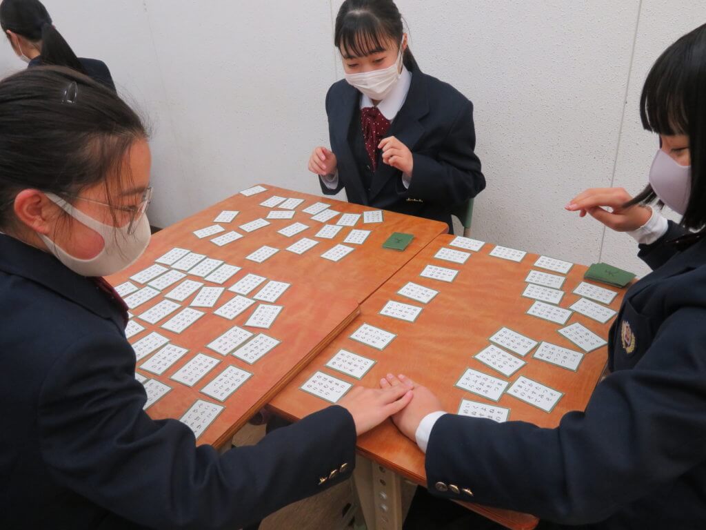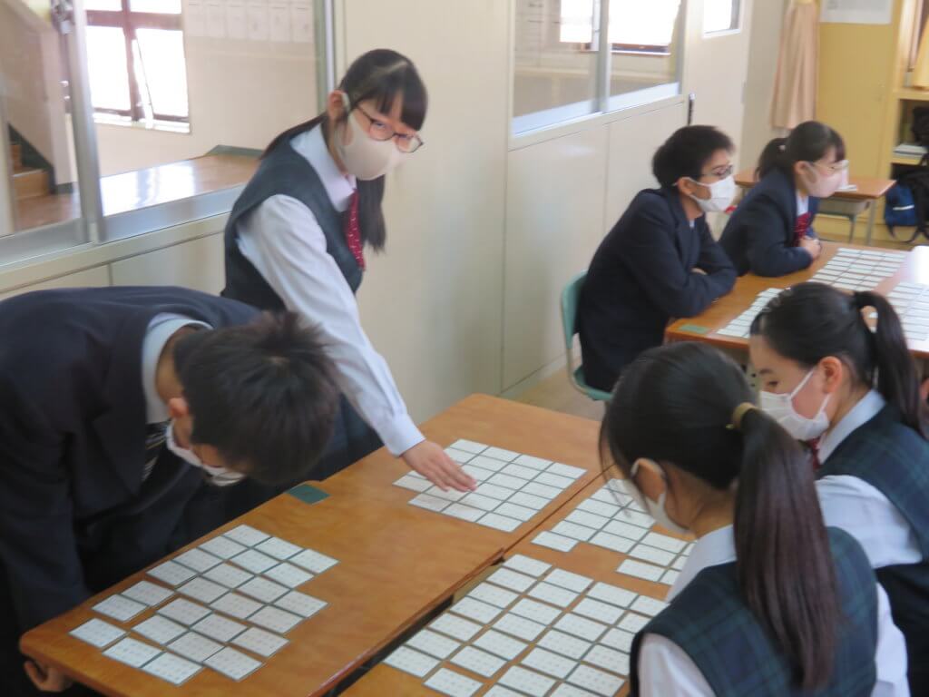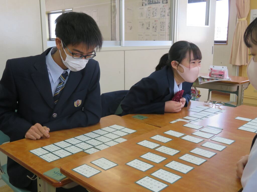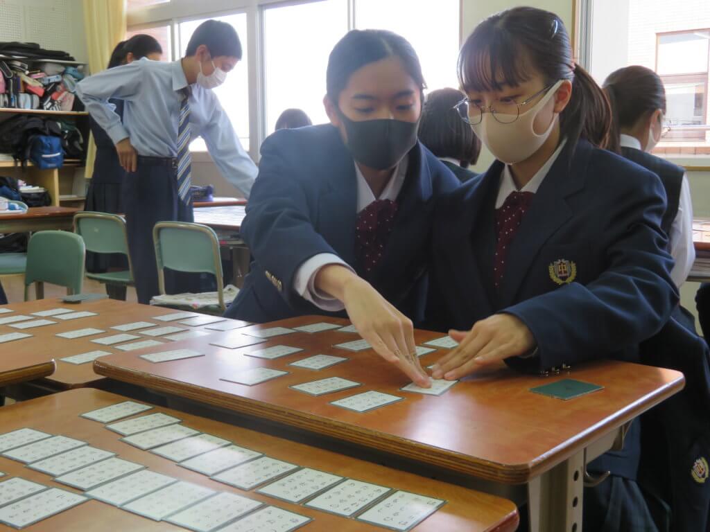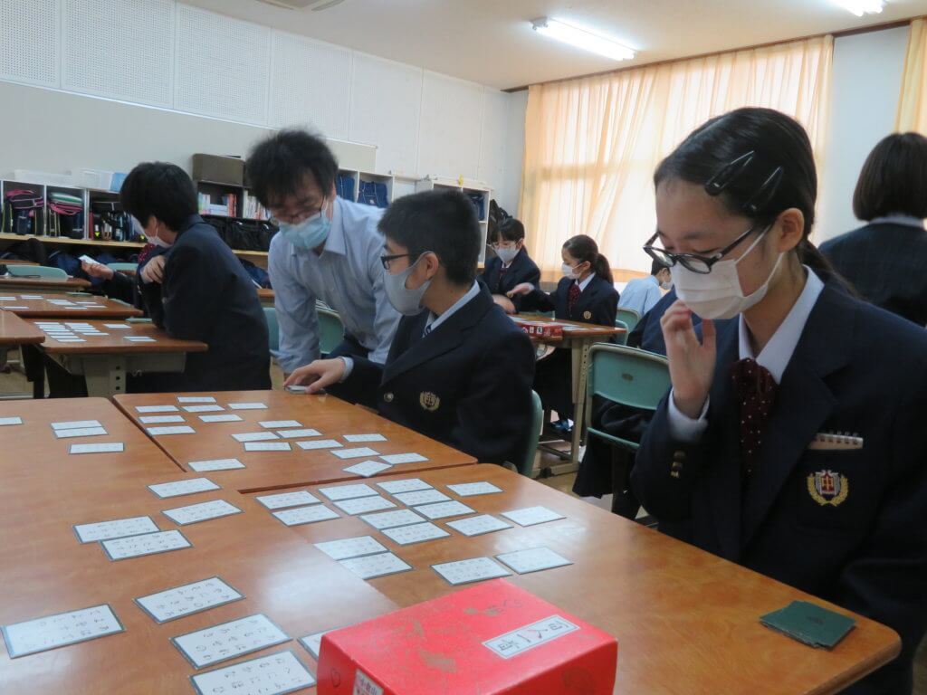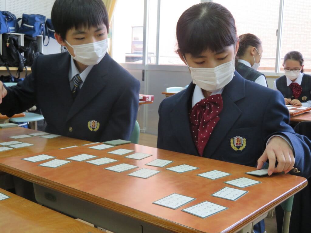 百人一首大会が1週間後に近づいてきました。J1・J2の国語の授業では百人一首の練習をしていました。初めは札を探すのに苦労していた1年生ですが、今では覚えた句も増えてきたようです。