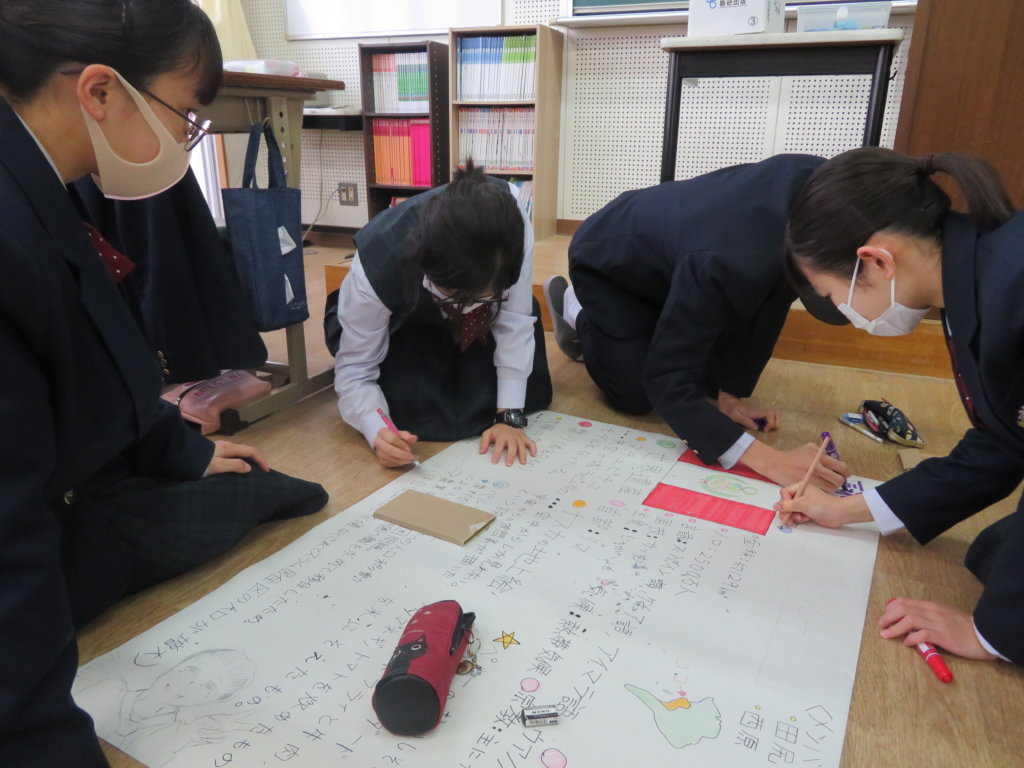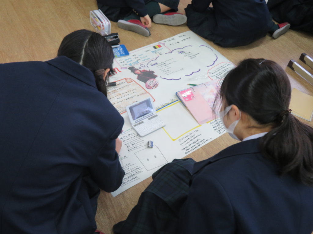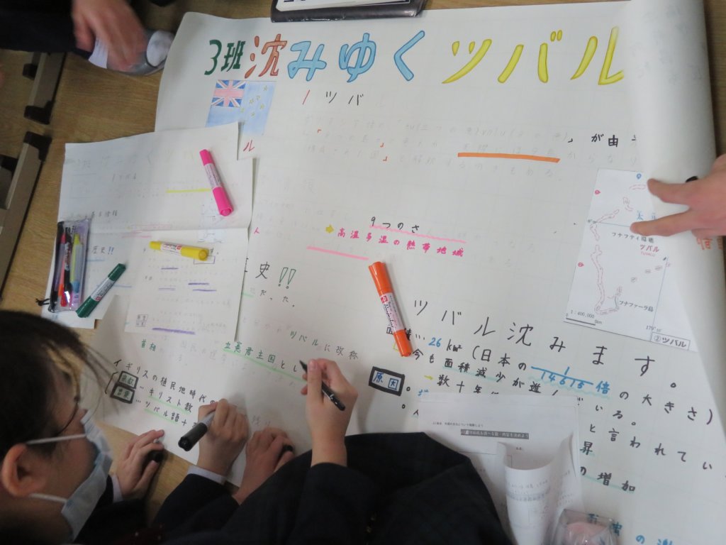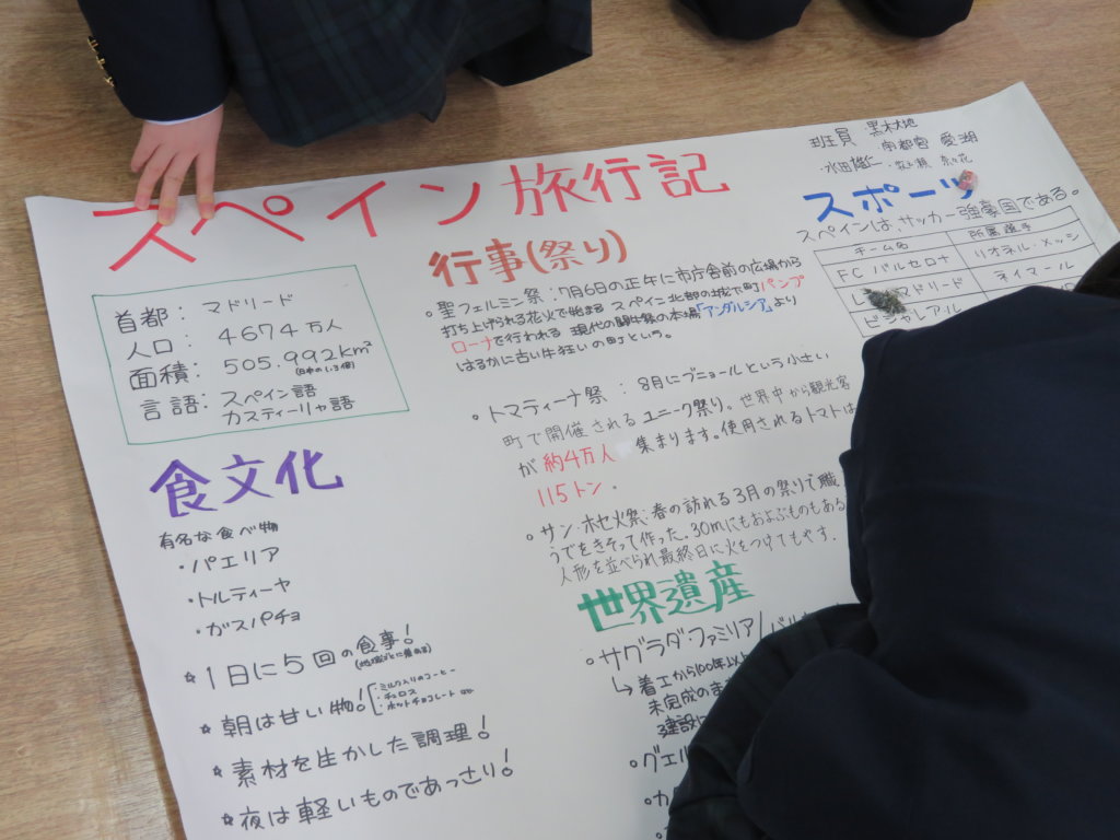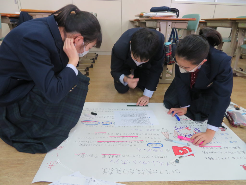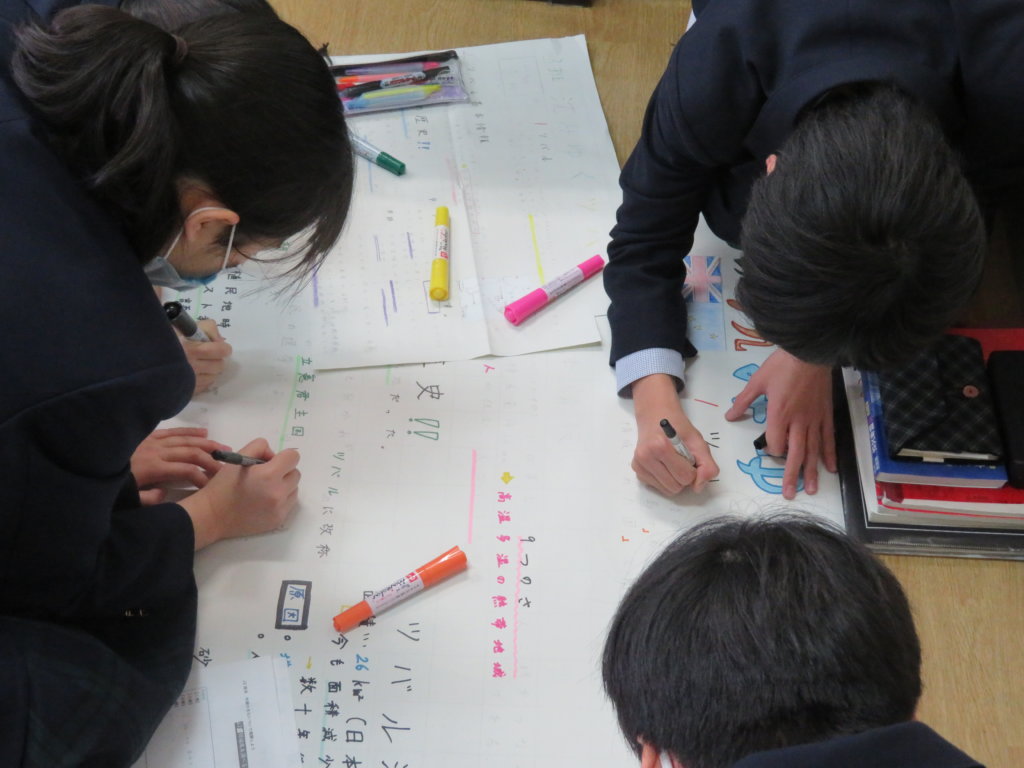 J2生は海外について調べ学習をしています。今日は調べたことを各班ごとに模造紙にまとめる作業を行っていました。完成したものを見るのが楽しみです!