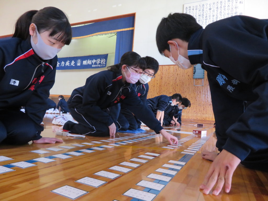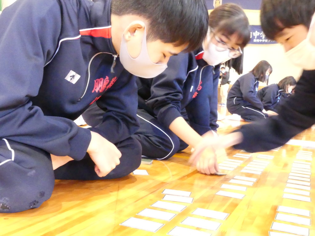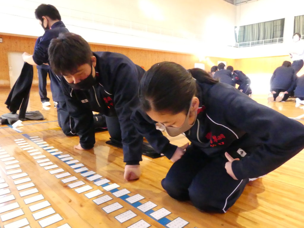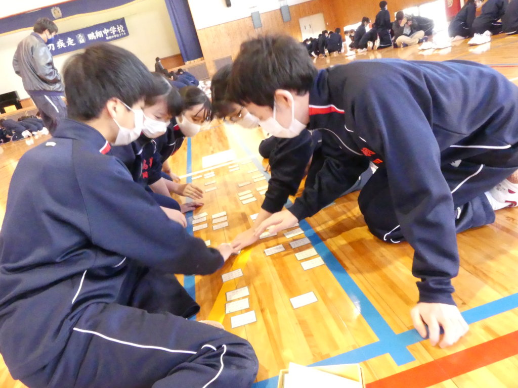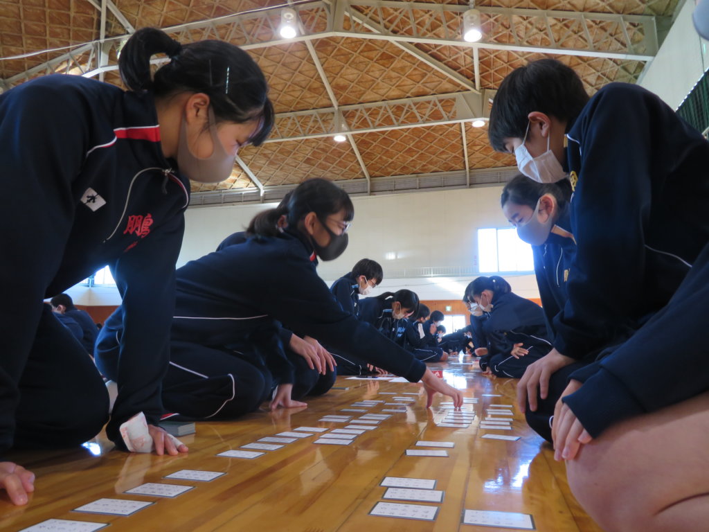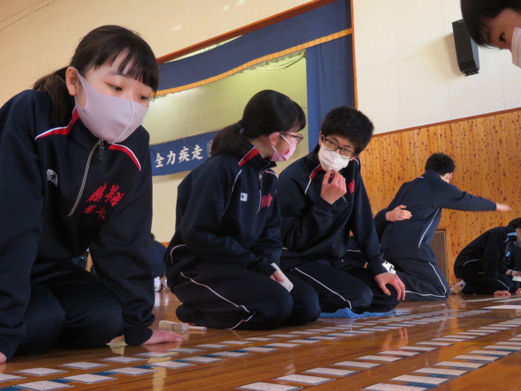 今日は百人一首大会の様子をお届けします。百人一首大会は、文化委員会を中心に準備しています。当日の司会や札並べも文化委員会が行いますす。当日の準備等は生徒会の皆さんにも協力してもらいました。