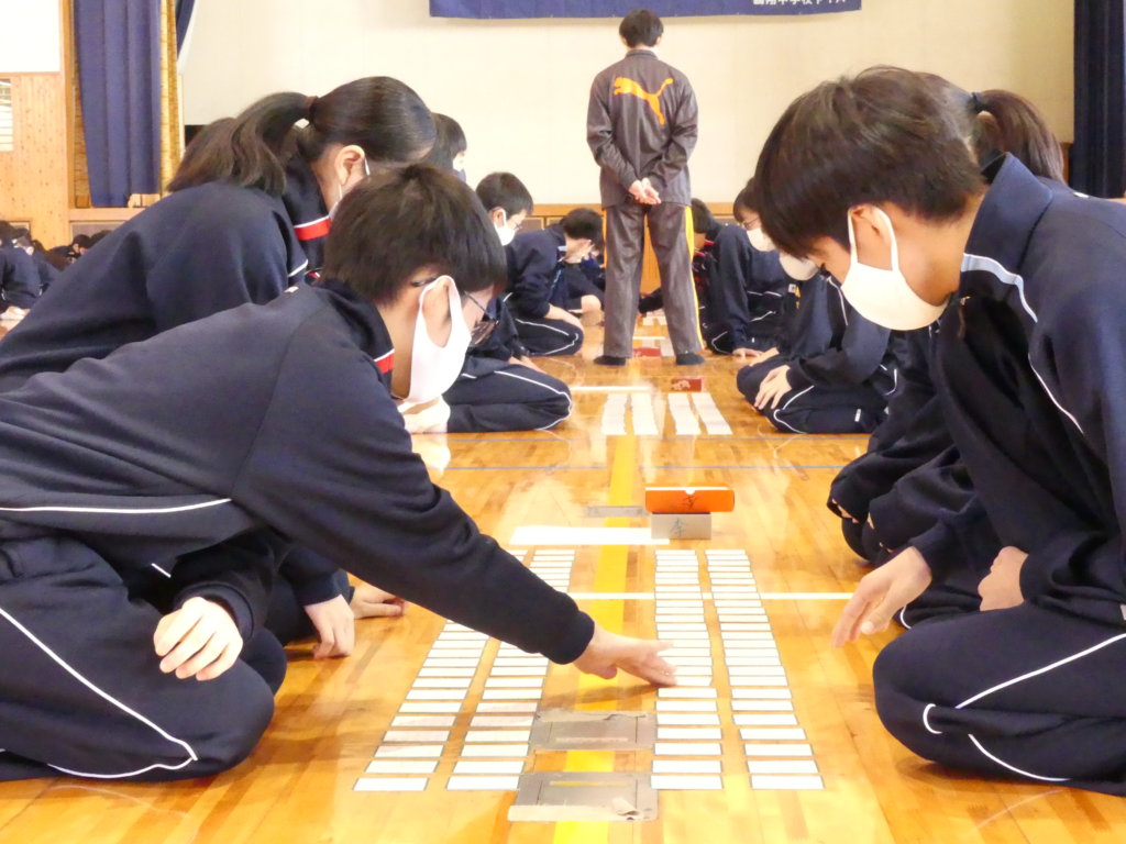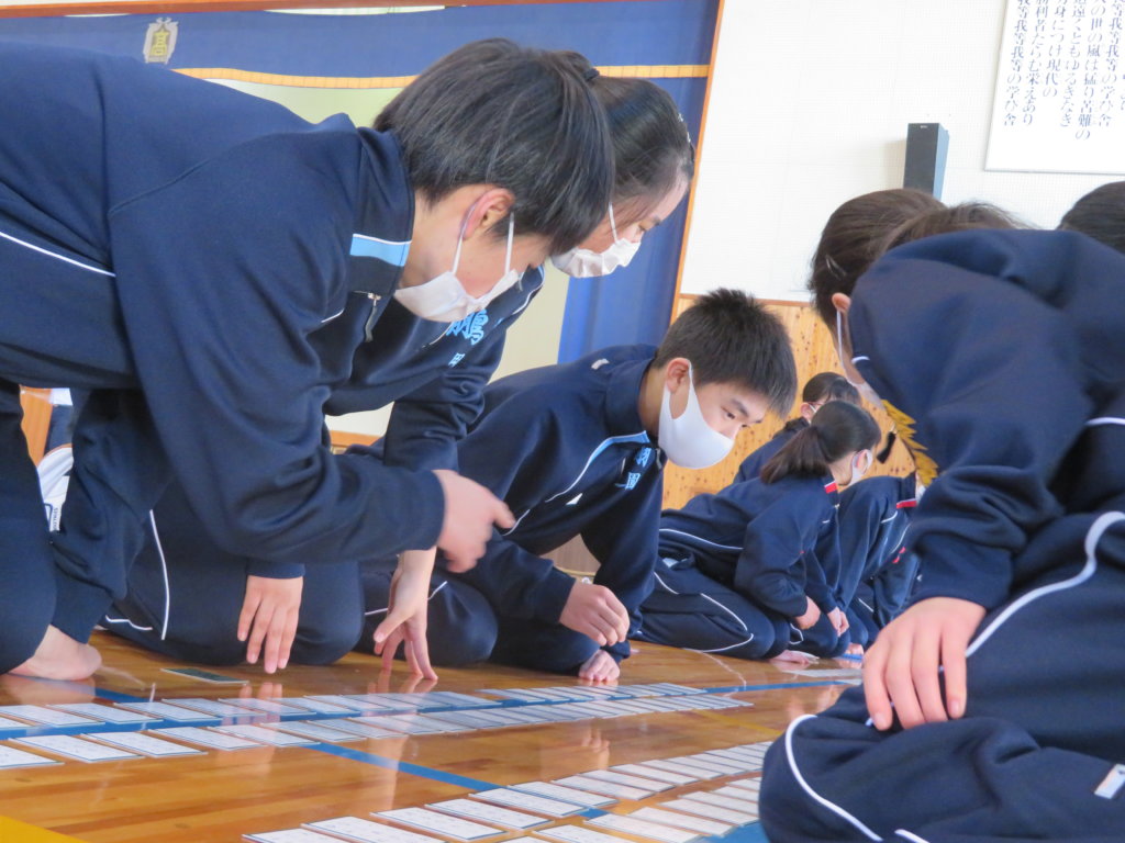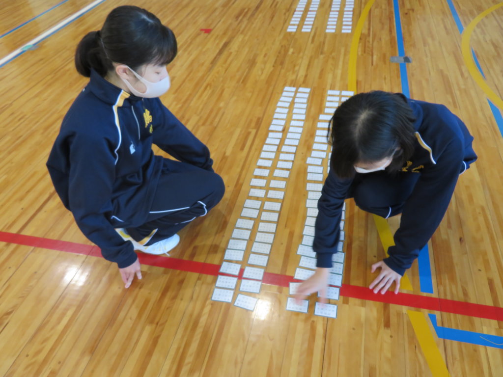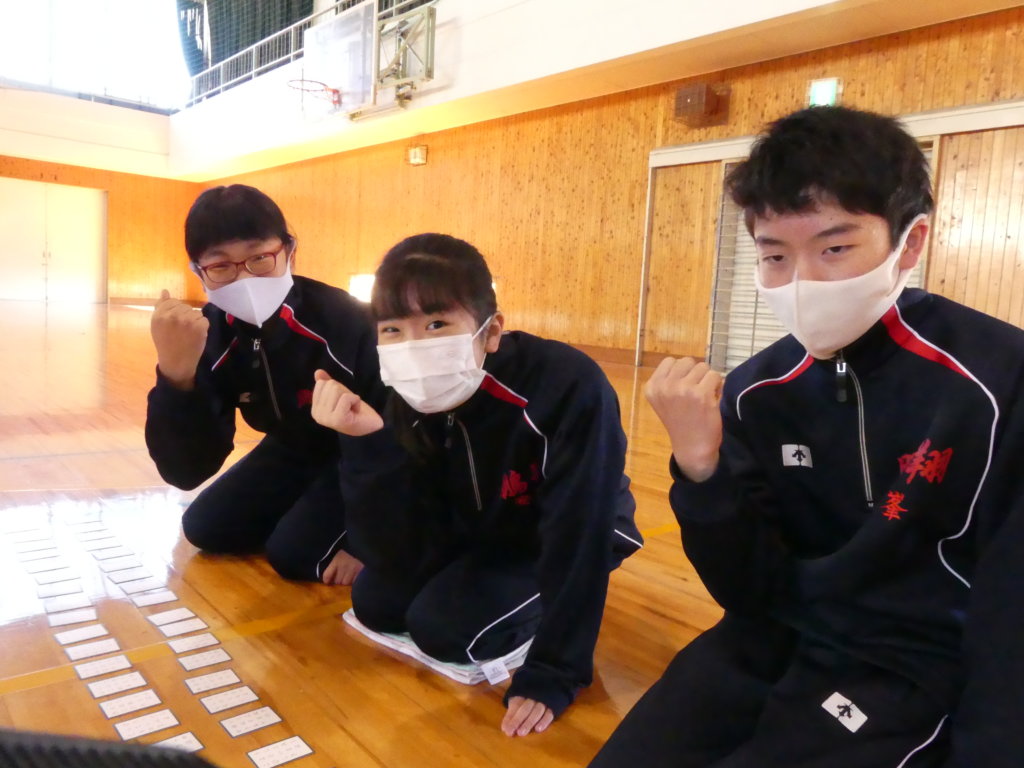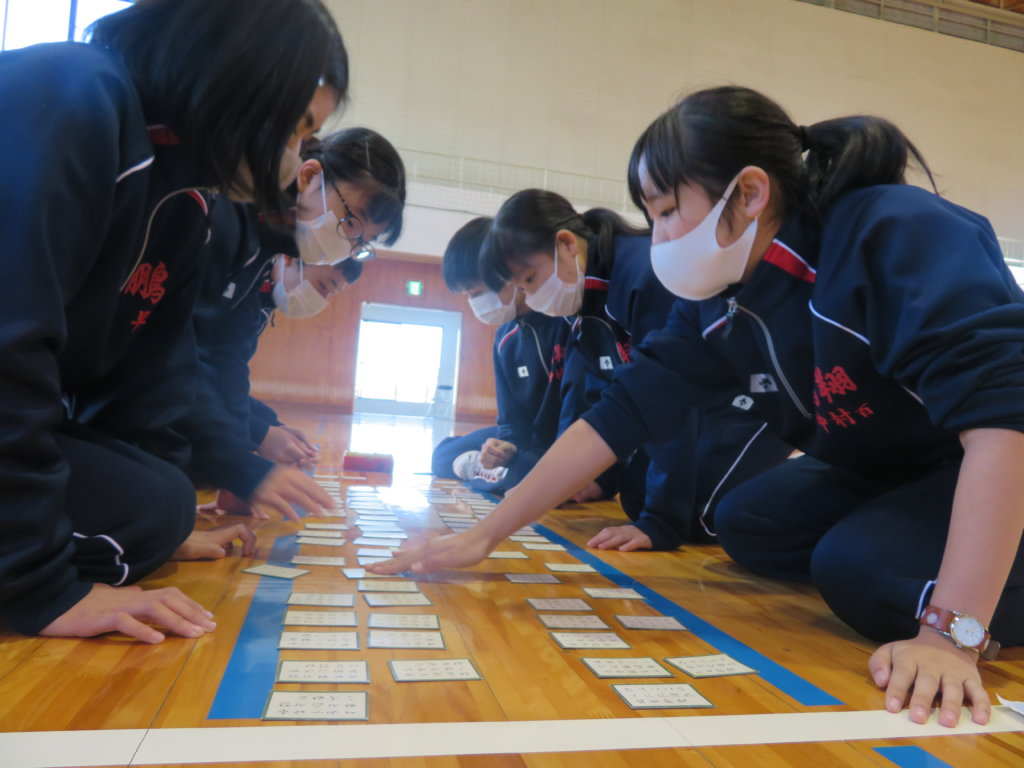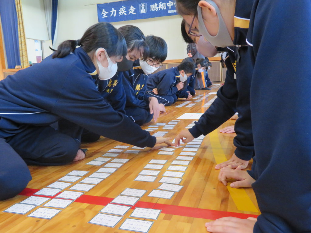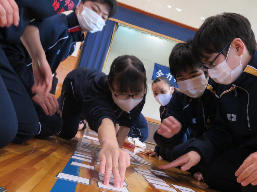 今日は百人一首大会の様子をお届けします。百人一首大会は、文化委員会を中心に準備しています。当日の司会や札並べも文化委員会が行いますす。当日の準備等は生徒会の皆さんにも協力してもらいました。